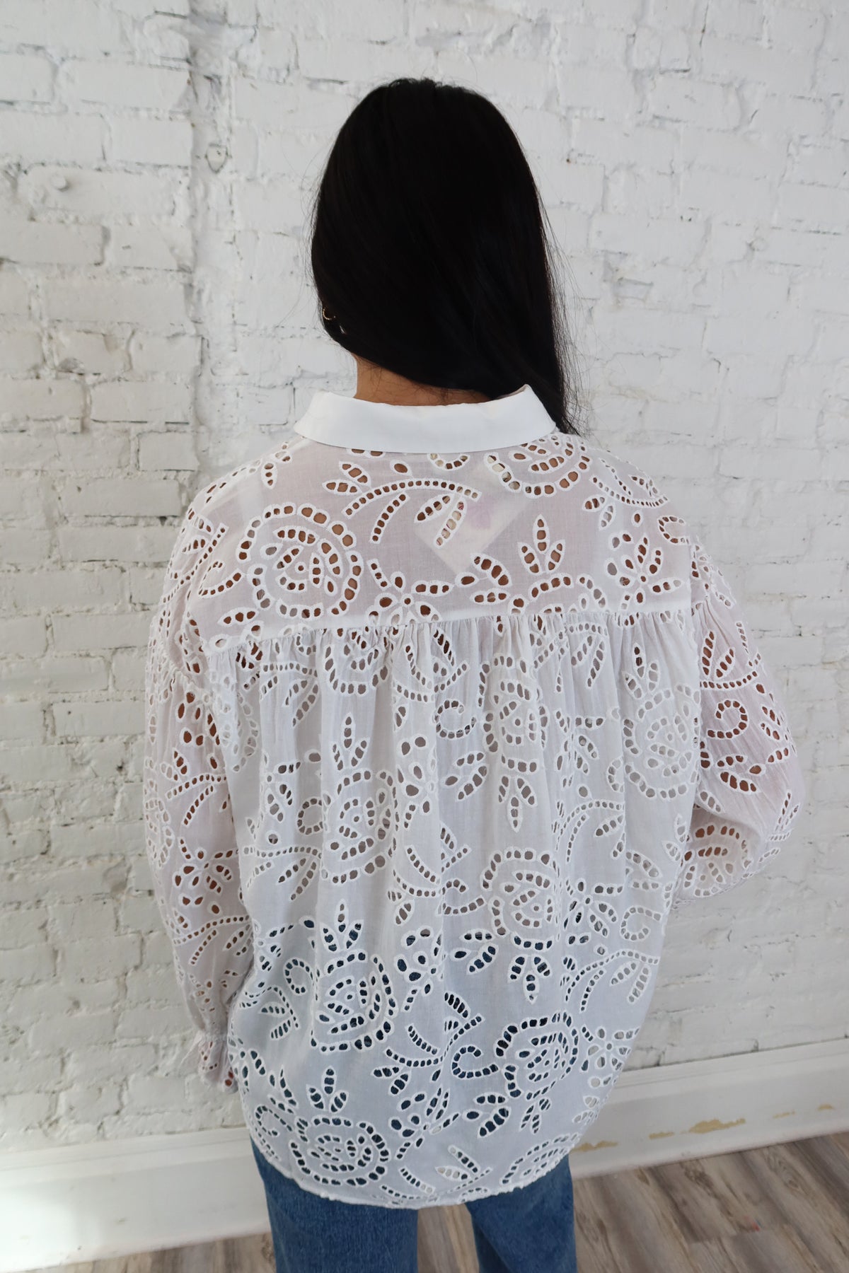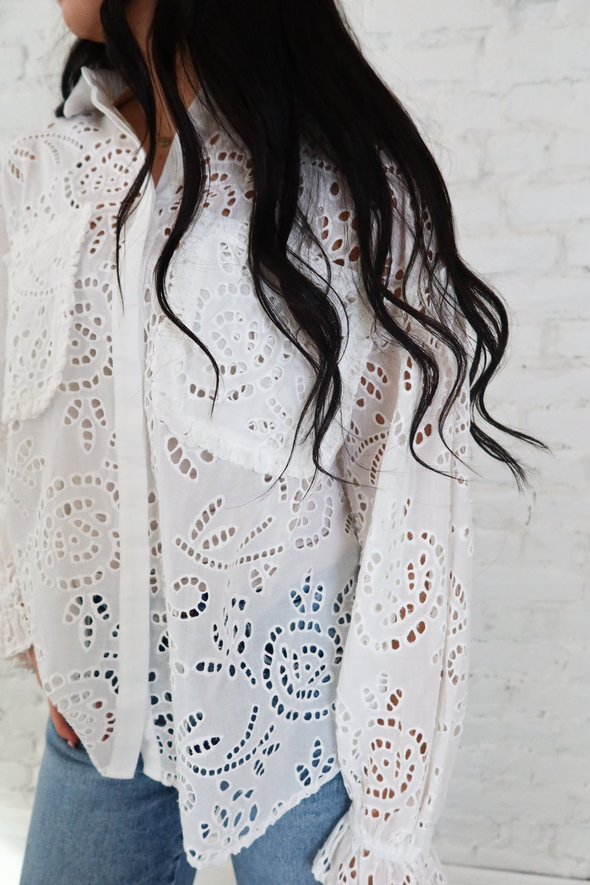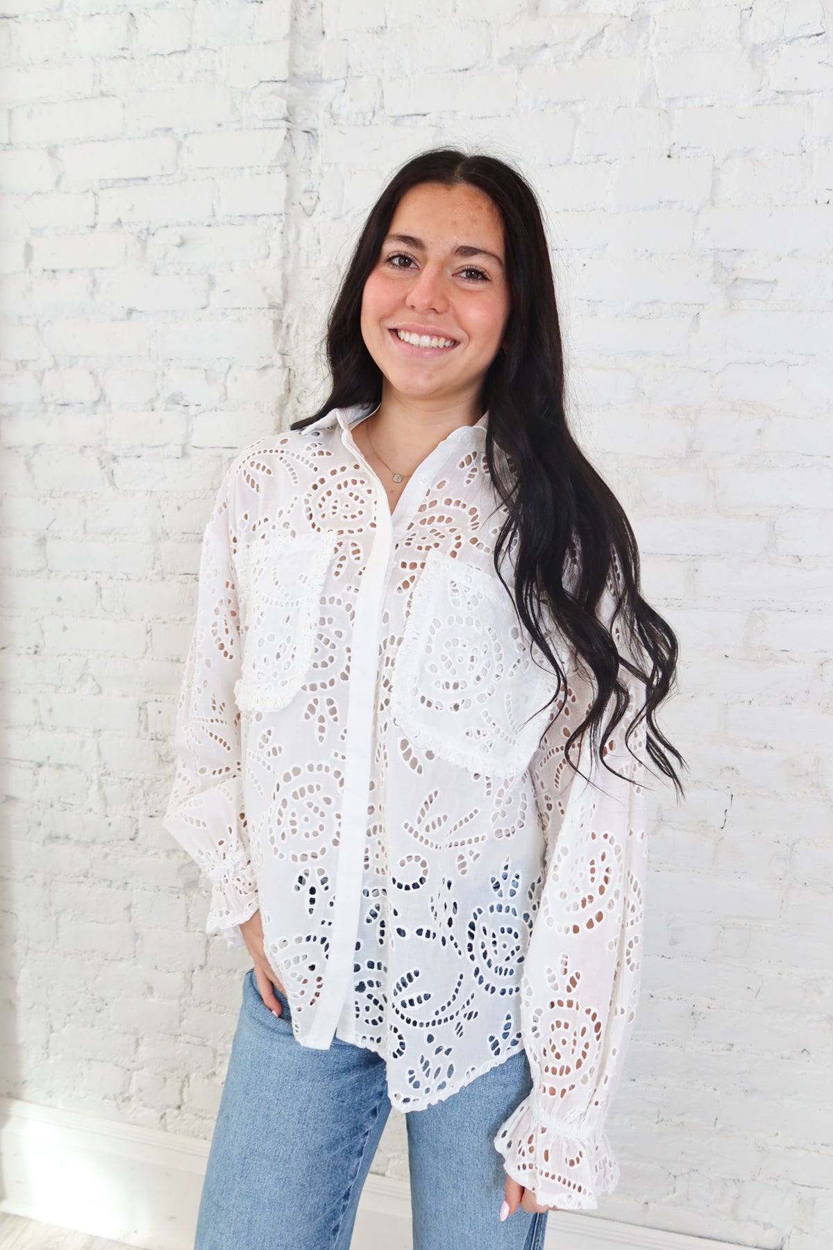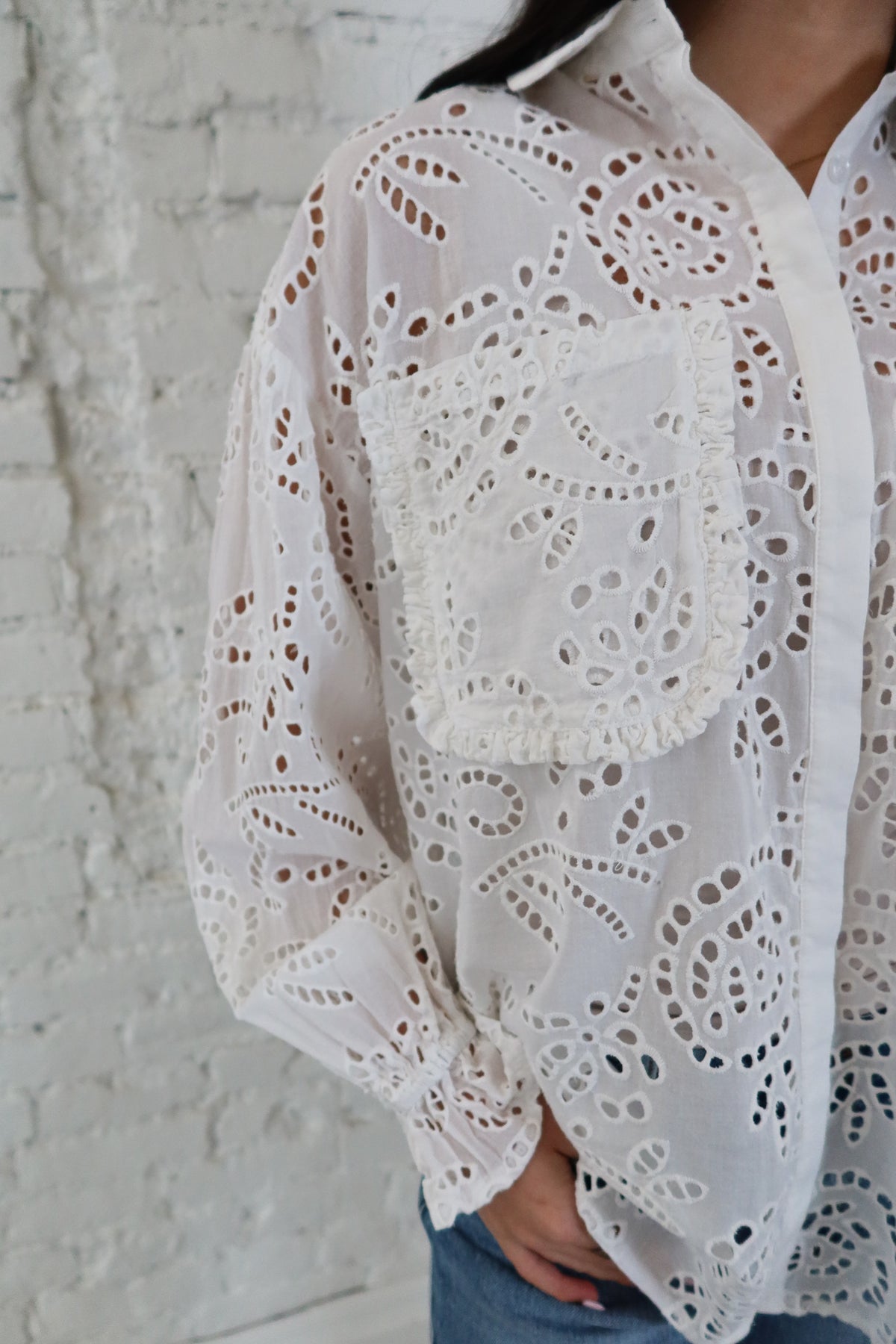 Elevate your everyday wardrobe with this charming white cotton eyelet lace top. Delicate eyelet detailing adds a touch of feminine sophistication, while the classic button-down silhouette keeps things polished and versatile. A ruffled front pockets brings playful dimension to this timeless piece, making it perfect for dressing up or down. Crafted from breathable cotton, it's an effortless essential that transitions seamlessly from office to weekend.