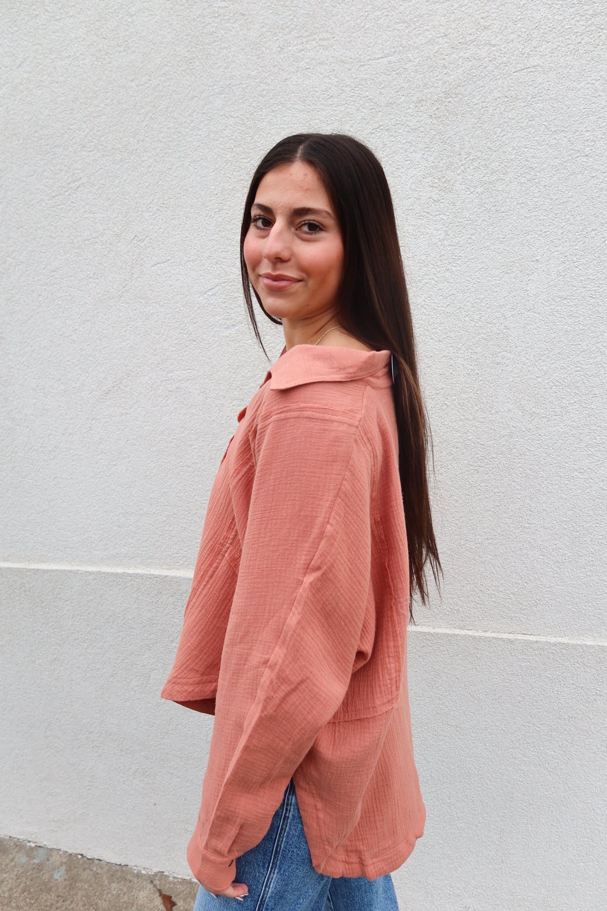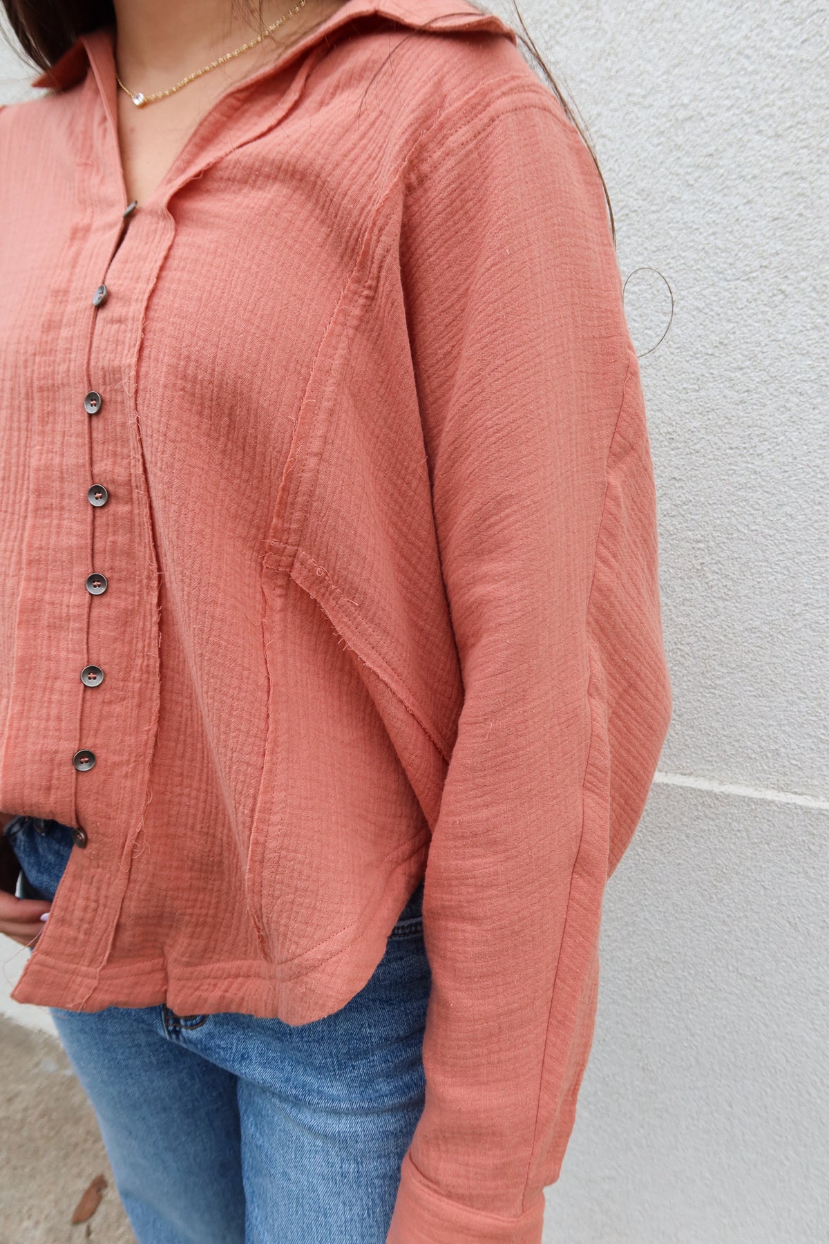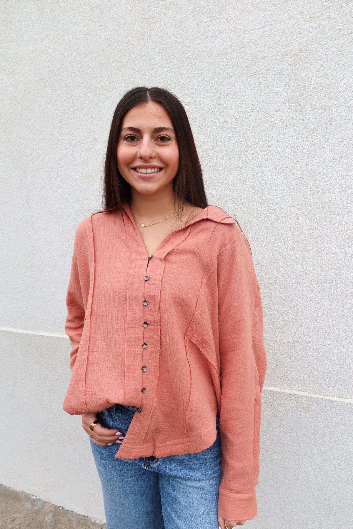 Elevate your everyday wardrobe with this sophisticated apricot long sleeve top, featuring delicate pintuck detailing that adds refined texture and visual interest. The button-front design offers versatile styling options—wear it buttoned for a polished, professional look or leave it open as a chic layering piece. The warm apricot tone flatters a range of skin tones while remaining effortlessly wearable across seasons. Perfect for transitioning from office to weekend, this piece combines timeless elegance with modern design details that make it a wardrobe essential you'll reach for again and again.