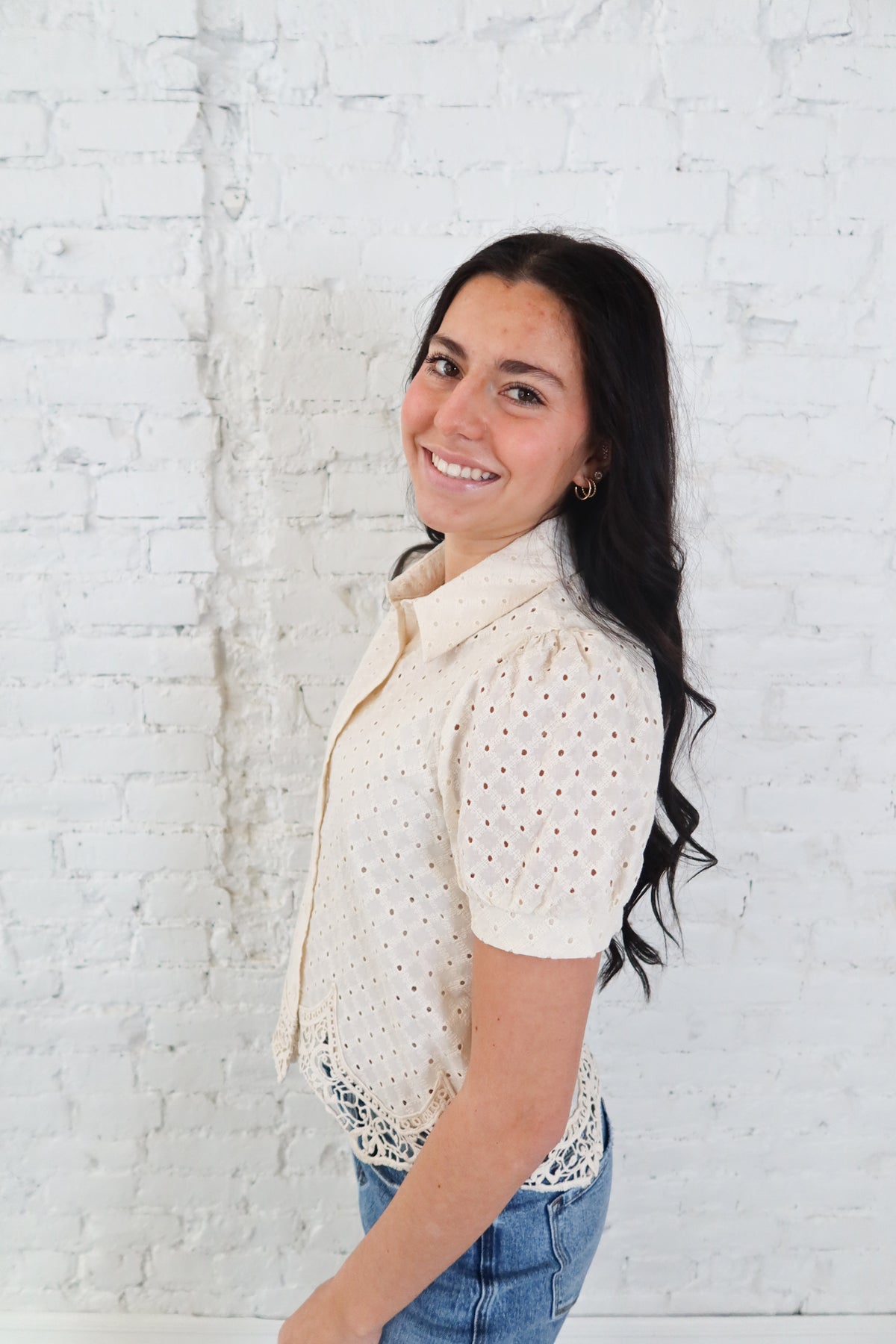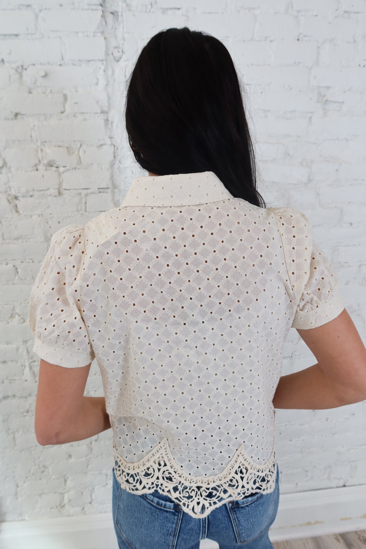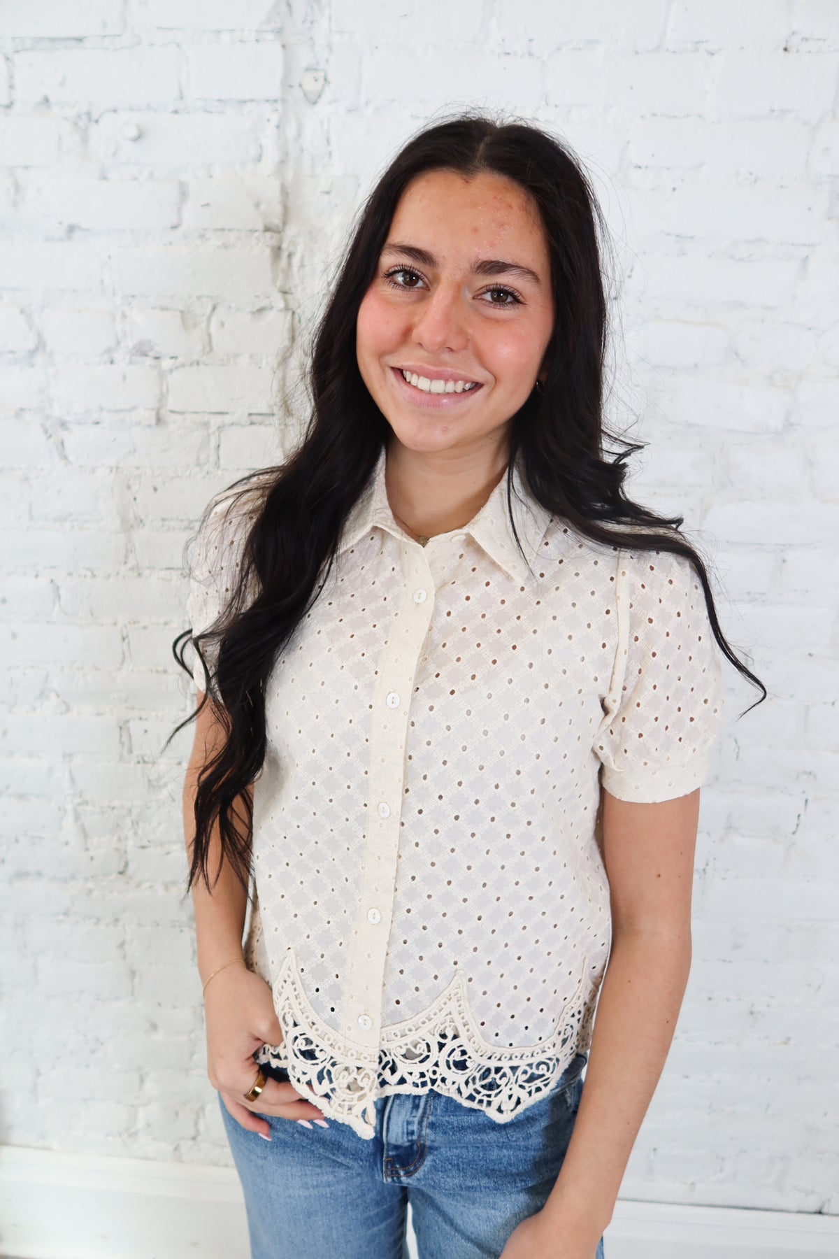 Elevate your spring wardrobe with this charming Eyelet Bubble Sleeve Blouse. Delicate floral eyelet detailing adds feminine sophistication, while bubble sleeves create an effortlessly elegant silhouette. The short sleeve design keeps you cool and comfortable through warm seasons, making it perfect for layering or wearing solo. Timeless in style yet undeniably on-trend, this blouse transitions seamlessly from casual outings to polished occasions. A versatile essential that brings understated grace to any ensemble.