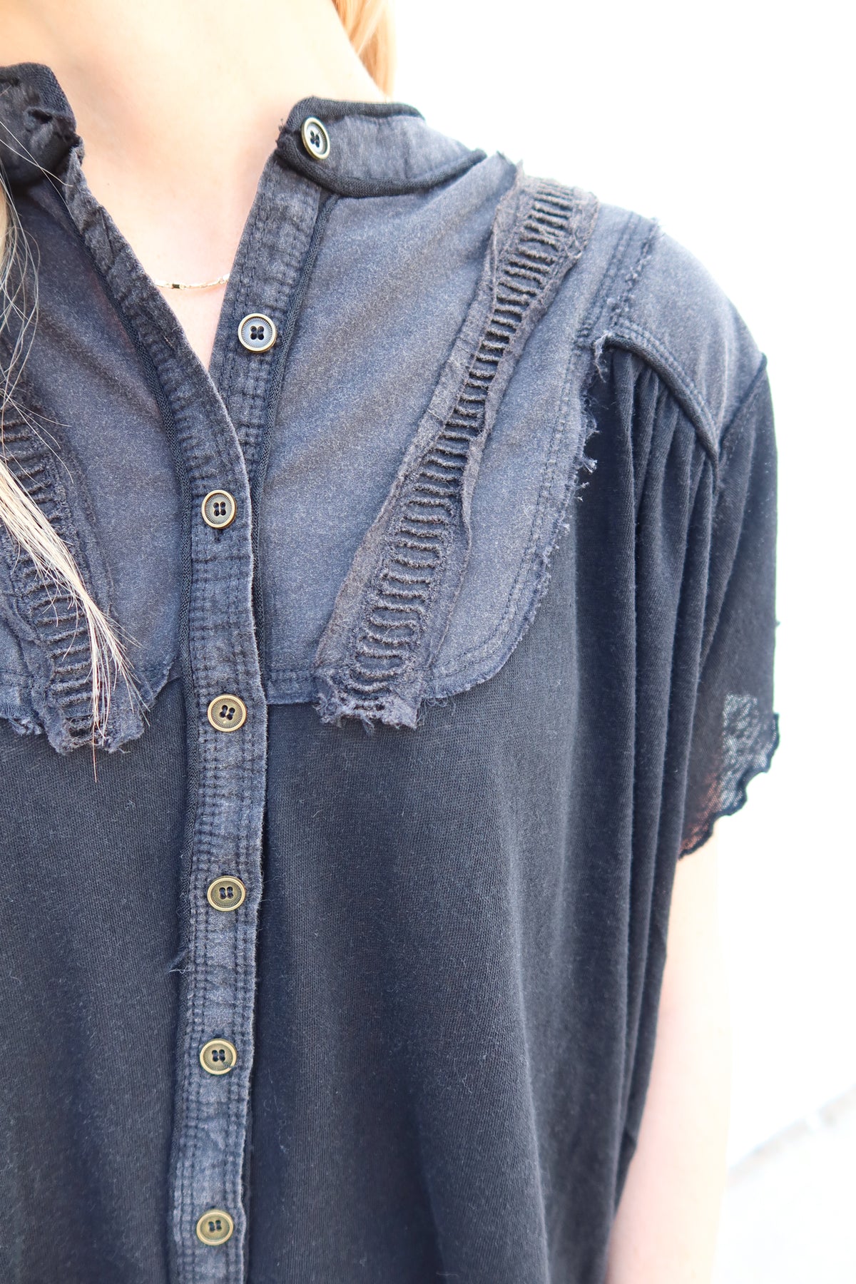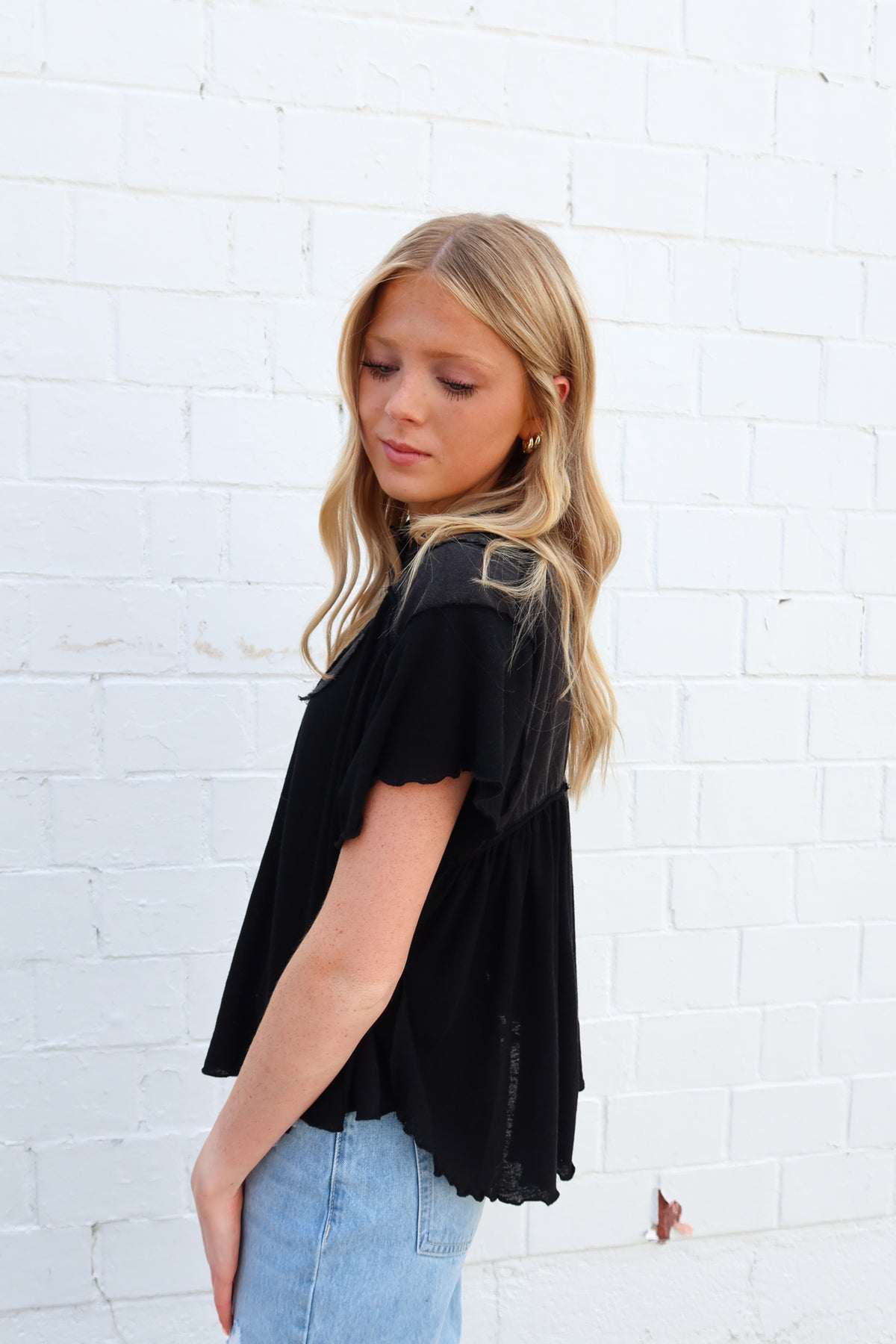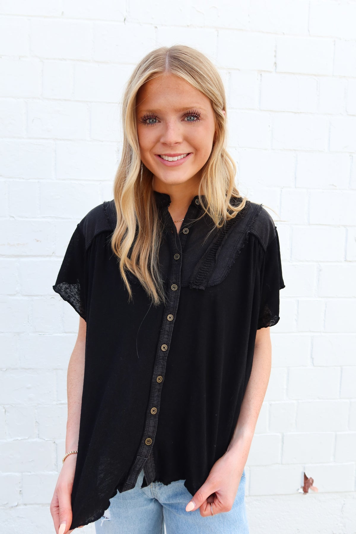 Elevate your everyday wardrobe with the Out & About Flowy Black Top. Designed for comfort and effortless style, its lightweight fabric drapes beautifully for a flattering fit that moves with you. Perfect for any occasion, this versatile top pairs seamlessly with jeans or skirts, making it your go-to choice from morning errands to evening outings. Embrace ease and elegance in one flattering piece.