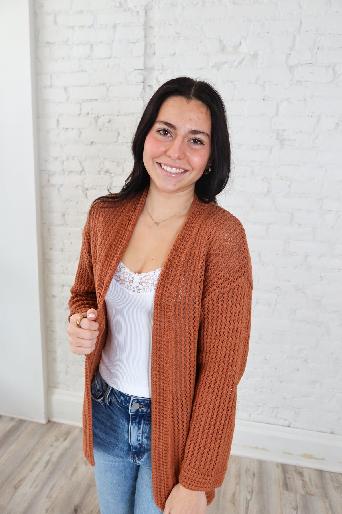 Effortlessly layer this clay-toned cardigan over any outfit for a polished, versatile look. The lightweight fabric drapes beautifully, making it perfect for transitional seasons or layering year-round. Its open front style offers easy styling flexibility—wear it buttoned for structure or open for a relaxed, flowing silhouette. A wardrobe essential that works as hard as you do, from casual days to dressed-up occasions.