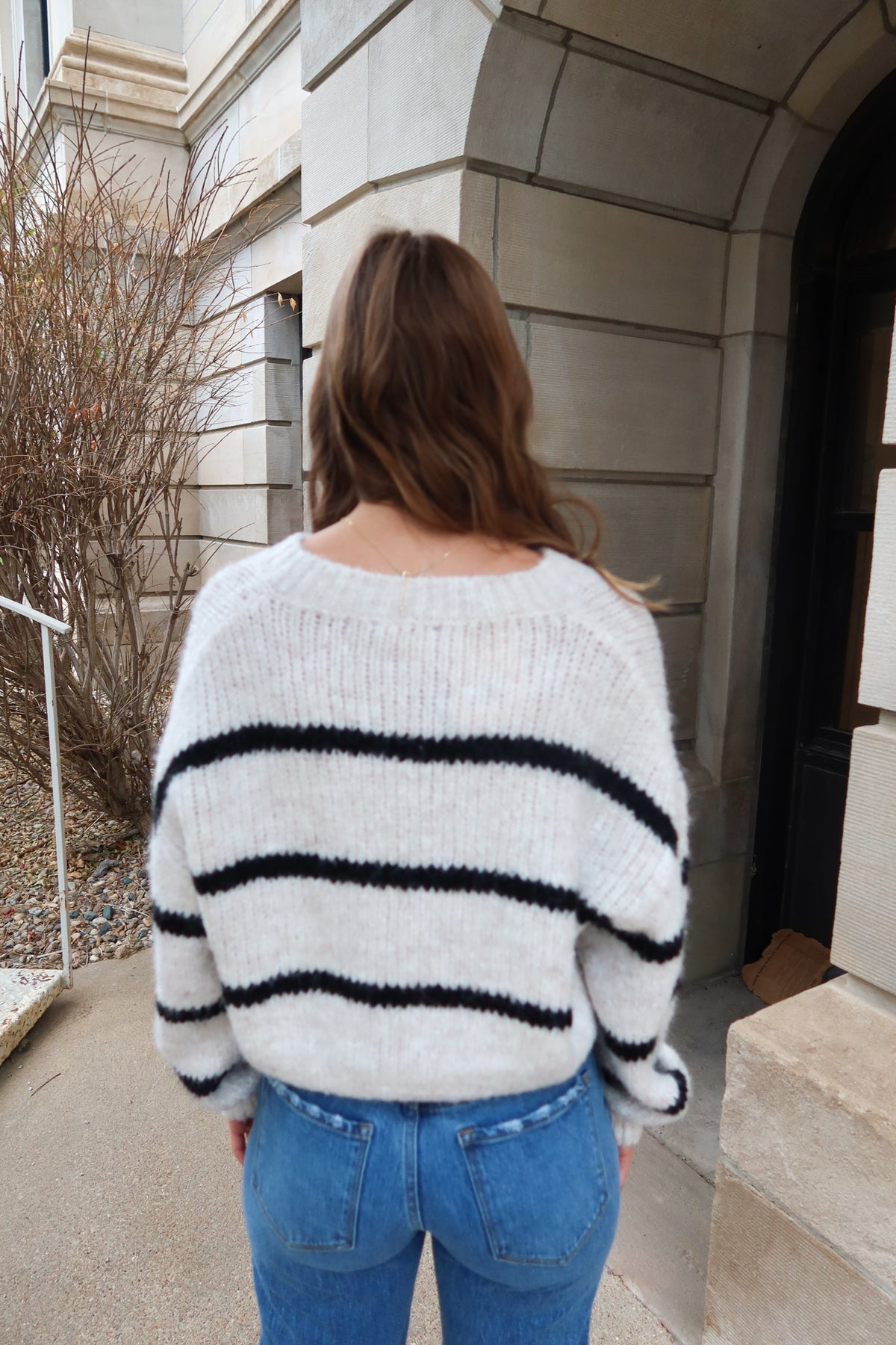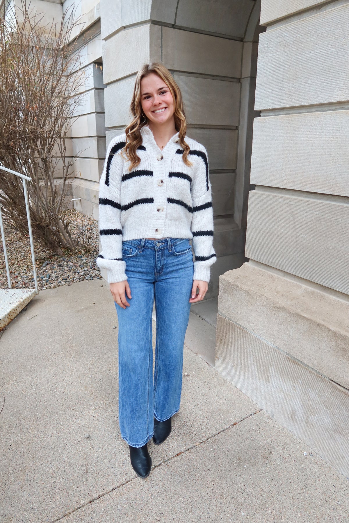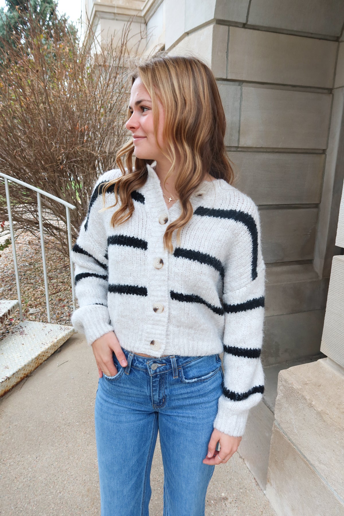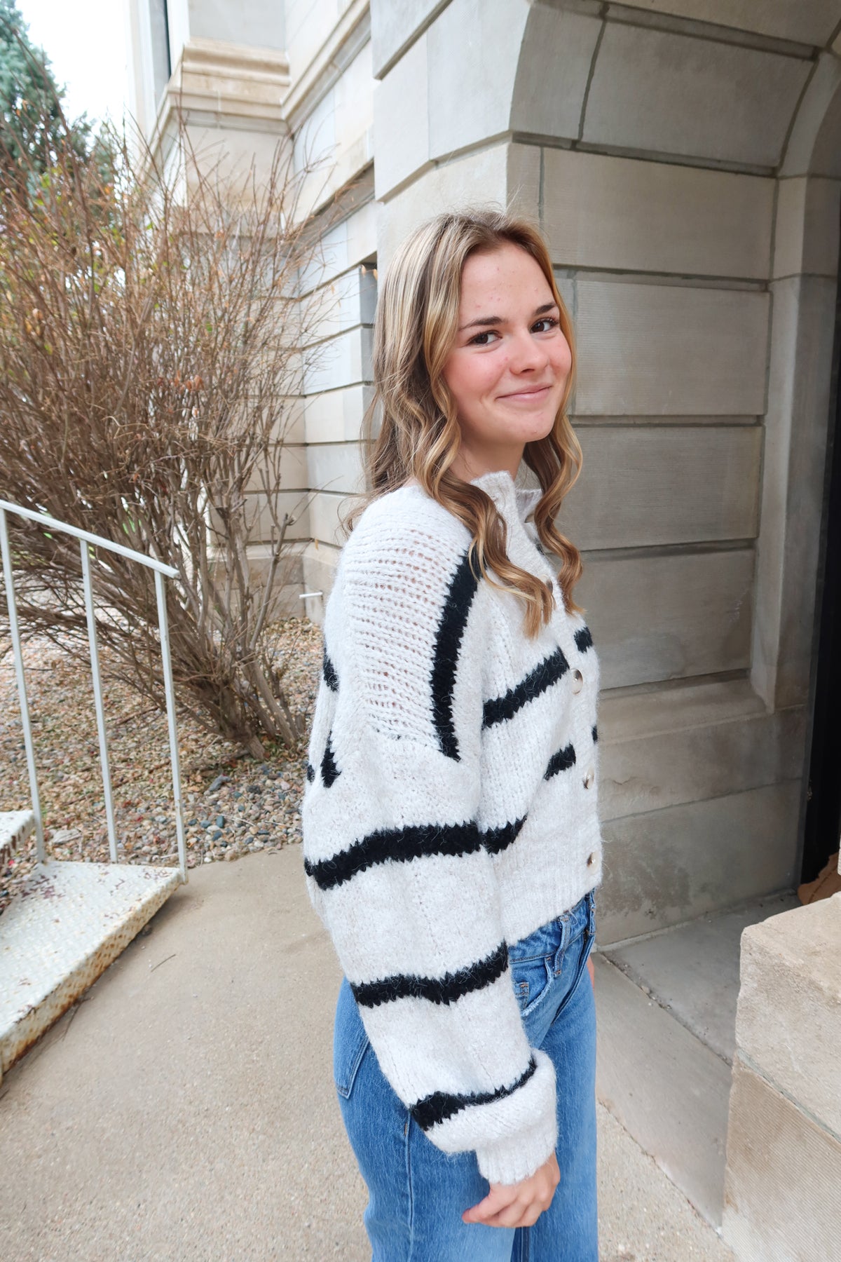 Wrap yourself in effortless comfort with this black stripe button-down cardigan. Crafted from soft, cozy sweater fabric, it's the perfect layering piece for transitional weather or casual lounging. The classic striped pattern adds visual interest while the button-front design offers easy styling versatility. Whether you're dressing it up over a dress or pairing it with your favorite jeans, this cardigan delivers warmth and timeless appeal that works season after season.