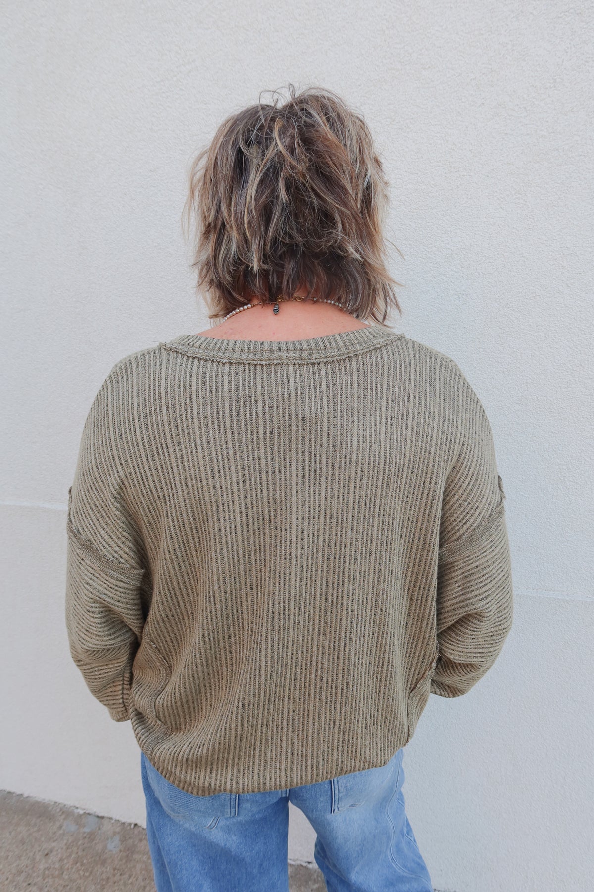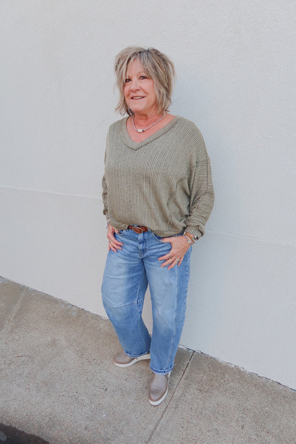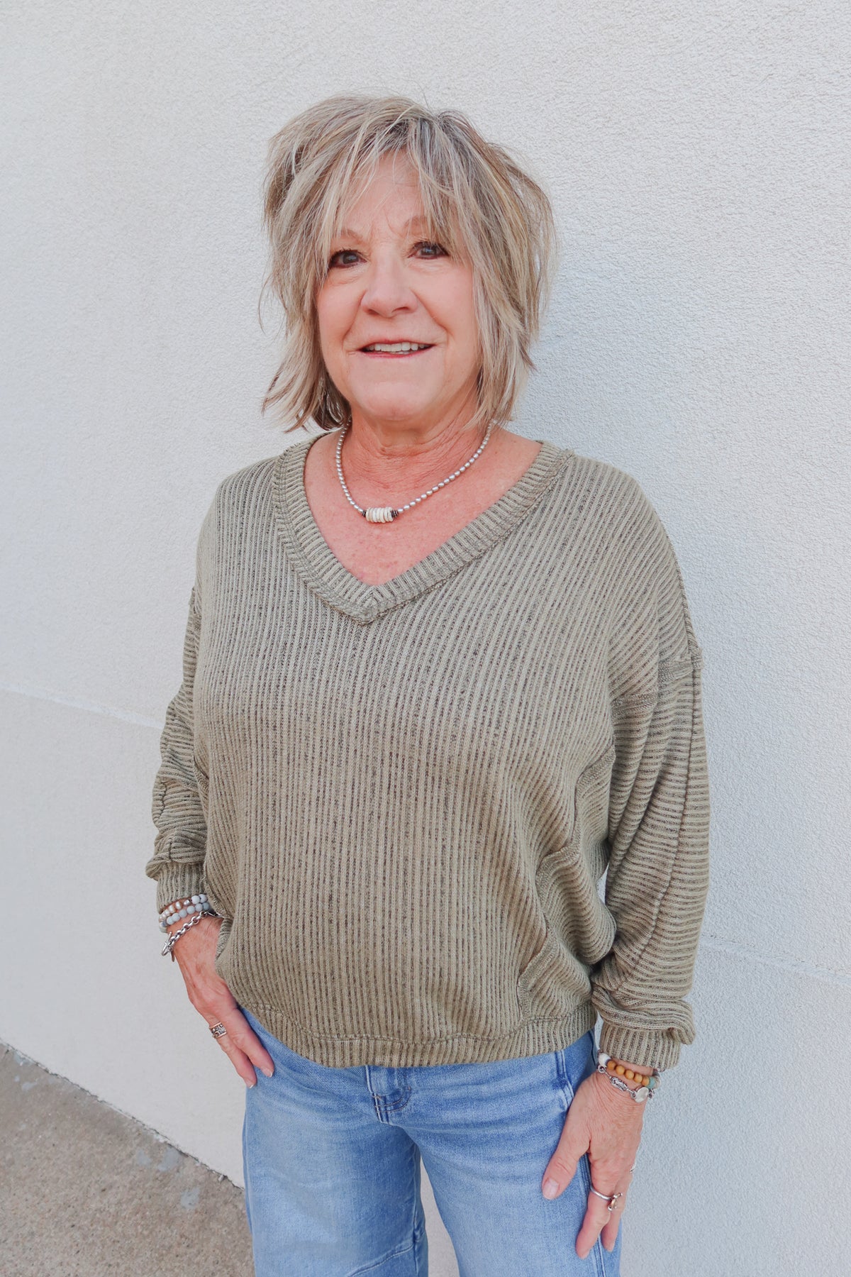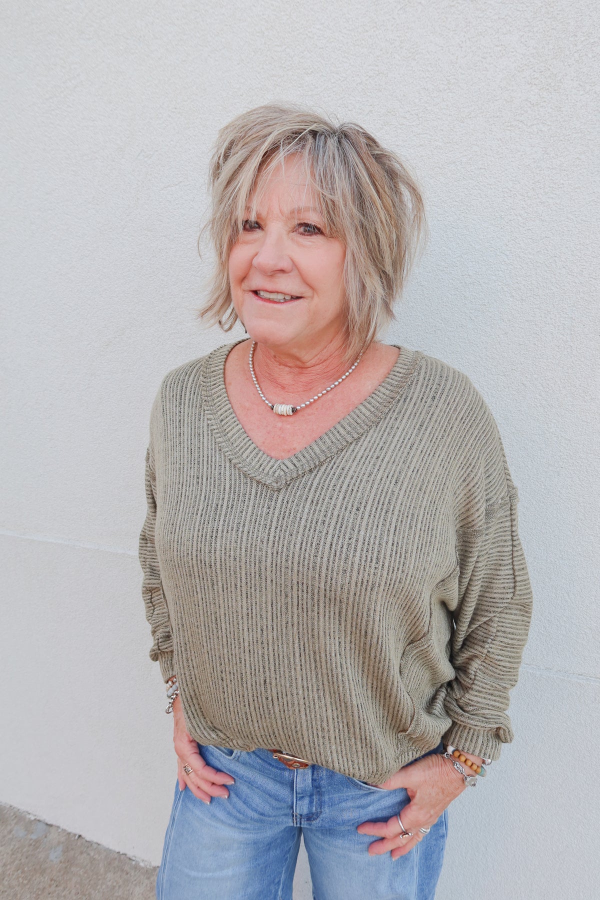 Effortlessly chic and incredibly comfortable, the In The Loop Olive V-Neck Sweater combines timeless style with modern ease. The flattering V-neckline elongates your silhouette while the lightweight fabric keeps you cool without sacrificing warmth. Dolman sleeves add an elegant, relaxed drape that works beautifully layered or worn solo. Perfect for transitional seasons, this versatile piece pairs seamlessly with everything from jeans to tailored trousers, making it an essential addition to any wardrobe.