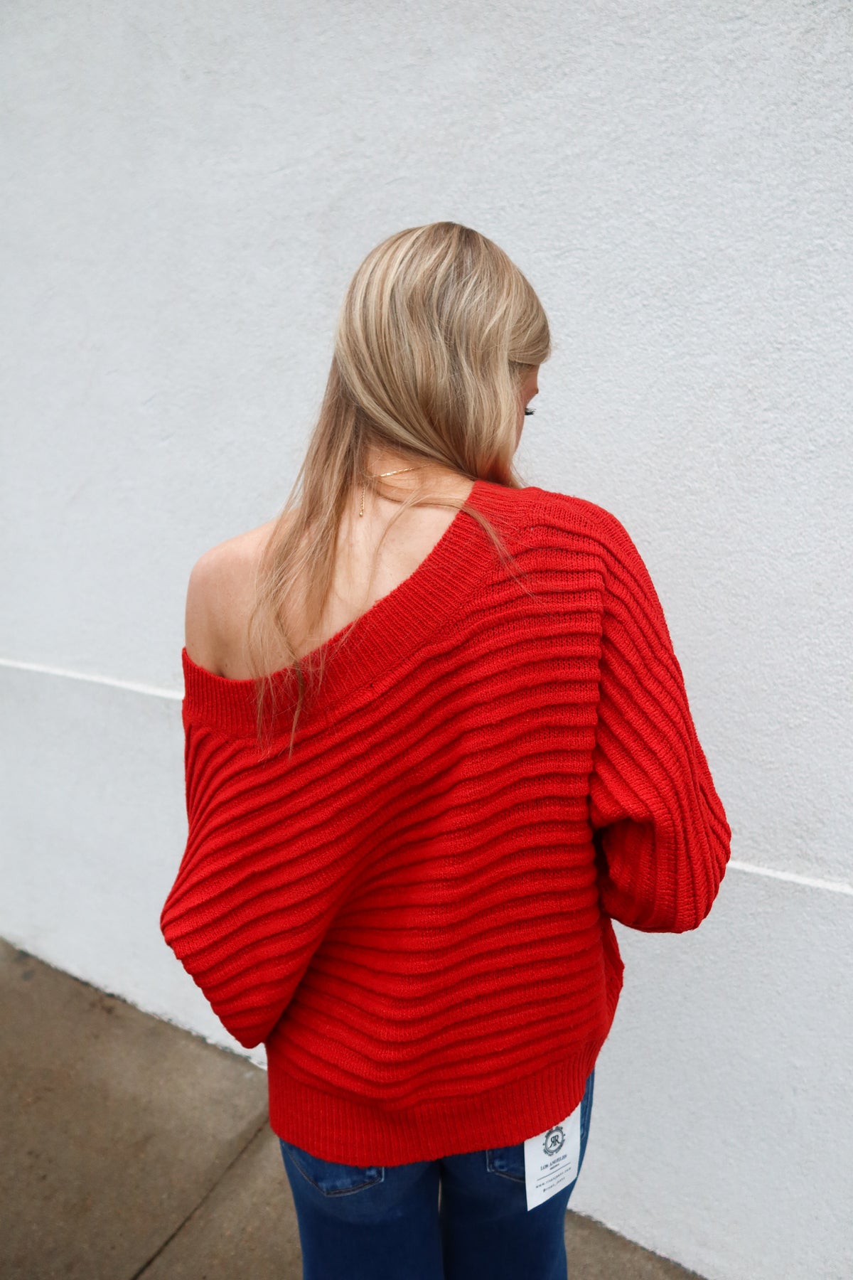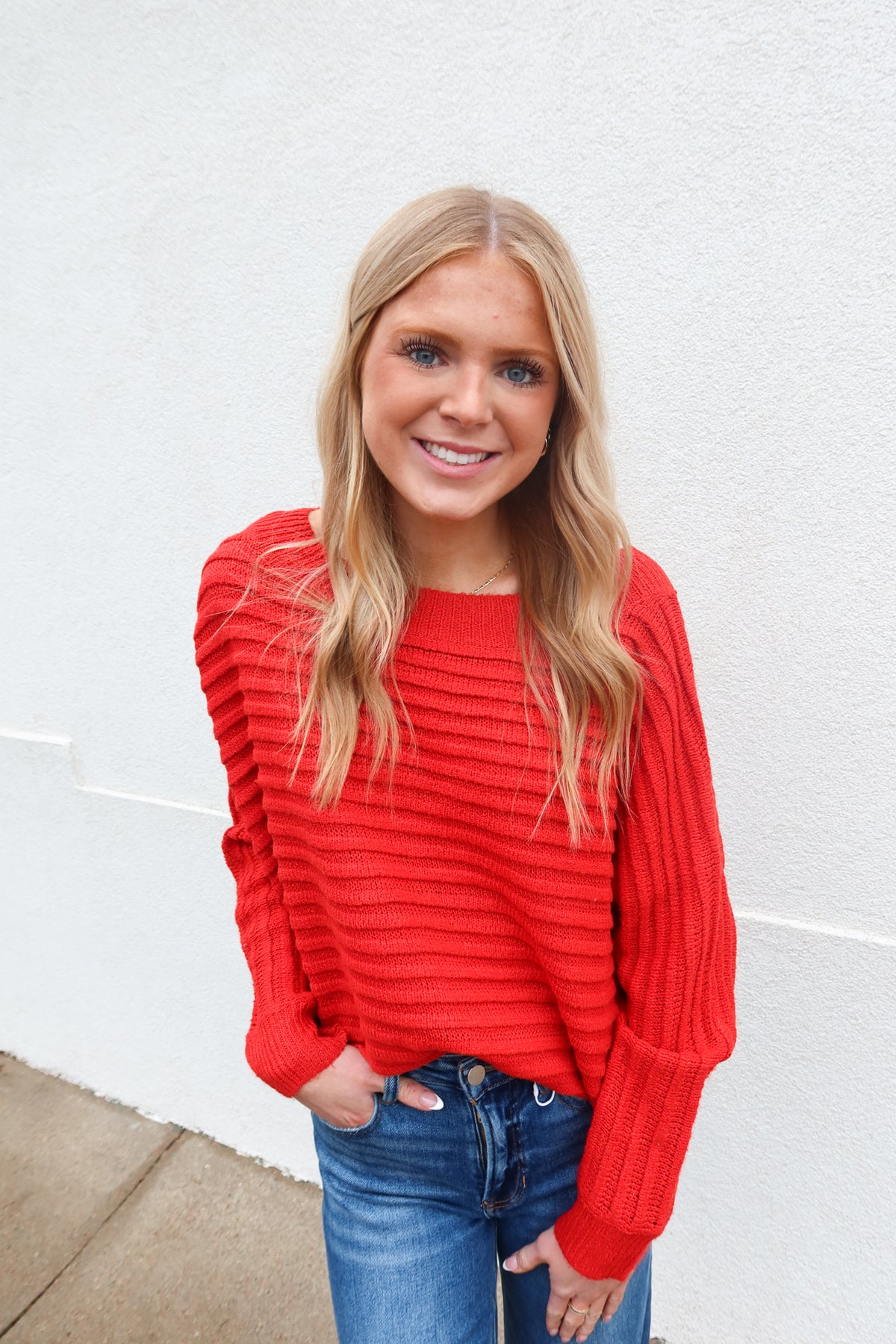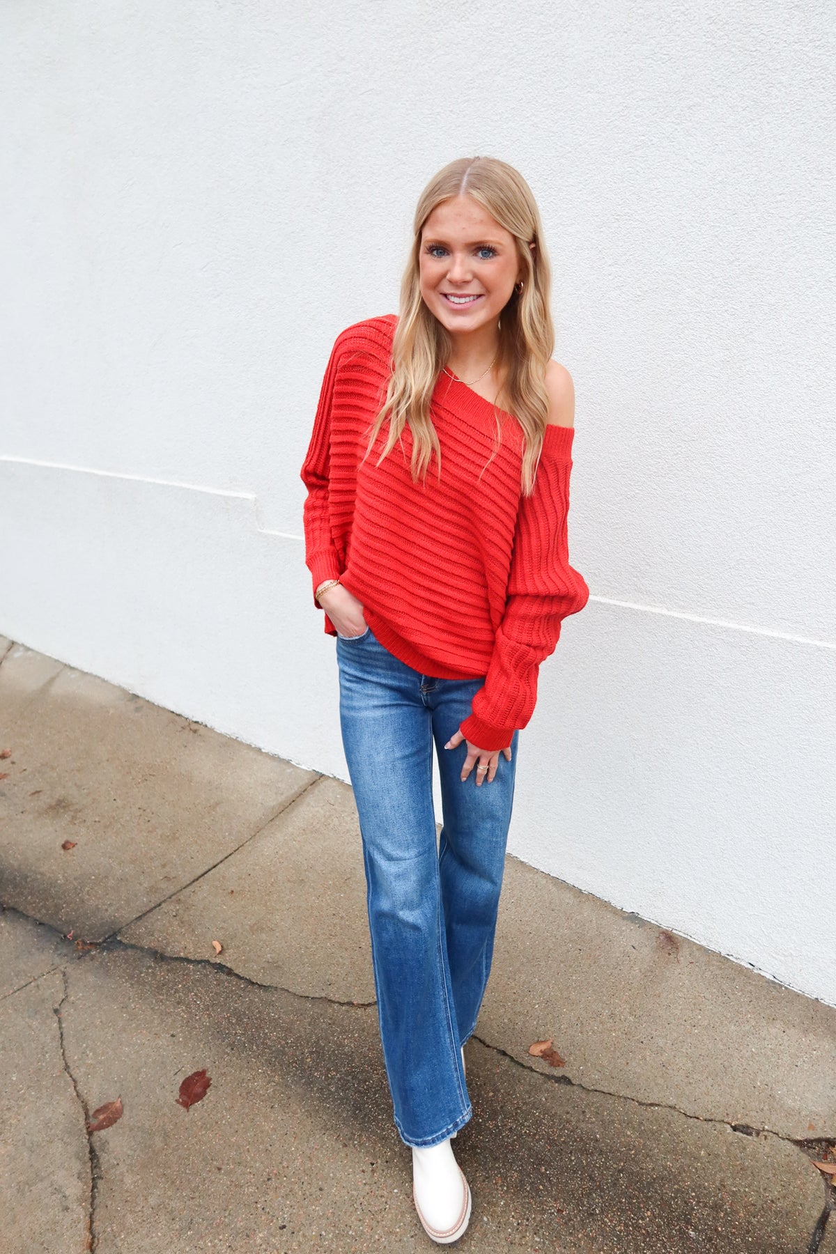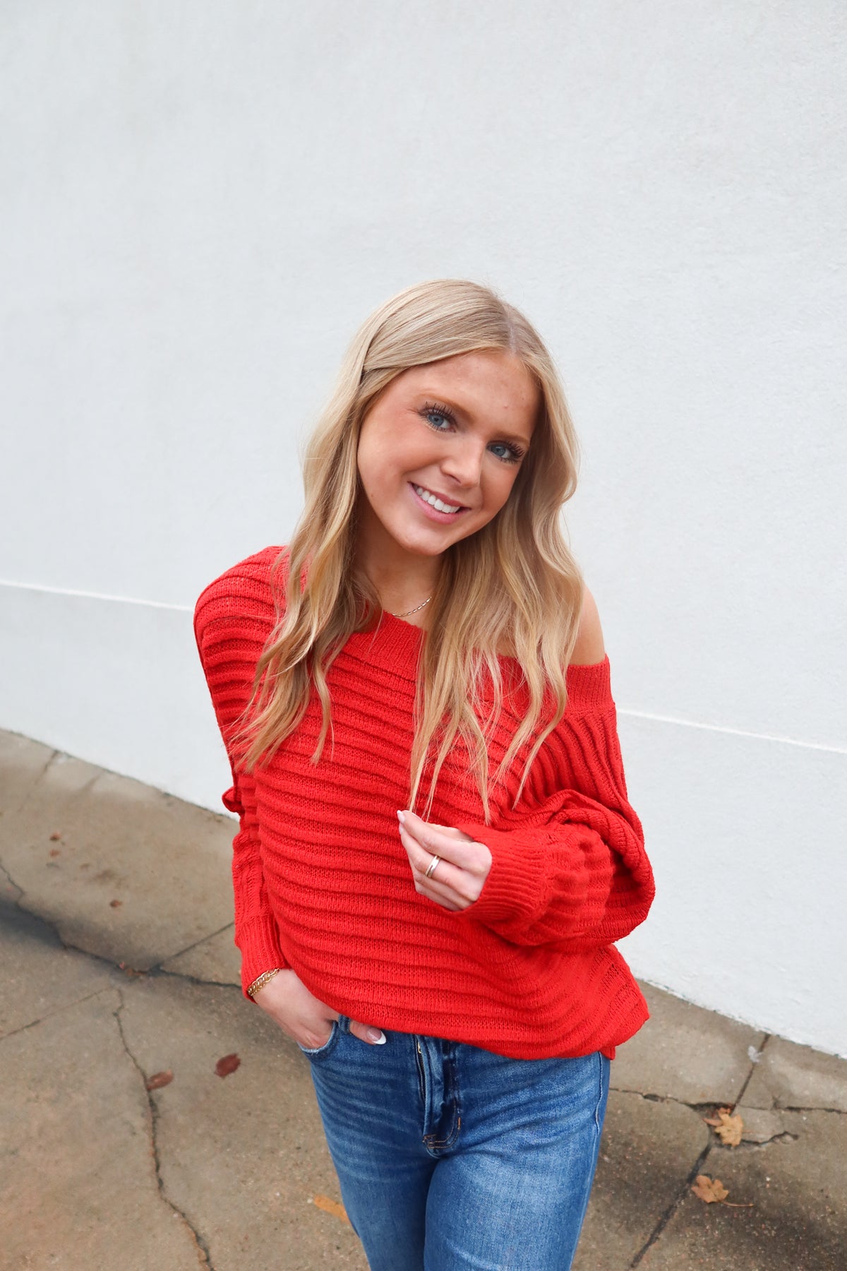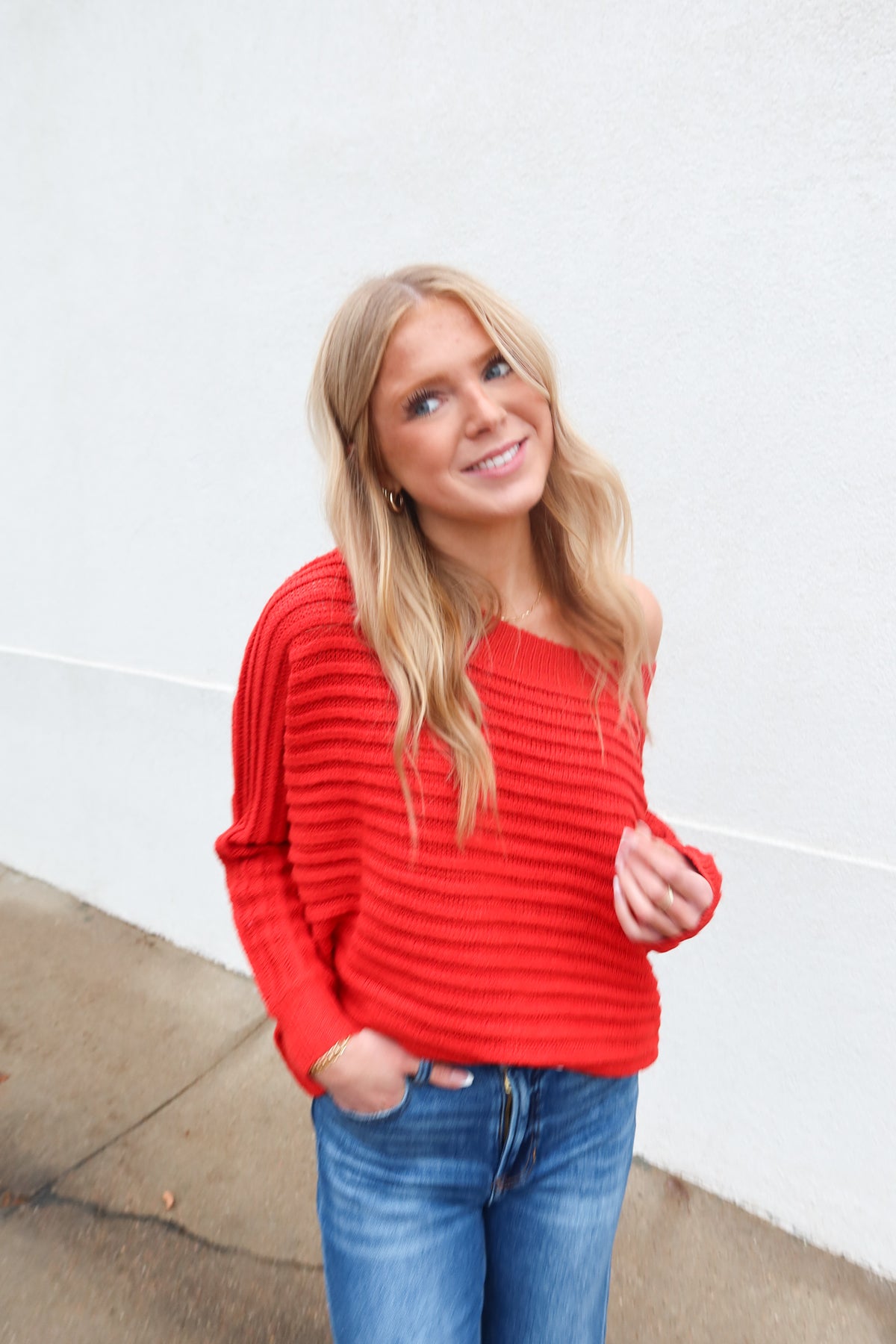 Transition effortlessly between seasons with this versatile red sweater that adapts to your style. The relaxed dolman sleeves create a flattering, comfortable silhouette, while the off-shoulder design offers two distinct looks in one piece. Wear it pulled up for a classic crewneck or slip it off your shoulders for an effortlessly chic vibe.