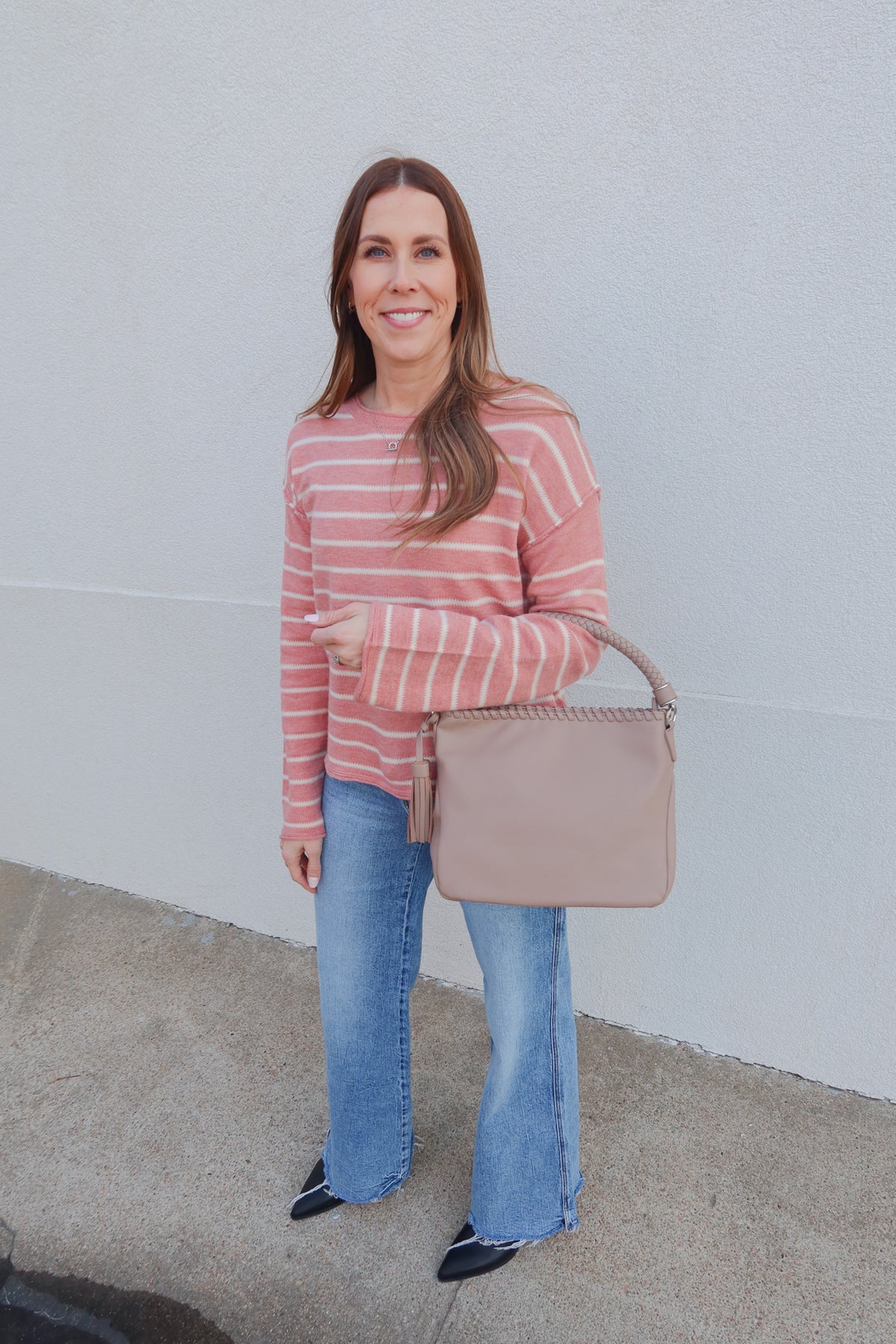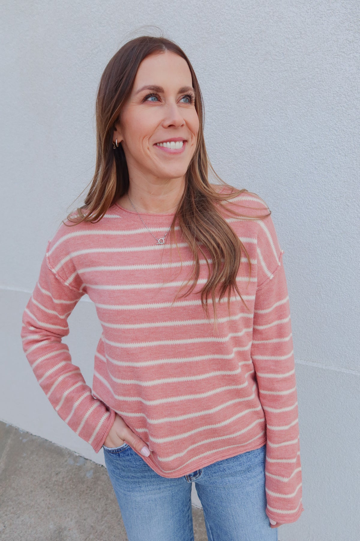 Wrap yourself in cozy comfort with this Rose Round Neck Striped Sweater. Crafted from soft, luxurious fabric, this wardrobe essential features a cream body accented with delicate light brown stripes for effortless style. The classic round neckline works beautifully with any outfit, making it perfect for layering or wearing solo. Whether you're heading to the office or settling in for a relaxed weekend, this sweater delivers warmth and sophistication that you'll reach for again and again.