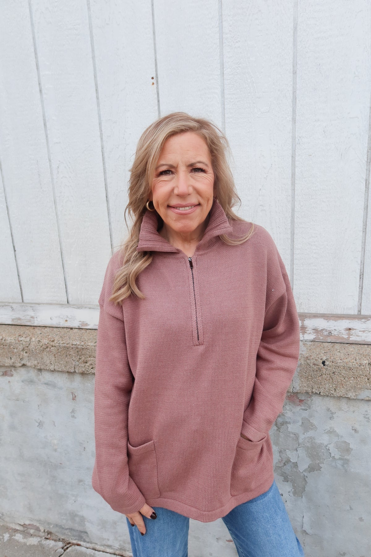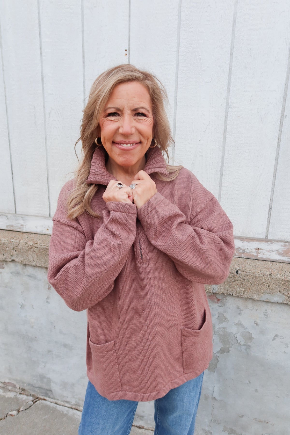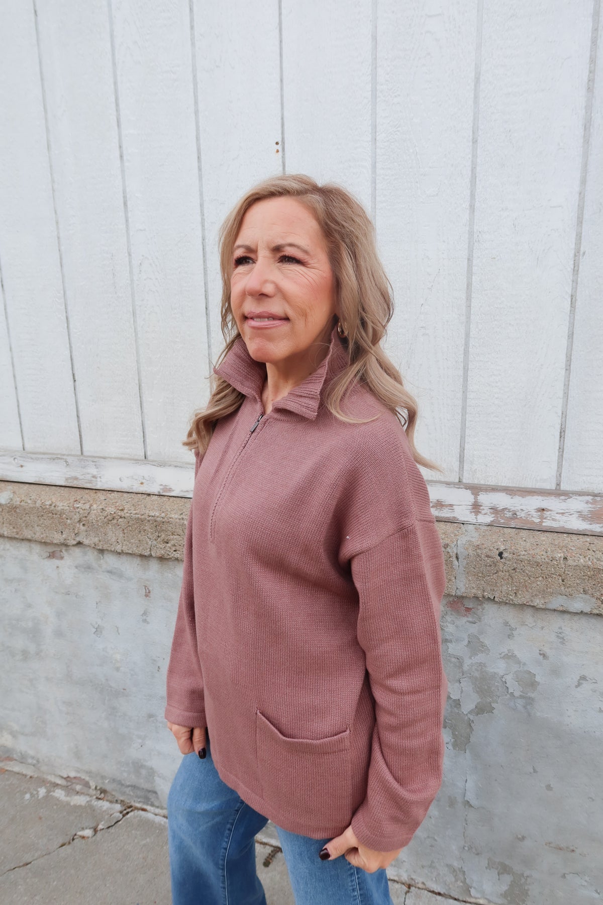 Elevate your everyday wardrobe with this versatile Red Bean Half Zip Sweater. The convenient front zip allows you to adjust your comfort level throughout the day, while the classic collared neckline adds polished sophistication to any outfit. Practical side pockets keep your essentials within reach, making this sweater as functional as it is stylish. Perfect for layering or wearing solo, this piece transitions seamlessly from casual weekends to professional settings.