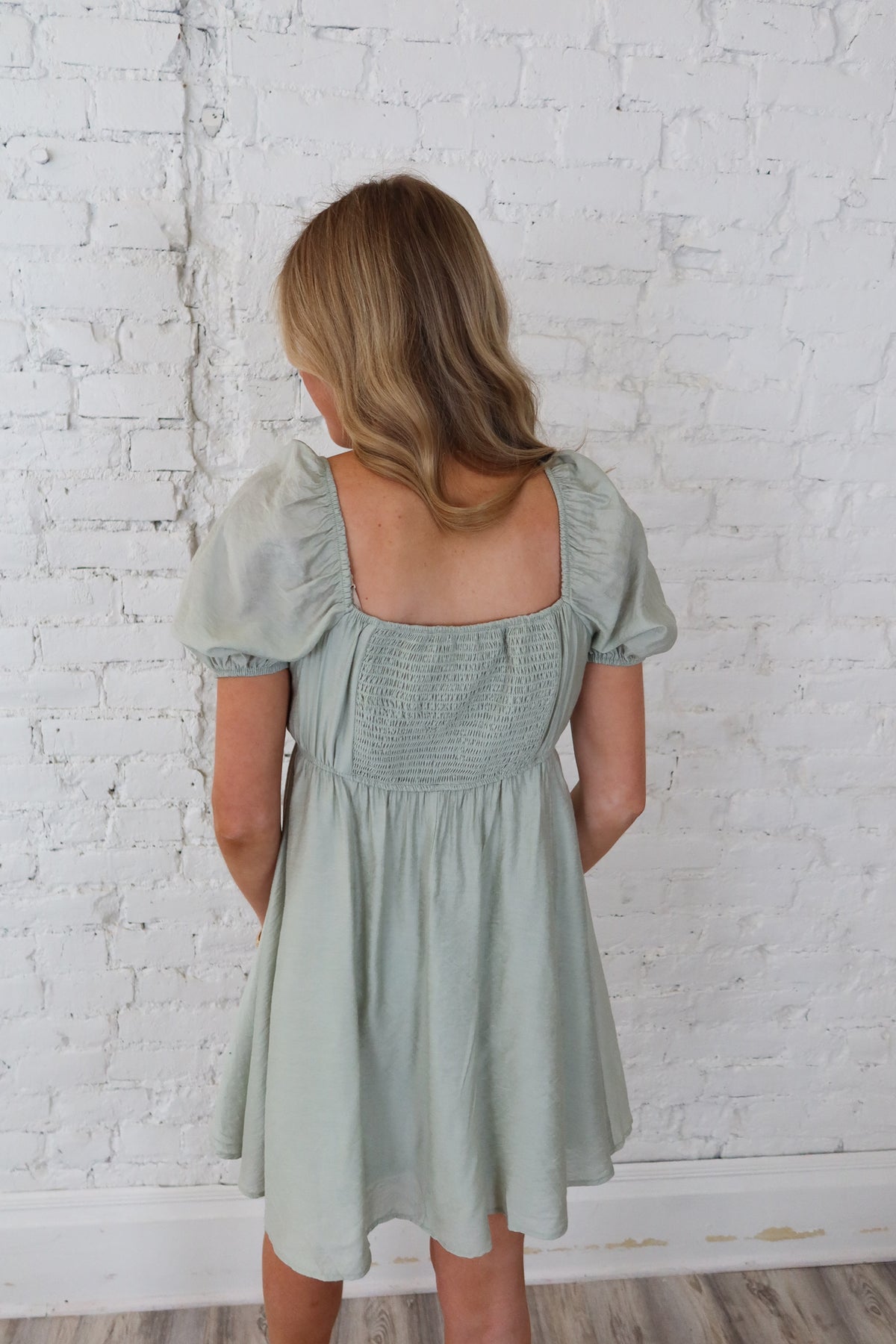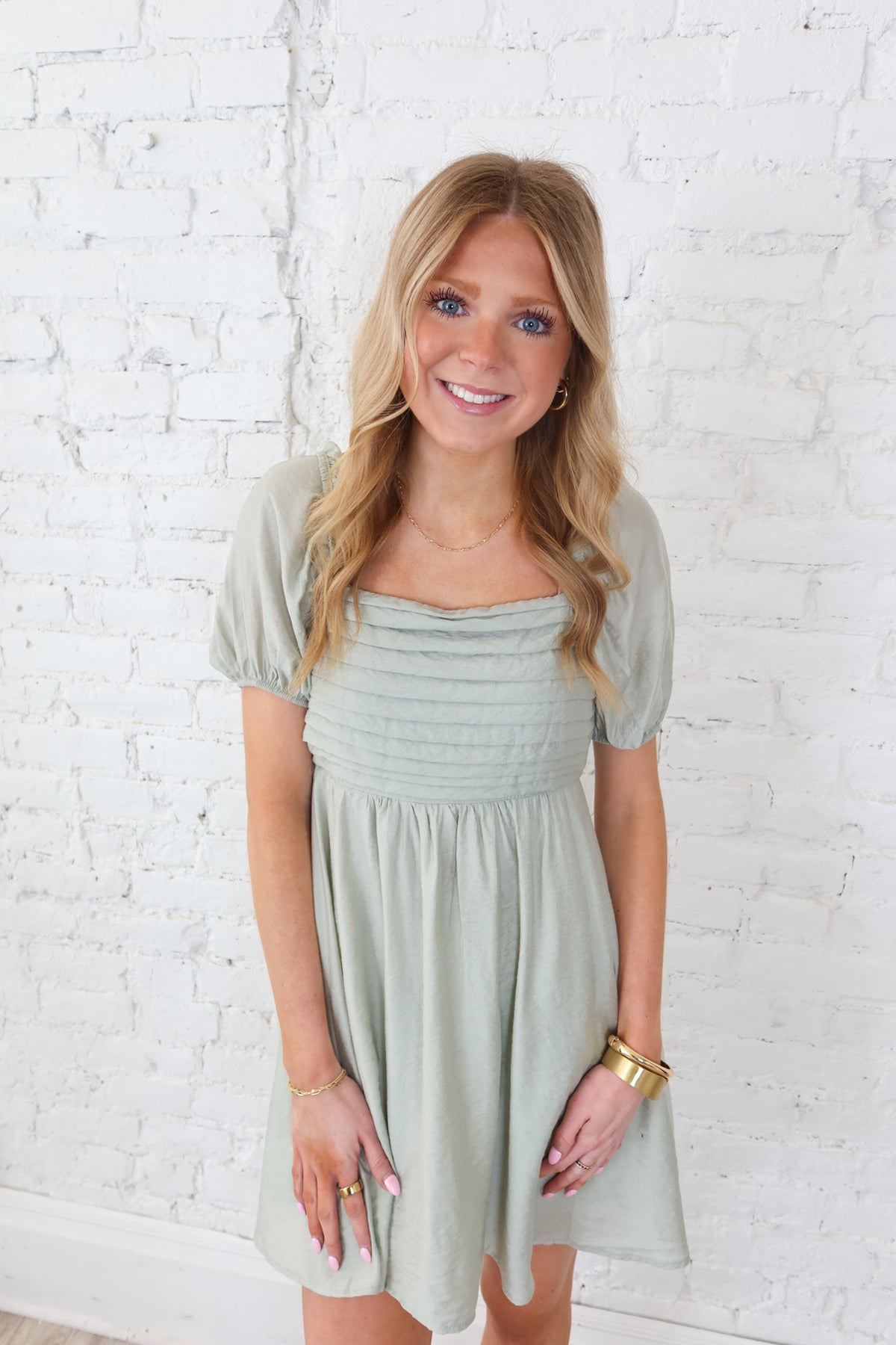 Elevate your spring wardrobe with this charming sage dress, designed to turn heads with its thoughtfully crafted details. The pleated bodice creates flattering structure and movement, while delicate puff sleeves add a touch of whimsy and femininity. Perfect for everything from casual outings to garden parties, this short dress combines comfort with effortless style. The soft sage hue complements all skin tones and pairs beautifully with your favorite accessories. Whether you're dressing up or keeping it relaxed, this piece delivers that coveted cute-and-polished look that makes you feel confident and put-together.
