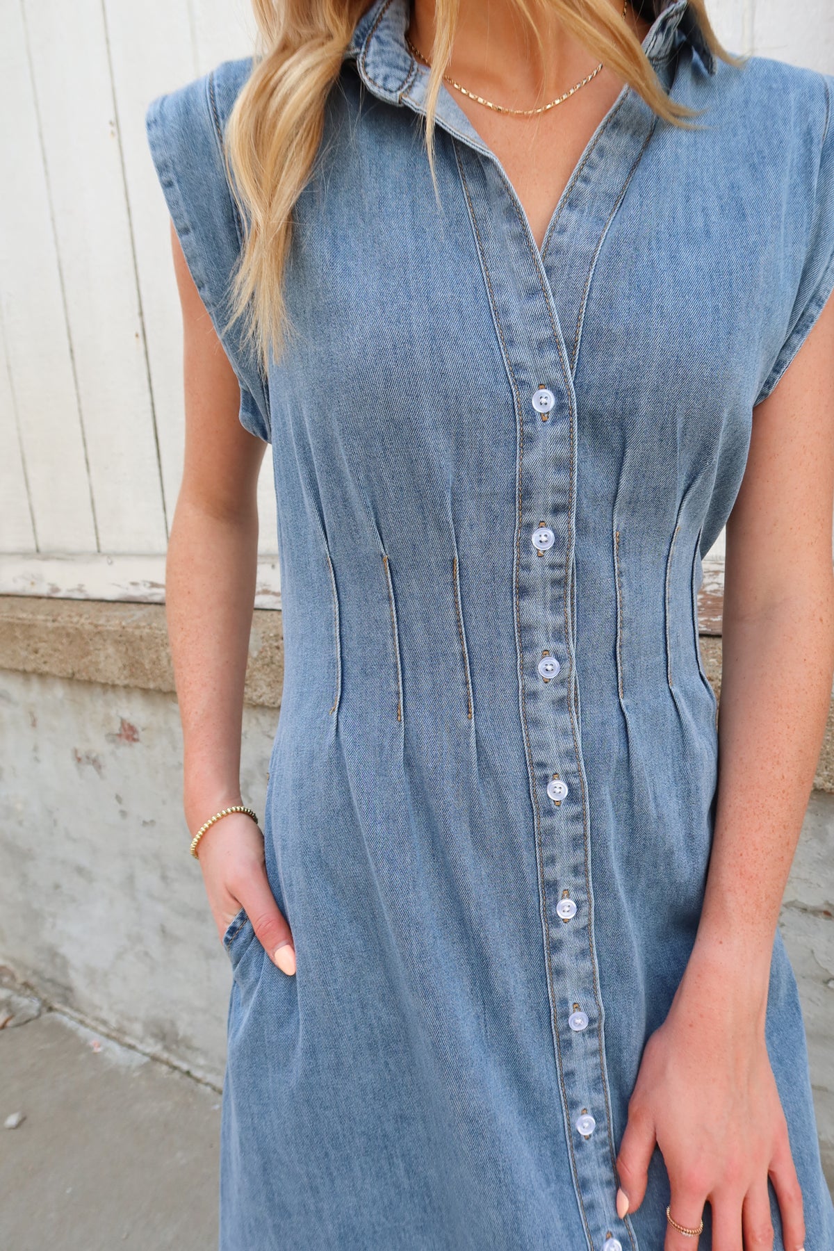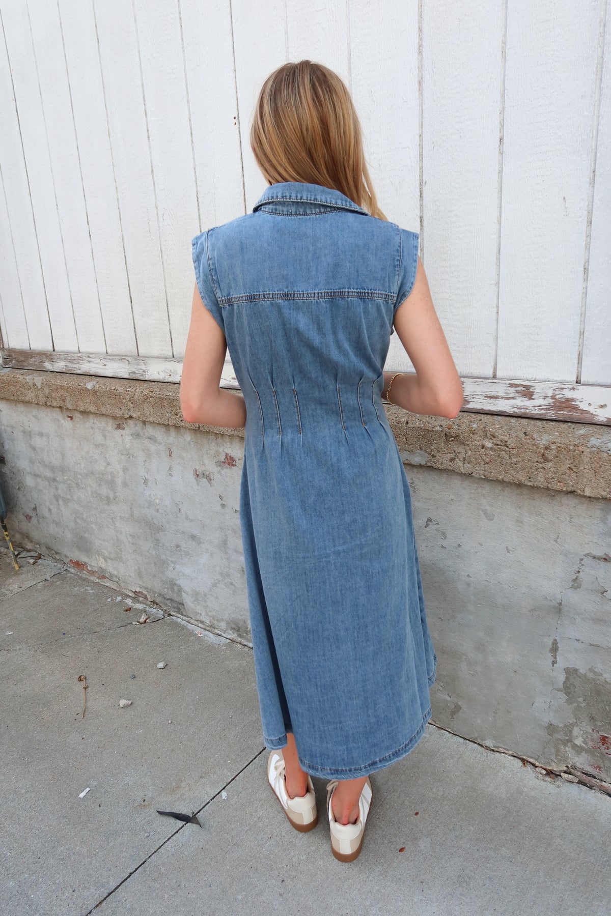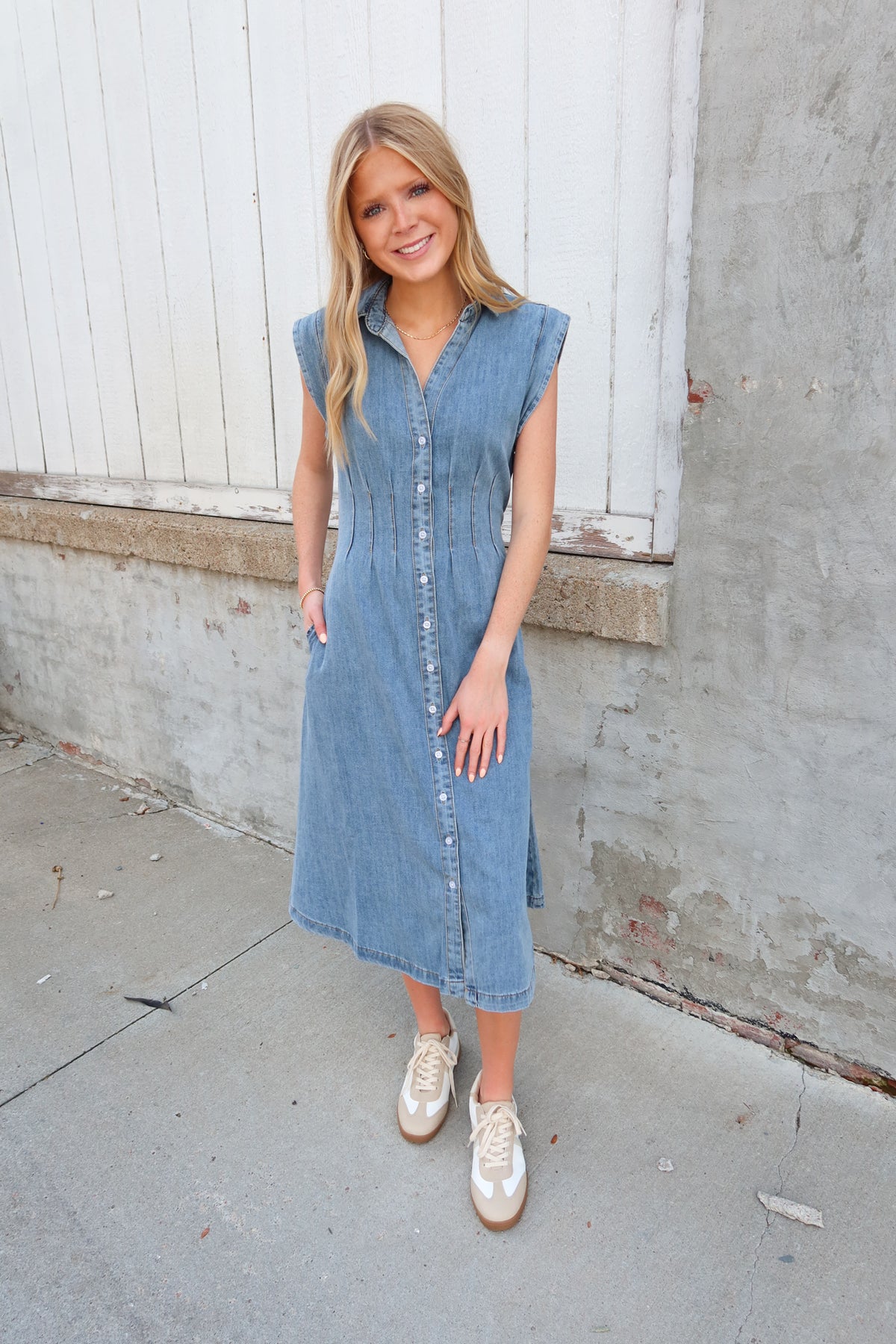 Embrace effortless style with this Denim Button Up Midi Dress. Crafted from comfortable denim, it features a flattering midi length and classic button-up design for versatile wear. Perfect for day-to-night looks, this dress pairs easily with your favorite accessories and footwear, making it a wardrobe essential you'll reach for again and again.