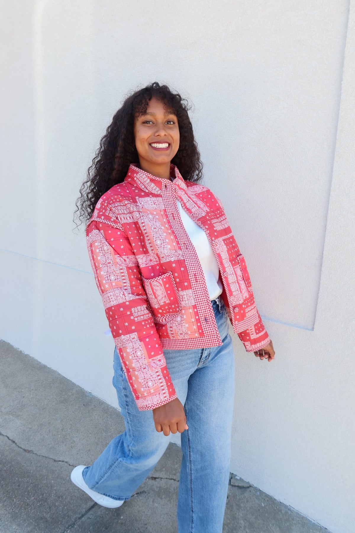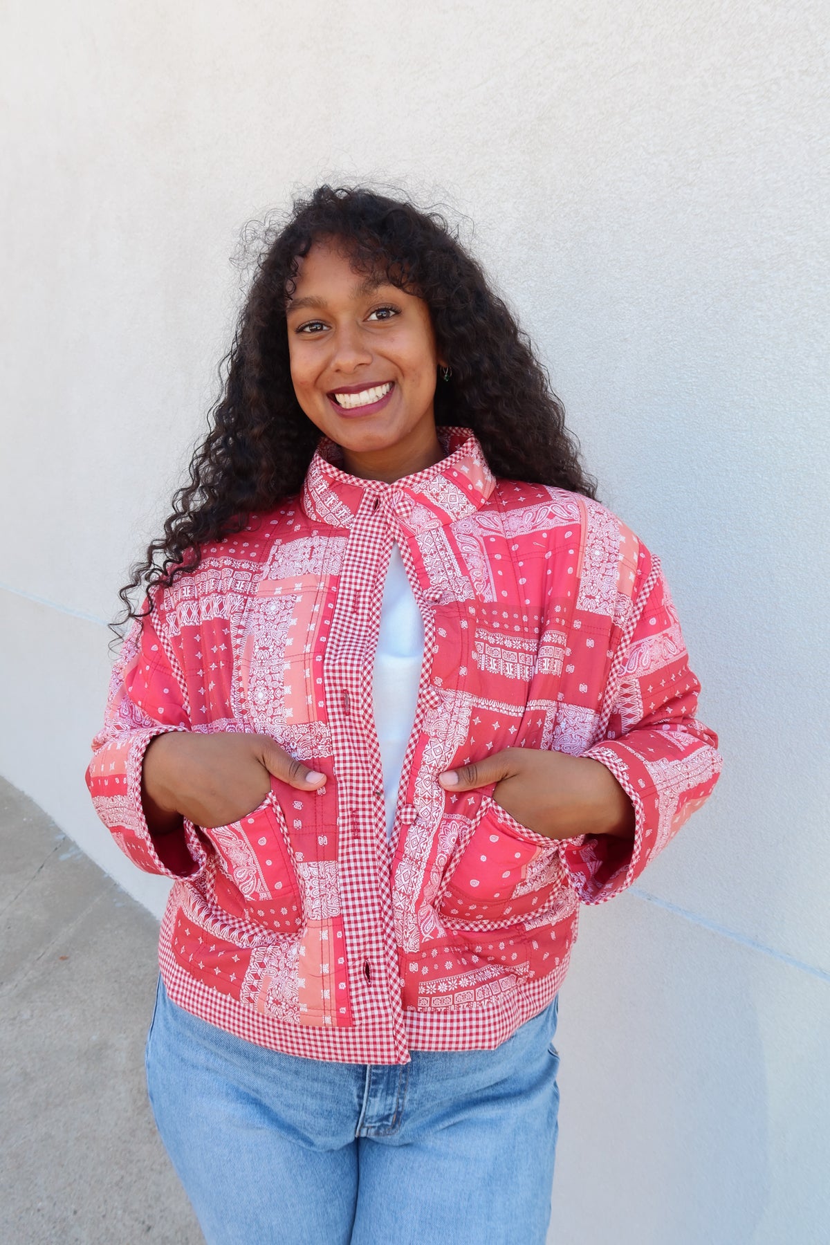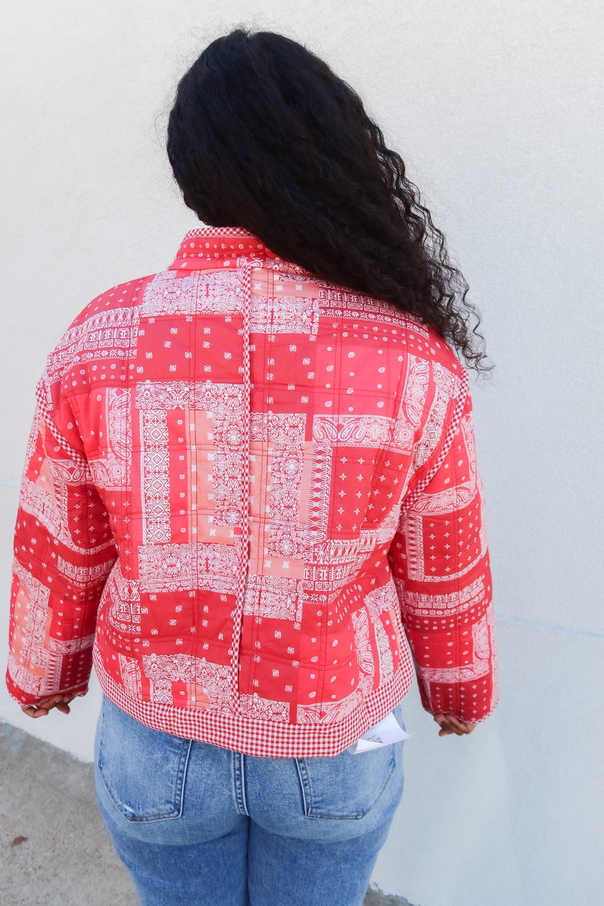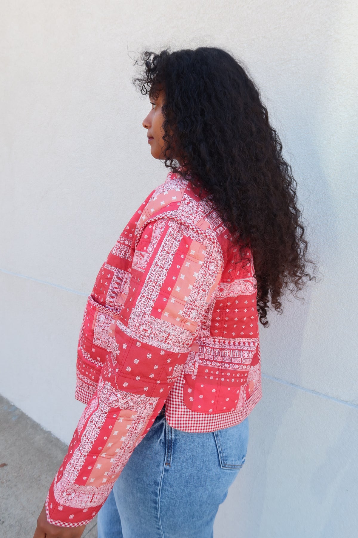 Make a bold statement with the Red Bandana Patchwork Quilted Jacket. Crafted from vibrant red bandana fabrics in a unique patchwork design, this quilted jacket offers both warmth and style. Perfect for layering, it adds a touch of edgy charm to any outfit while keeping you cozy on cooler days. Elevate your outerwear collection with this standout piece that blends classic bandana patterns with modern quilting craftsmanship.