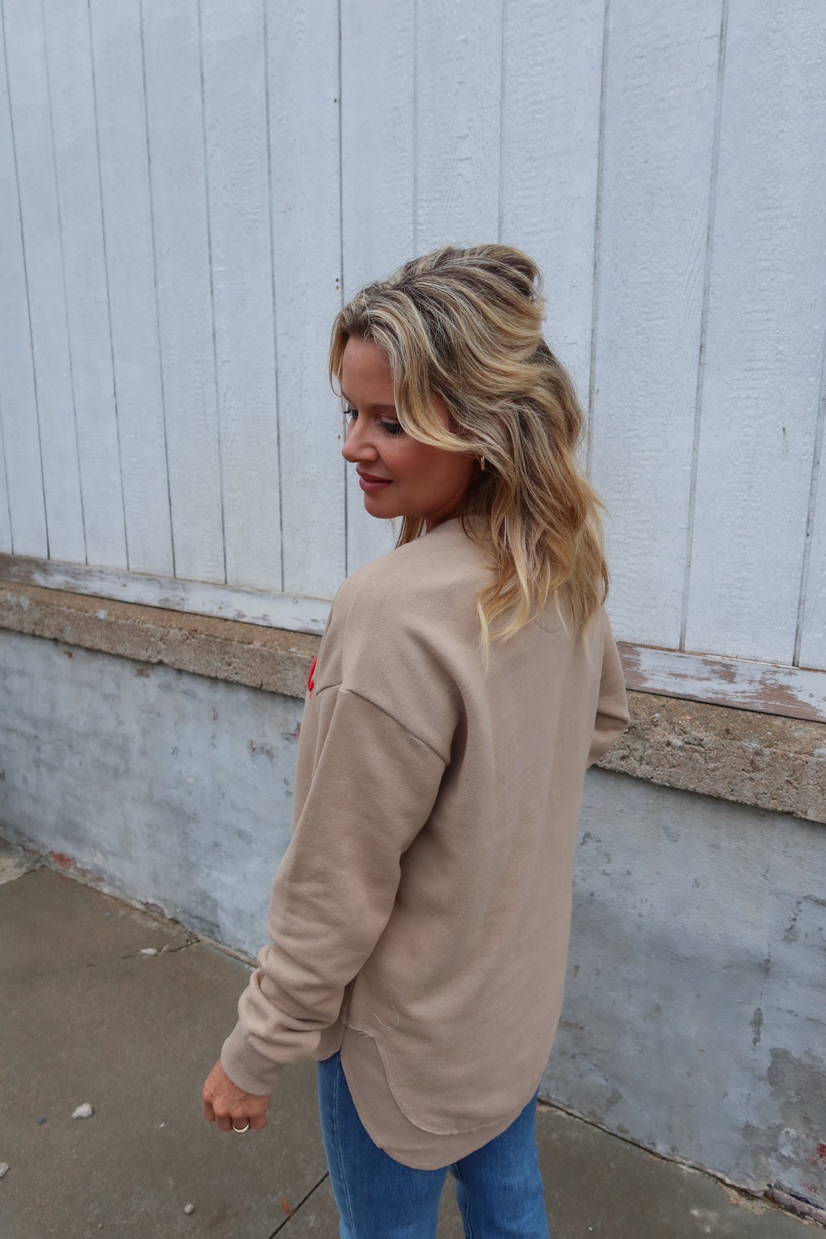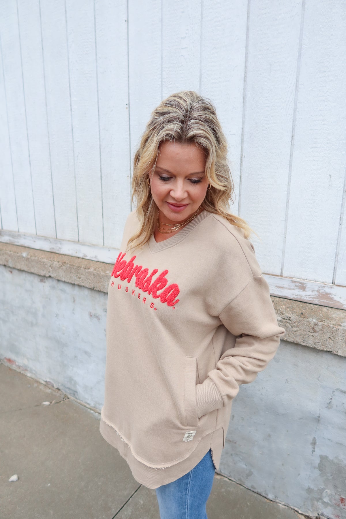 Stay comfortable and showcase your pride with the Licensed Apparel Sand Nebraska Sweatshirt. Featuring a flattering V-neck and detailed embroidered lettering, this sweatshirt blends style with school spirit. Convenient pockets add practicality, perfect for keeping essentials close or warming your hands. Ideal for game days or casual outings, it offers both comfort and a subtle touch of sophistication.