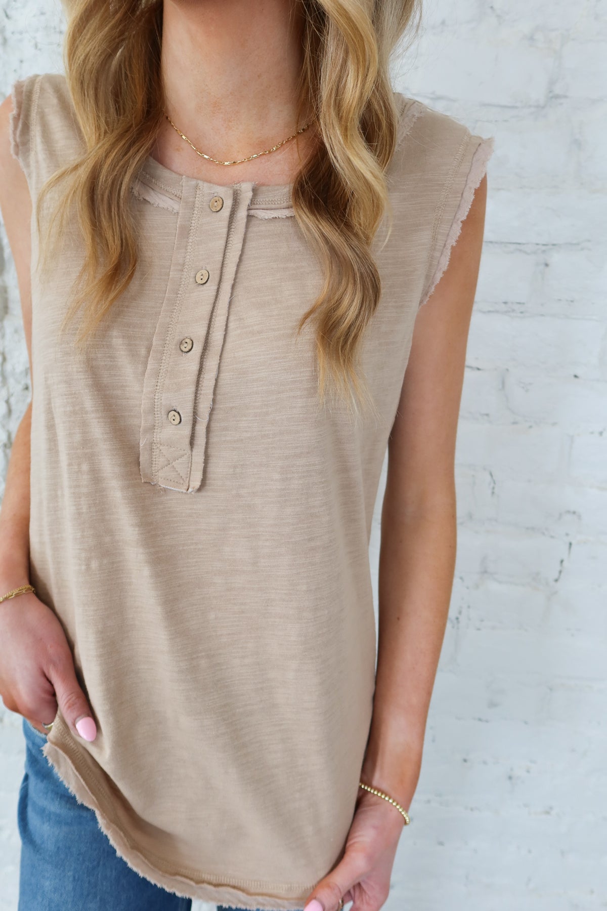 Effortless style meets understated elegance with this taupe raw edge tank top. The relaxed fit and soft neutral tone work seamlessly into any wardrobe, while the distinctive raw edges add an edgy, contemporary touch. A half button detail at the front provides versatile styling options—wear it open for a layered look or buttoned for a polished finish. Perfect for casual days or dressed up with tailored pieces, this tank delivers modern sophistication without trying too hard.