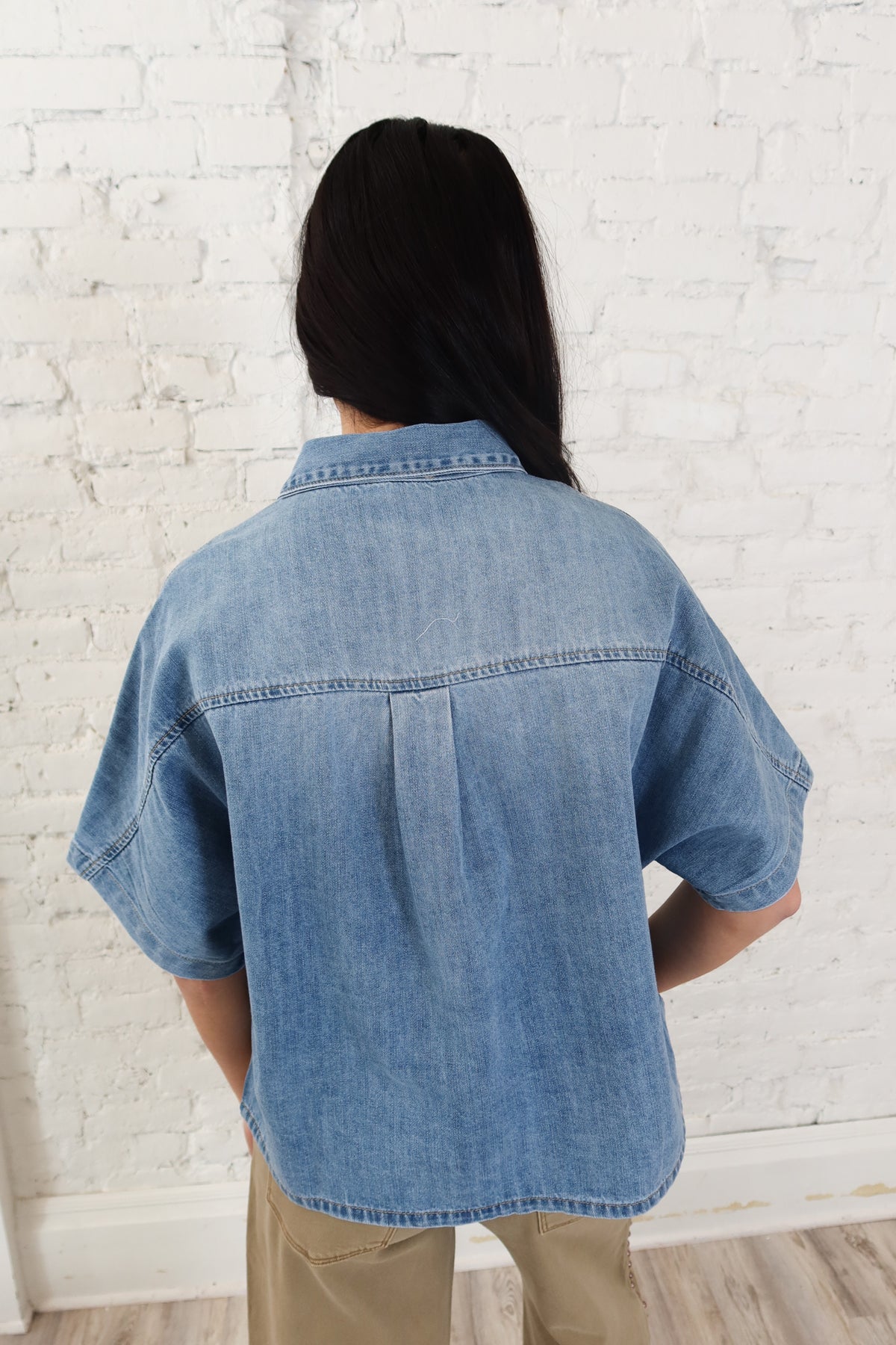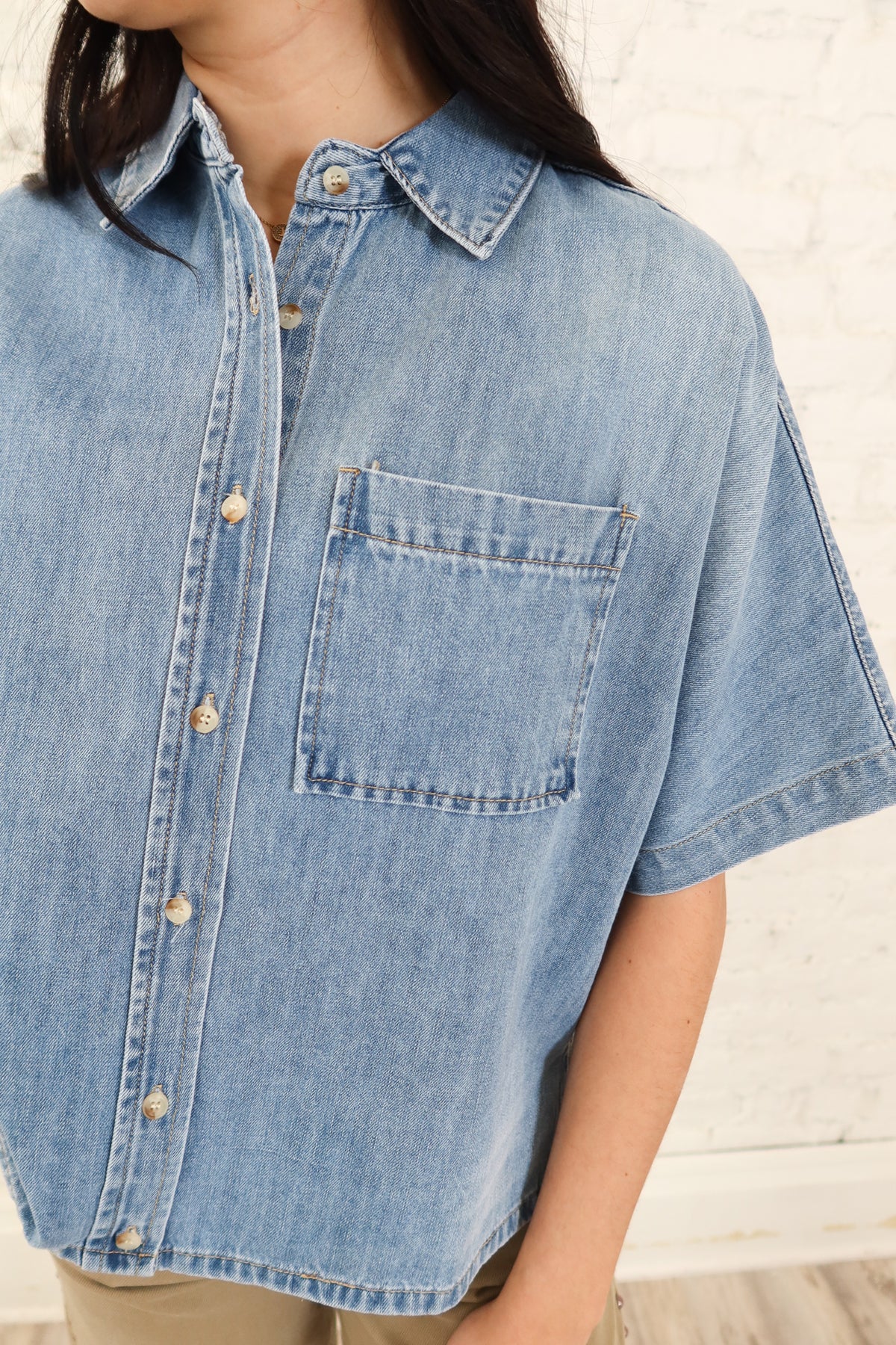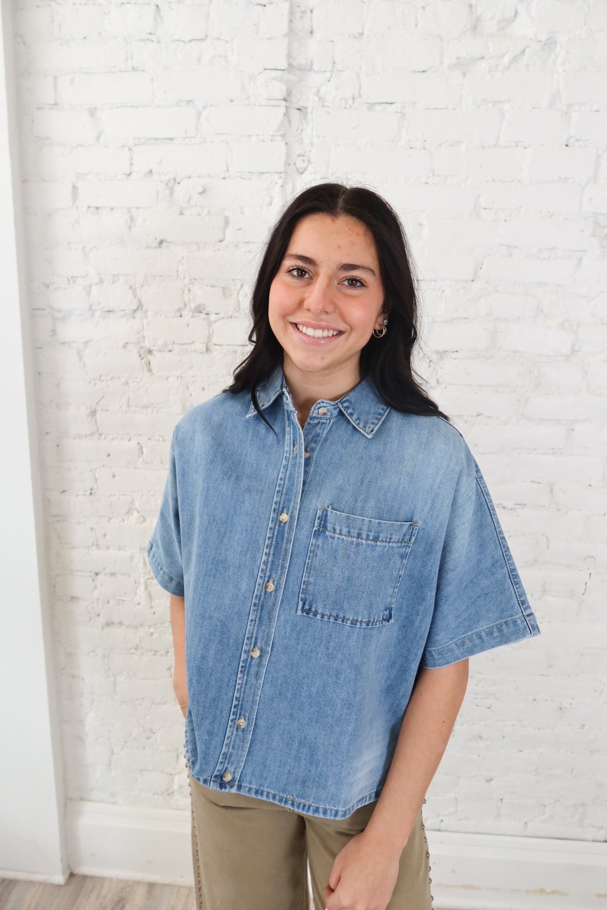 Effortlessly chic and undeniably versatile, this light wash denim top delivers relaxed style with intentional details. The boxy silhouette flatters every frame while the charming front pocket adds functional flair. Perfect for layering or wearing solo, this wardrobe essential transitions seamlessly from casual weekends to laid-back weekday looks. Pair it with your favorite jeans, skirts, or shorts for endless styling possibilities that feel fresh and current.