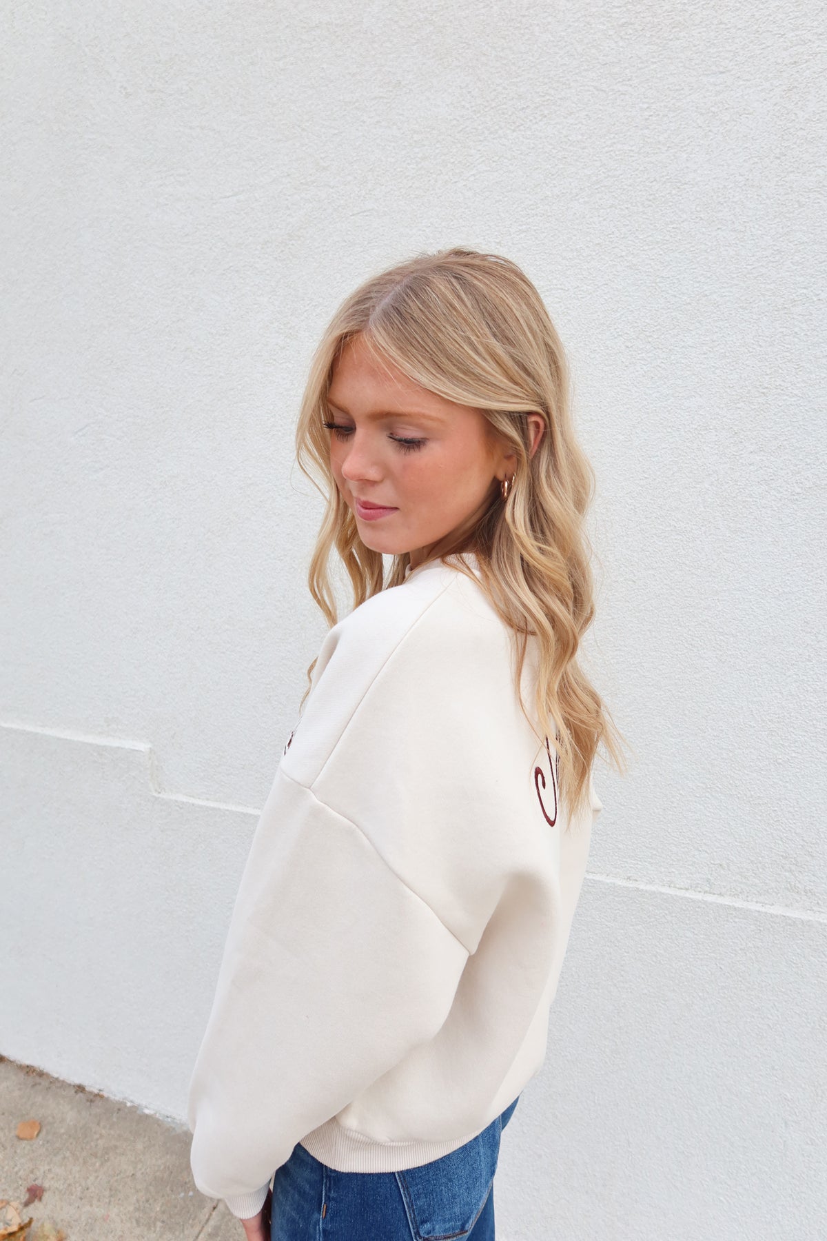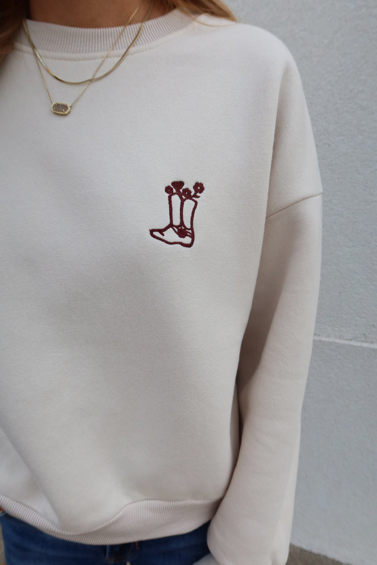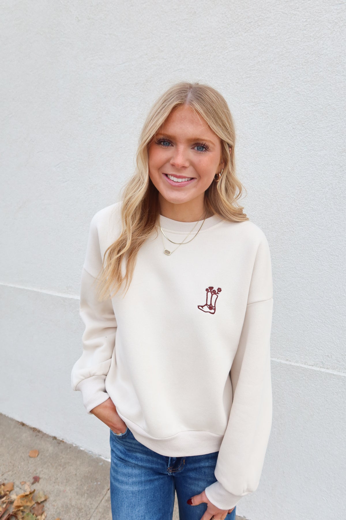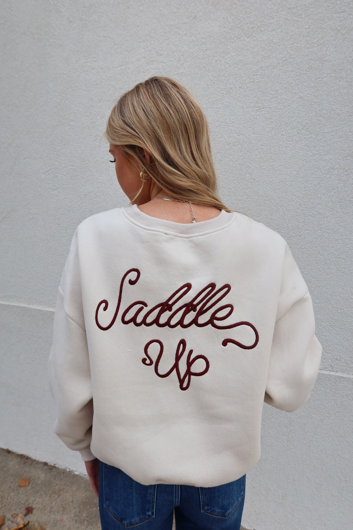 Wrap yourself in comfort with the Cream Saddle Up Sweatshirt, crafted from luxuriously soft, cozy fabric that feels like a warm embrace. Delicate embroidered details add a touch of Western-inspired charm and personality to this versatile piece. Perfect for casual days or layering, this sweatshirt combines effortless style with the comfort you crave.