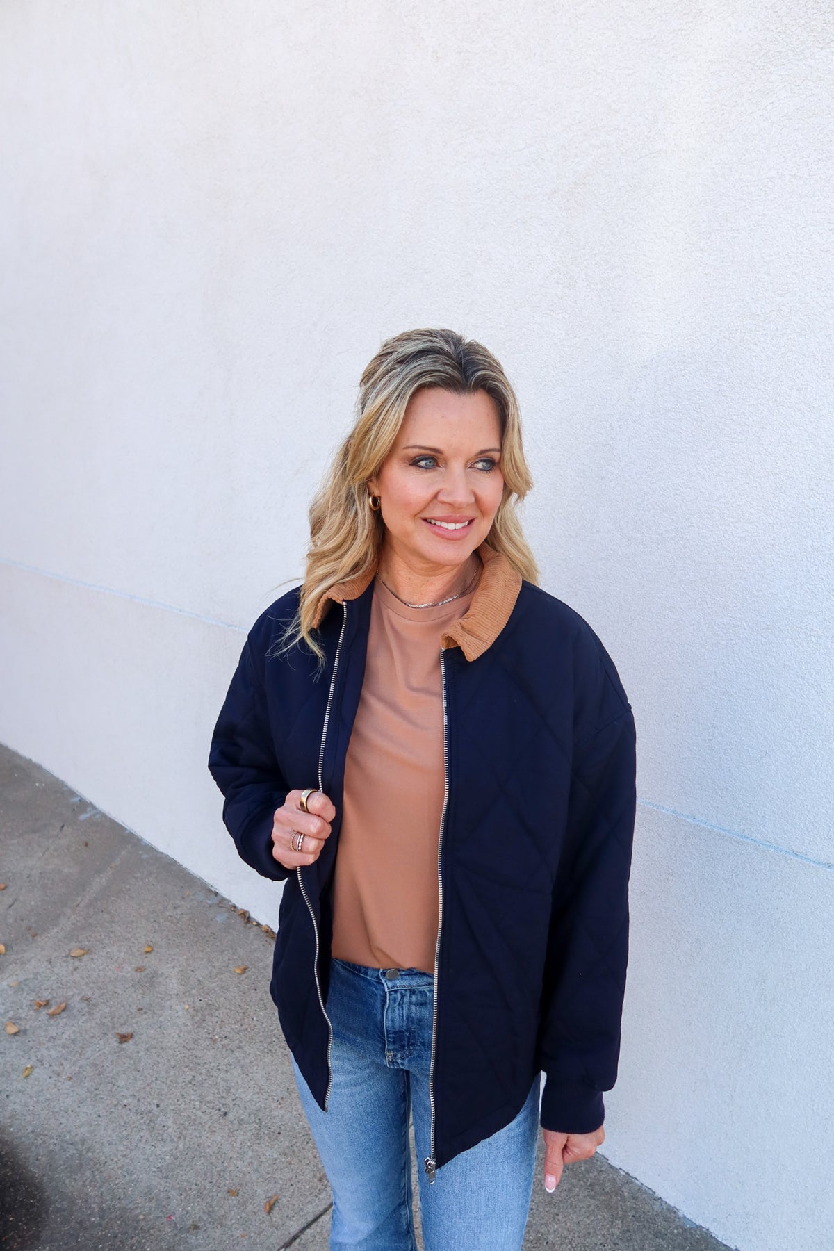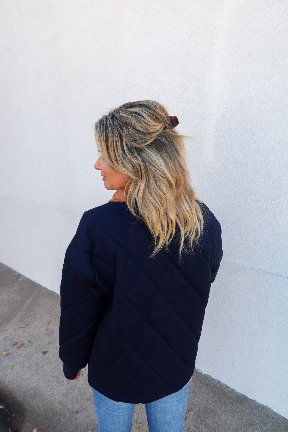 Embrace effortless warmth with this navy quilted jacket, featuring a rich brown corduroy collar that adds timeless charm. The smooth zip-up front makes layering simple, while two functional pockets keep your essentials close. Crafted with a cozy, relaxed fit that feels like a warm hug, this barn-inspired piece transitions seamlessly from casual weekends to everyday adventures. Perfect for those who value comfort without compromising on style.