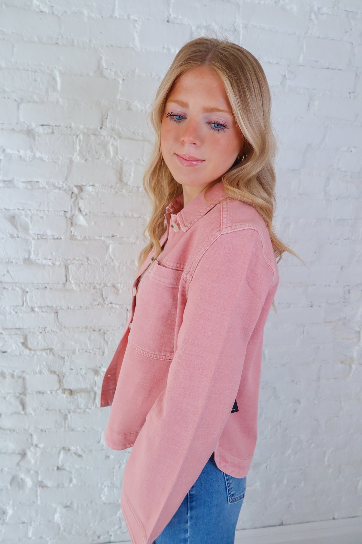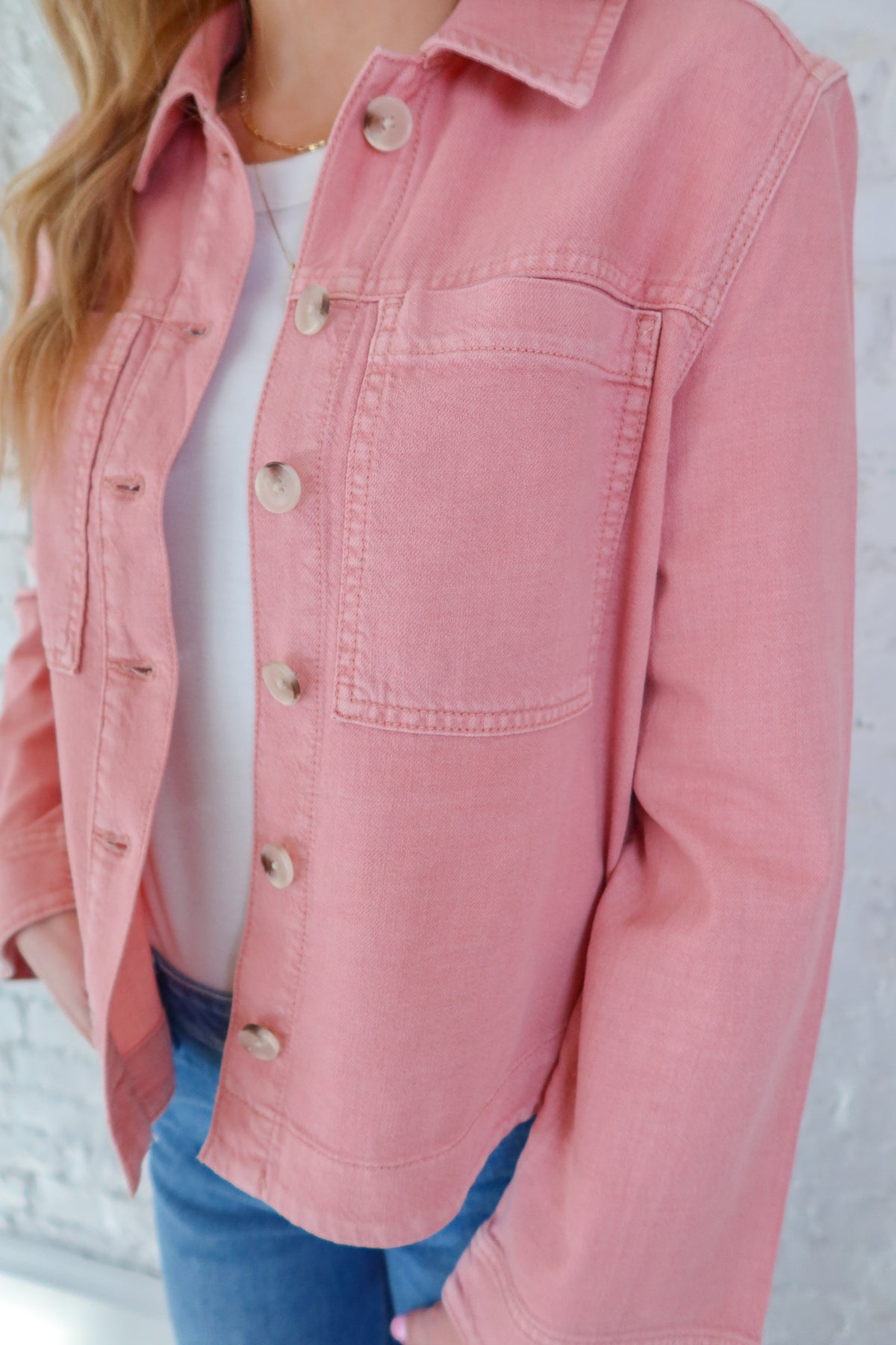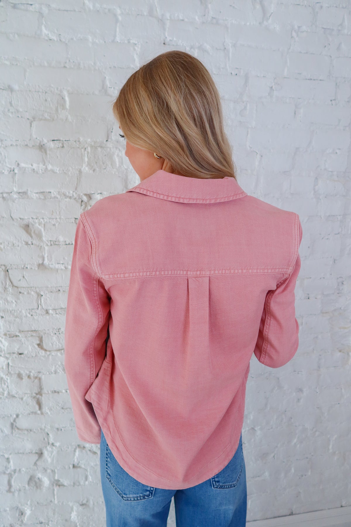 Effortlessly transition between seasons with this versatile Liverpool Misty Blush Denim Shacket—the perfect layering piece that bridges casual and polished style. Crafted from quality denim in a soft, flattering misty blush tone, this shacket works as a standalone jacket or lightweight layer over your favorite tees and dresses. The relaxed fit and classic silhouette make it a wardrobe essential that pairs seamlessly with everything from jeans to skirts. Invest in a piece that delivers both comfort and timeless appeal.