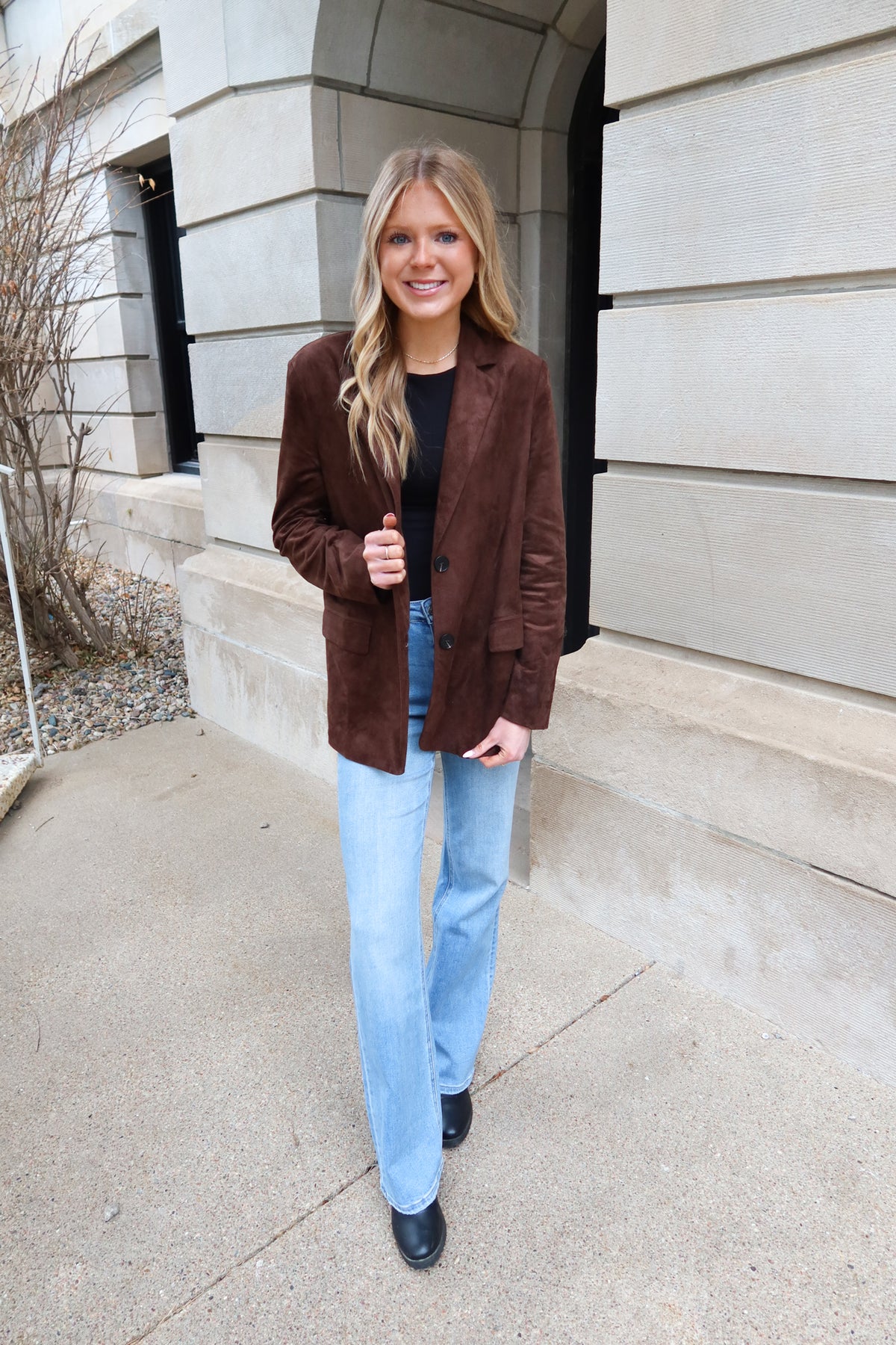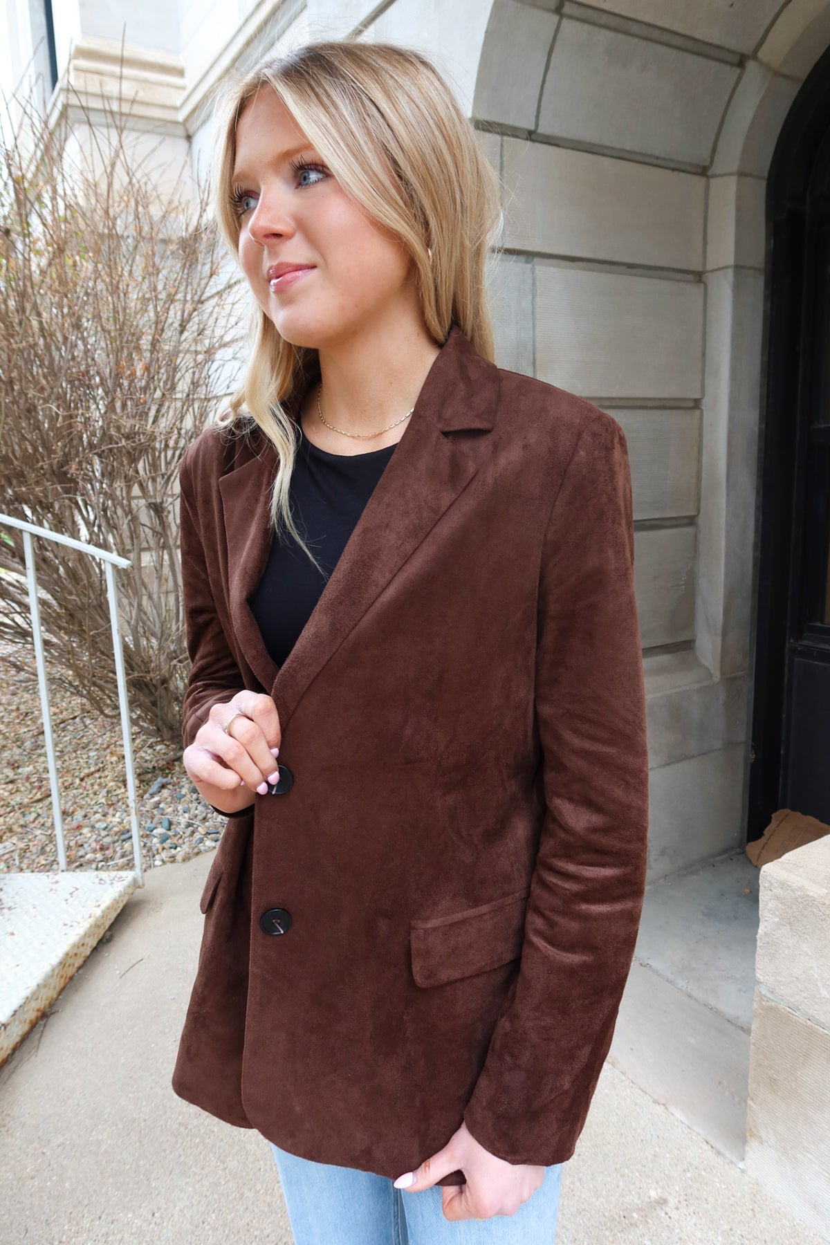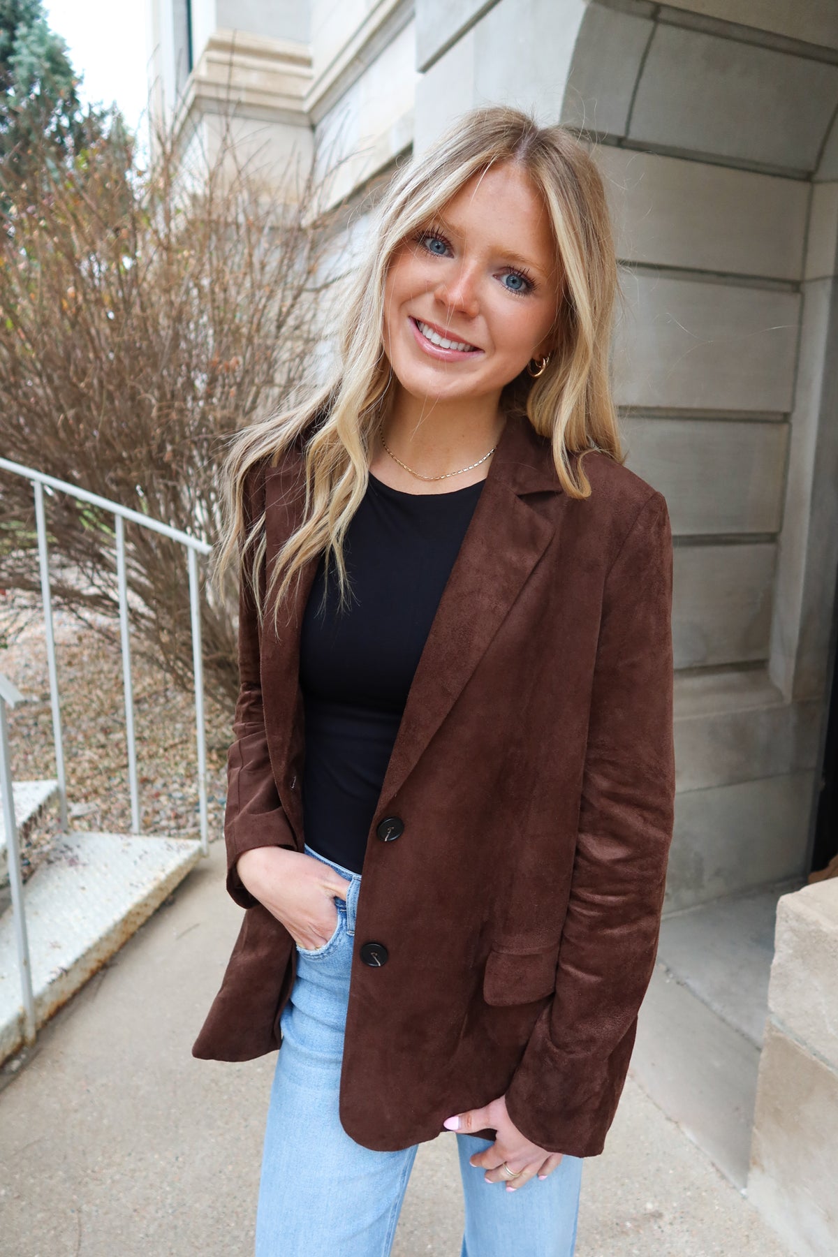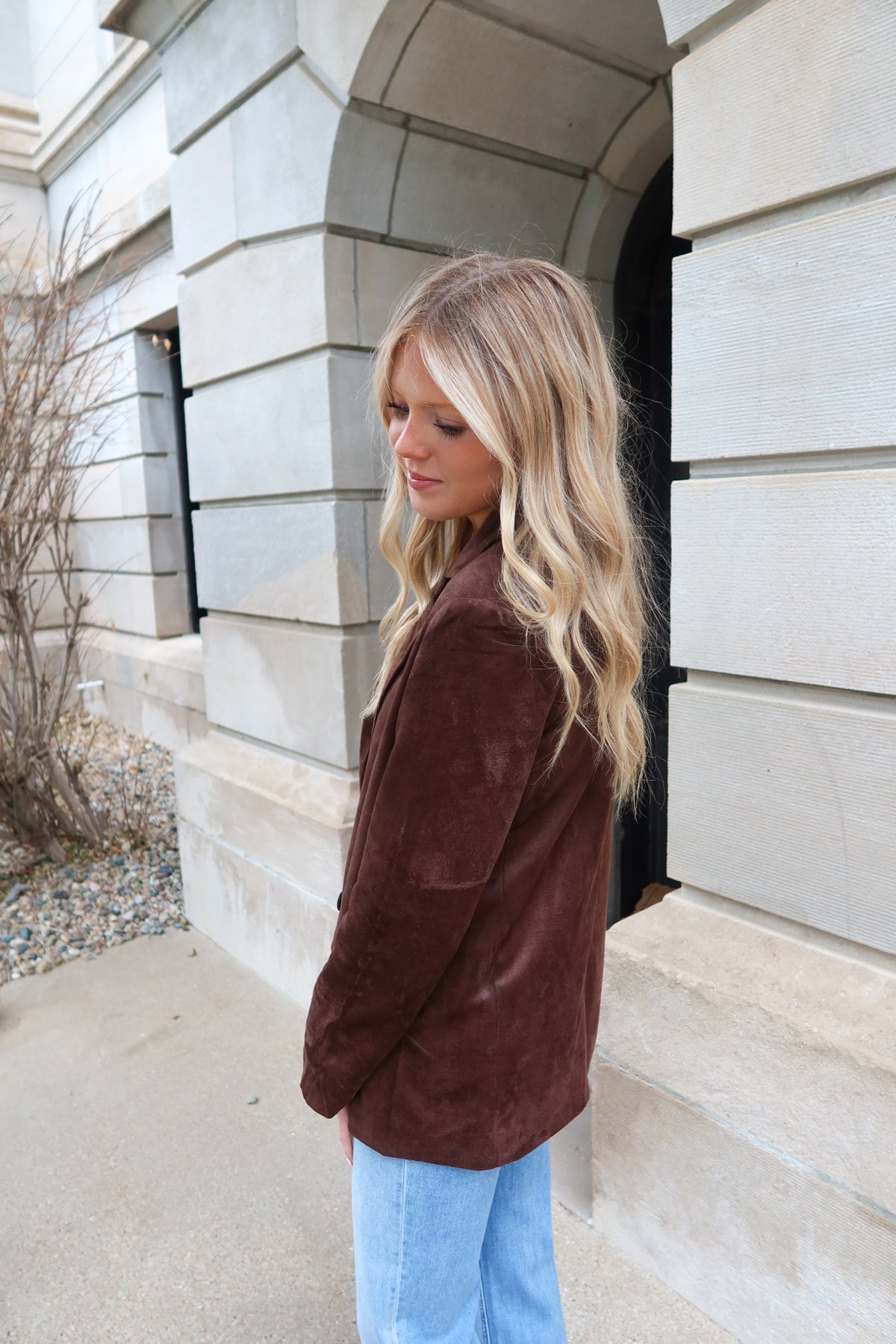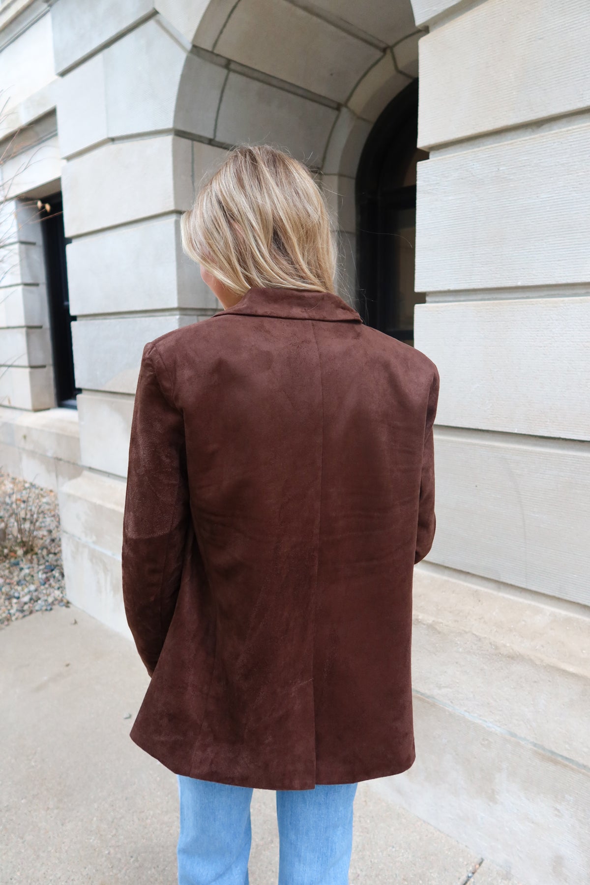 Elevate your wardrobe with the Espresso Suede Blazer Jacket—an irresistible blend of sophisticated style and plush comfort. Crafted from rich suede, this jacket adds a warm, luxurious touch to any outfit. Its tailored fit enhances your silhouette, making it perfect for both work and evening occasions. Timeless and versatile, this blazer transforms your look with effortless elegance and lasting appeal. Step out confidently and make a statement wherever you go.