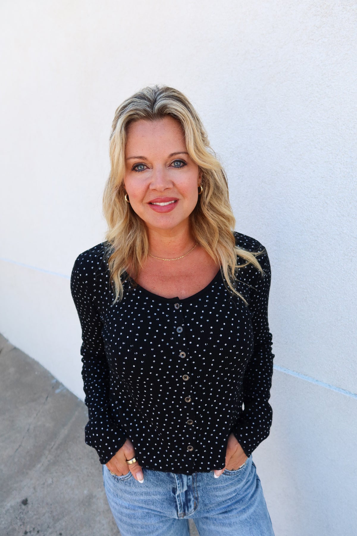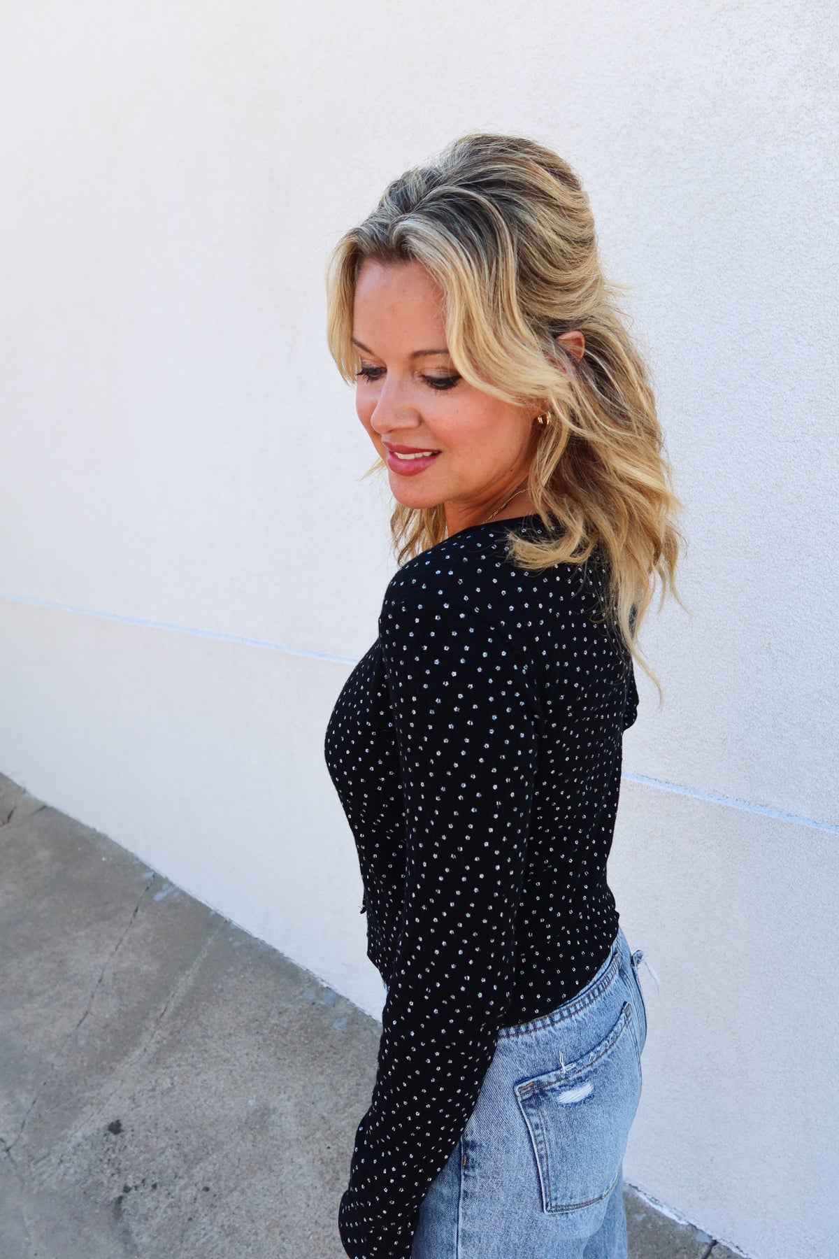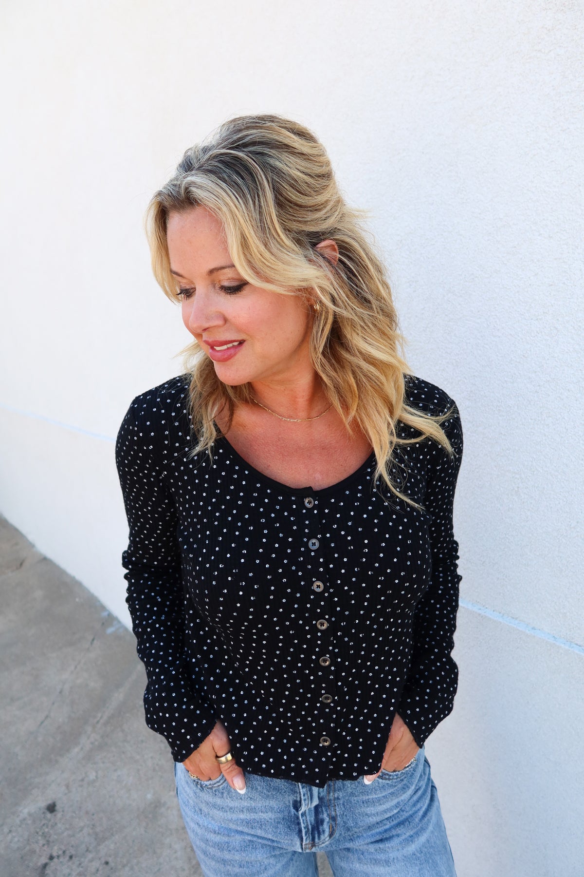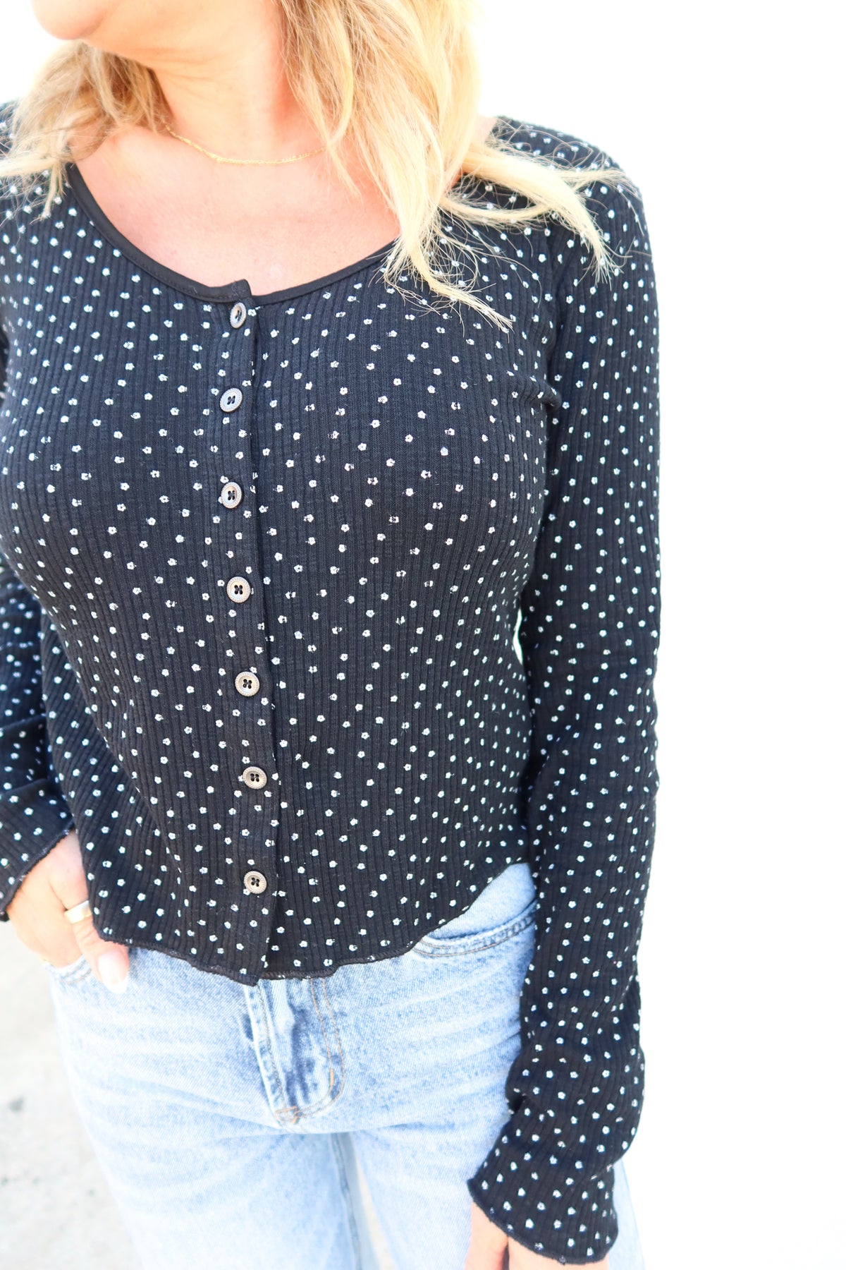 This Keep Me Close black top features a flattering swoop neckline and a charming front button detail. The subtle ribbed texture adds depth, while the small white daisy print provides a fresh, delicate touch. Perfect for effortless everyday style, it combines comfort with a hint of playful elegance.