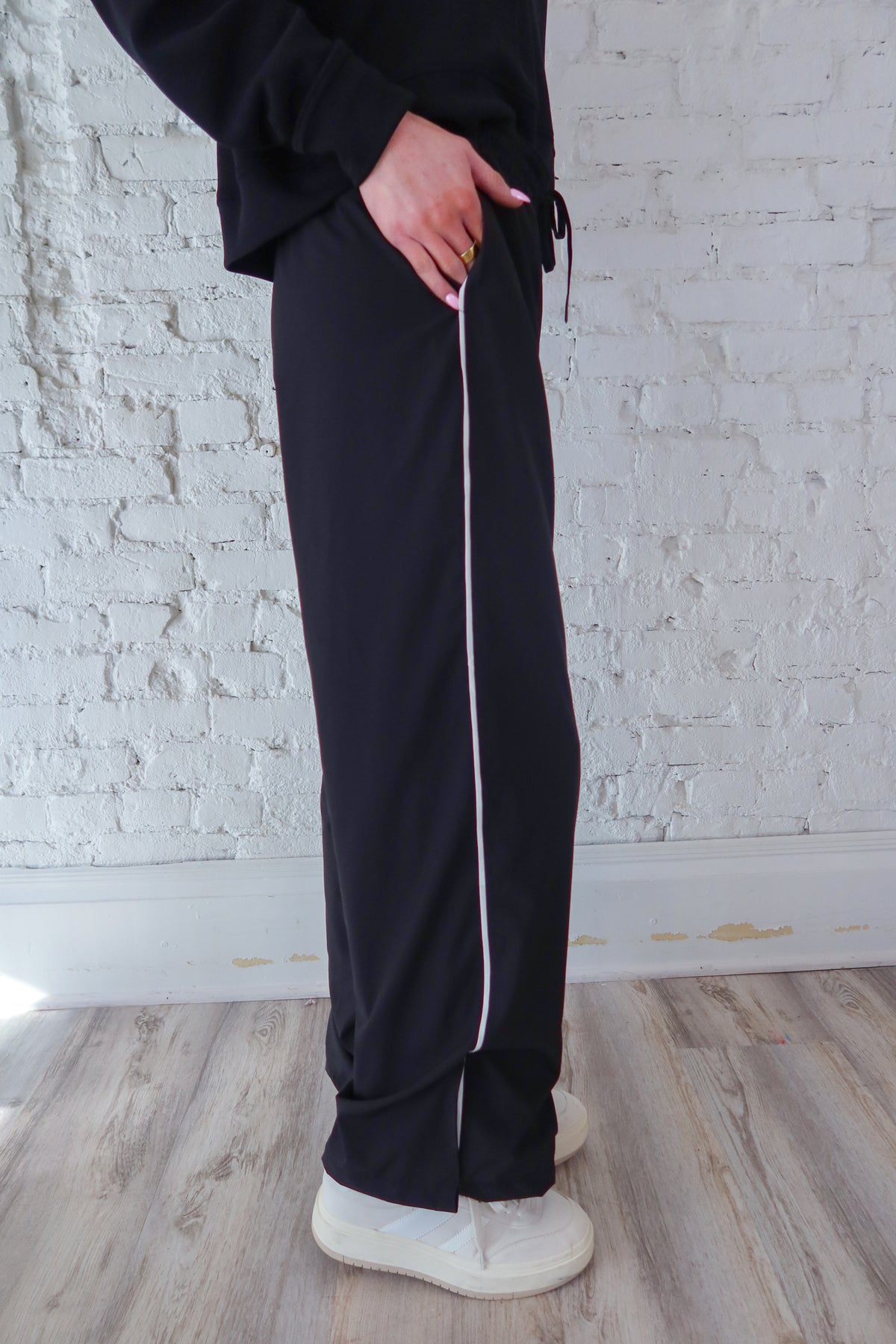Black Finish Line Track Pant Elevate your athletic wardrobe with these sleek black track pants designed for performance and style. Engineered with a streamlined silhouette, they move seamlessly from gym sessions to casual outings. The classic black finish pairs effortlessly with any top, while the structured fit provides comfort without compromise. Whether you're training hard or keeping it laid-back, these track pants deliver the versatility and polished look you've been searching for.