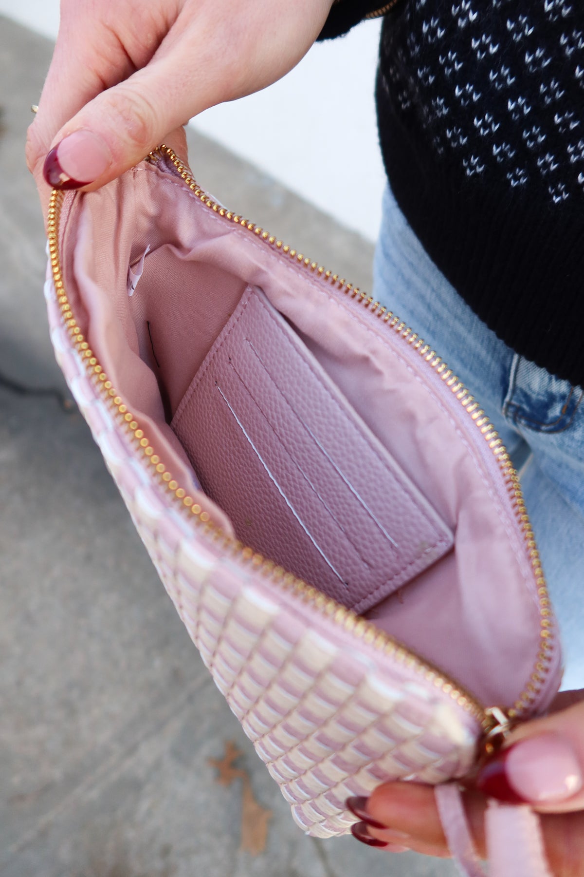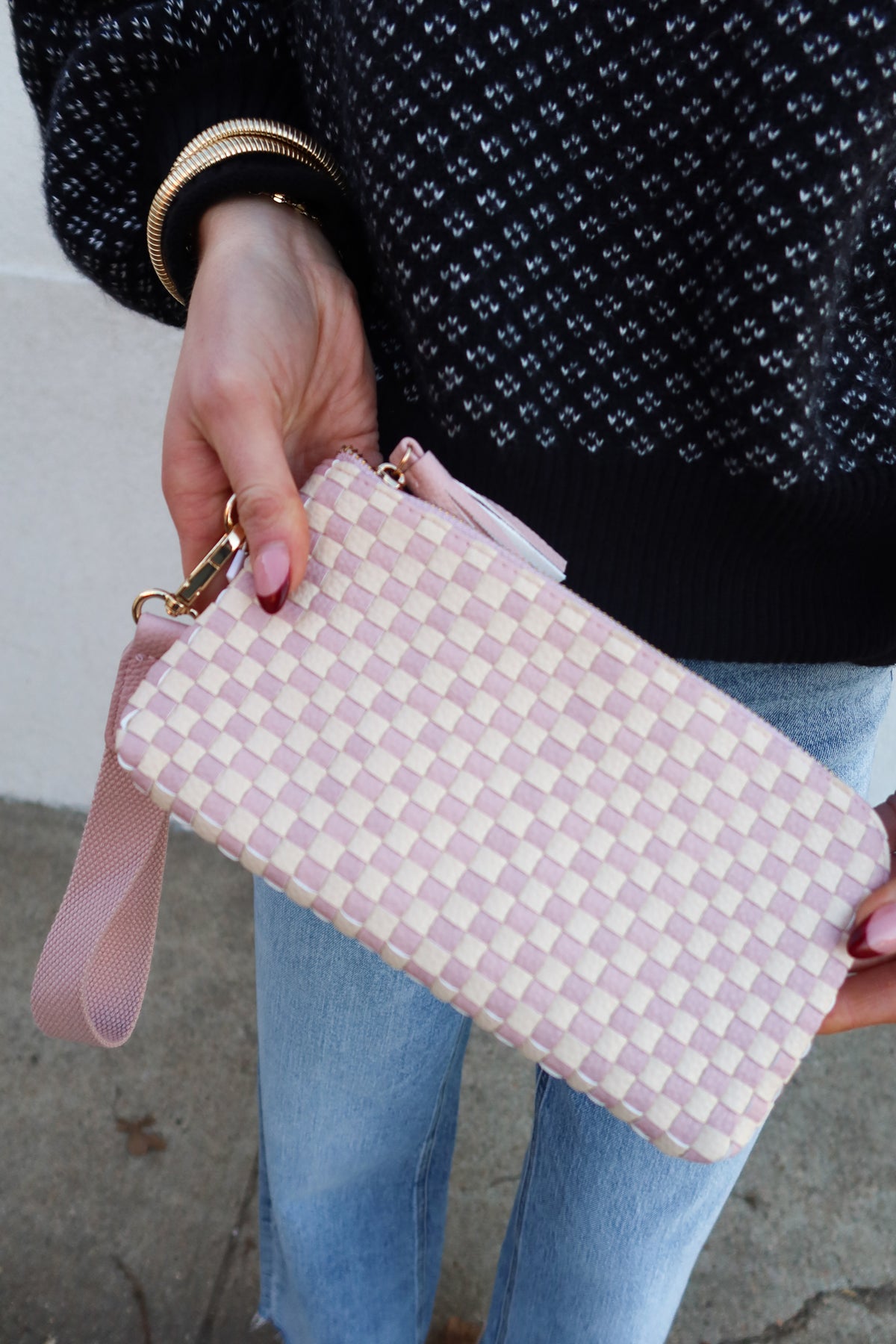 Carry your essentials with confidence in this versatile Emma Blush Woven Clutch Wristlet. The secure zip closure keeps your belongings safe, while the detachable wristlet strap offers flexible carrying options—wear it as a clutch or slip it on your wrist. Inside, dedicated wallet compartments organize cards, cash, and coins so everything stays exactly where you need it. Perfect for nights out, travel, or everyday errands, this stylish piece combines practicality with timeless appeal.