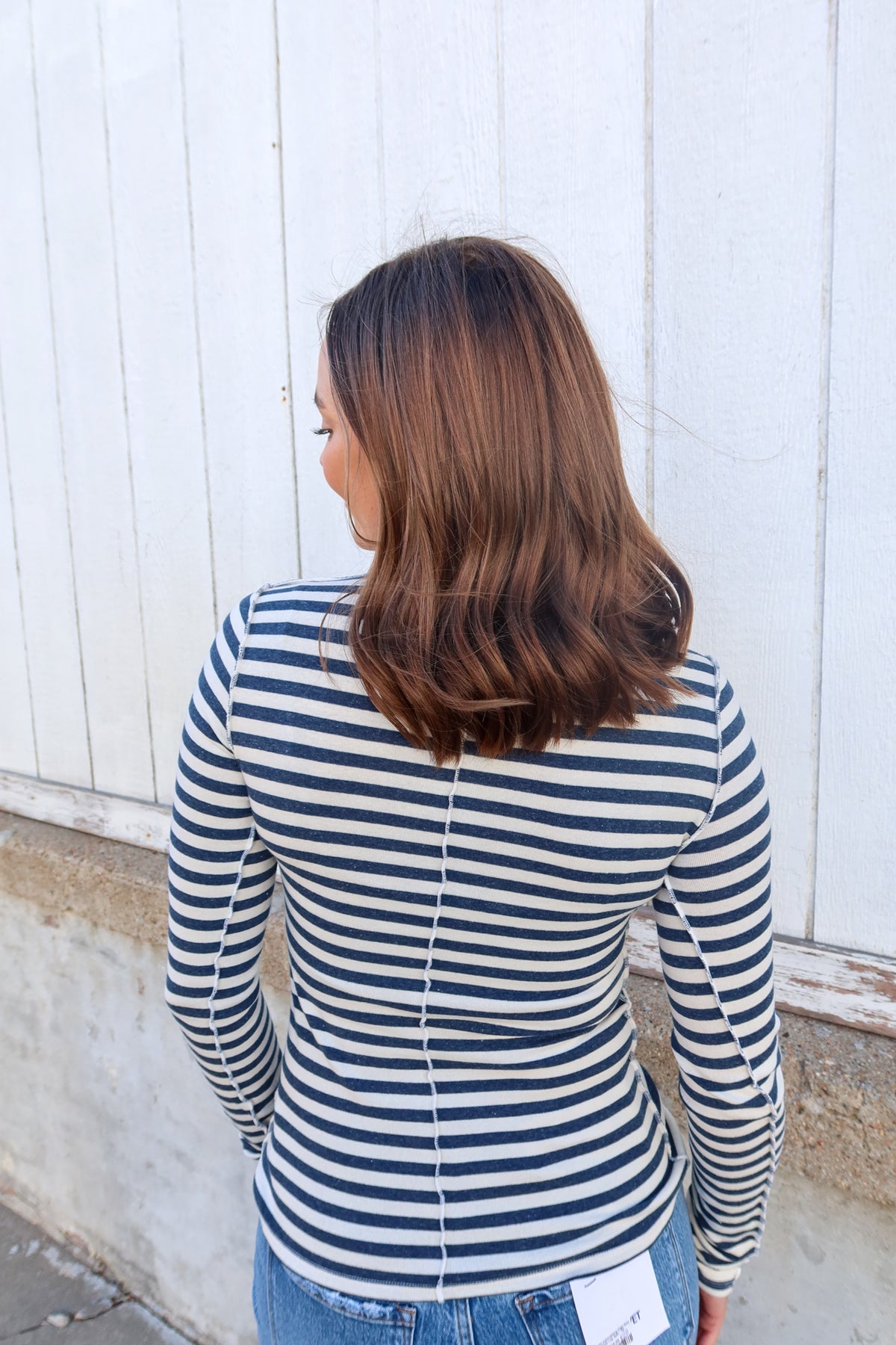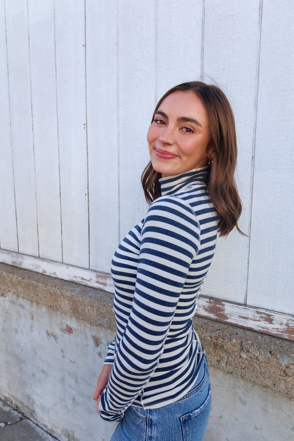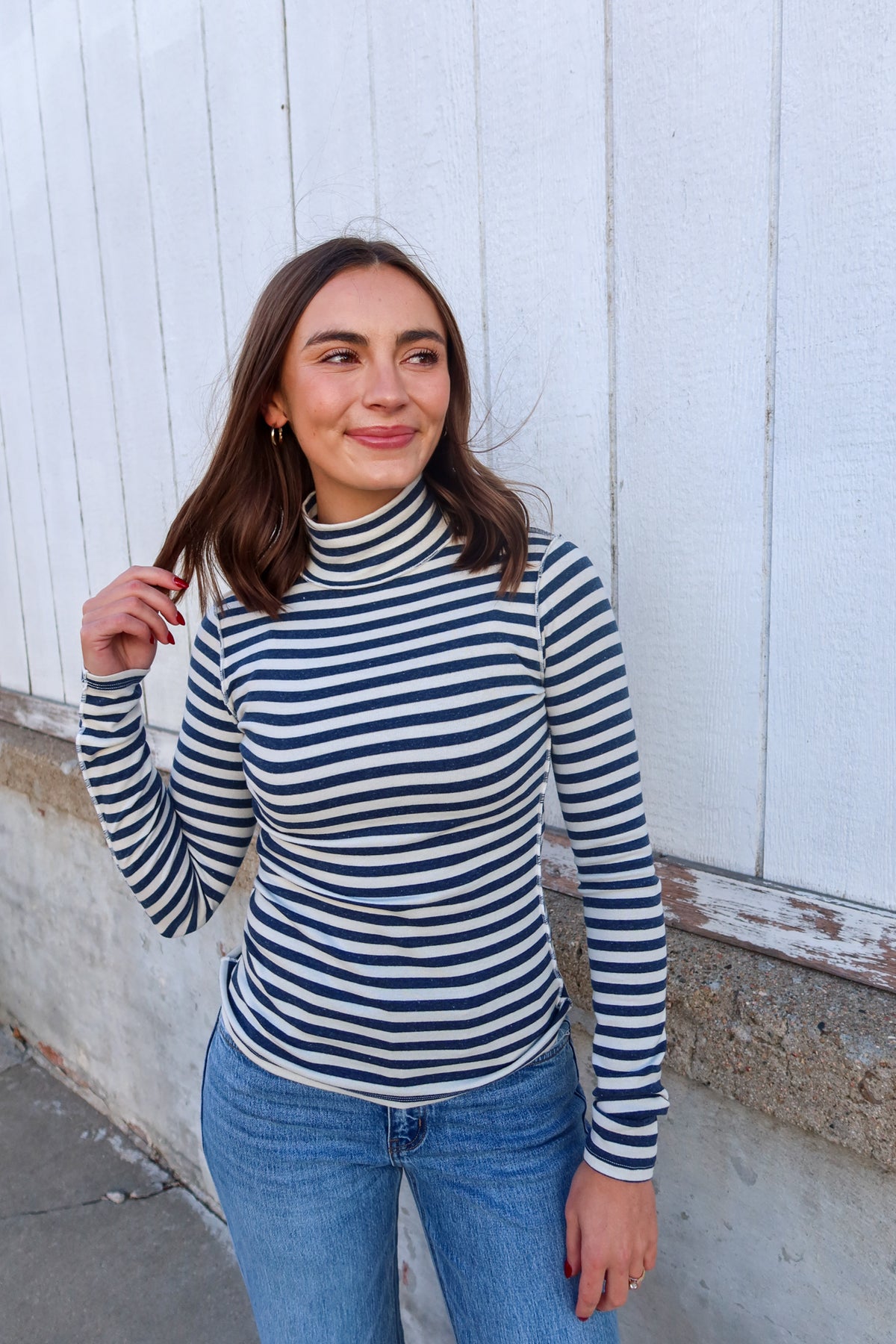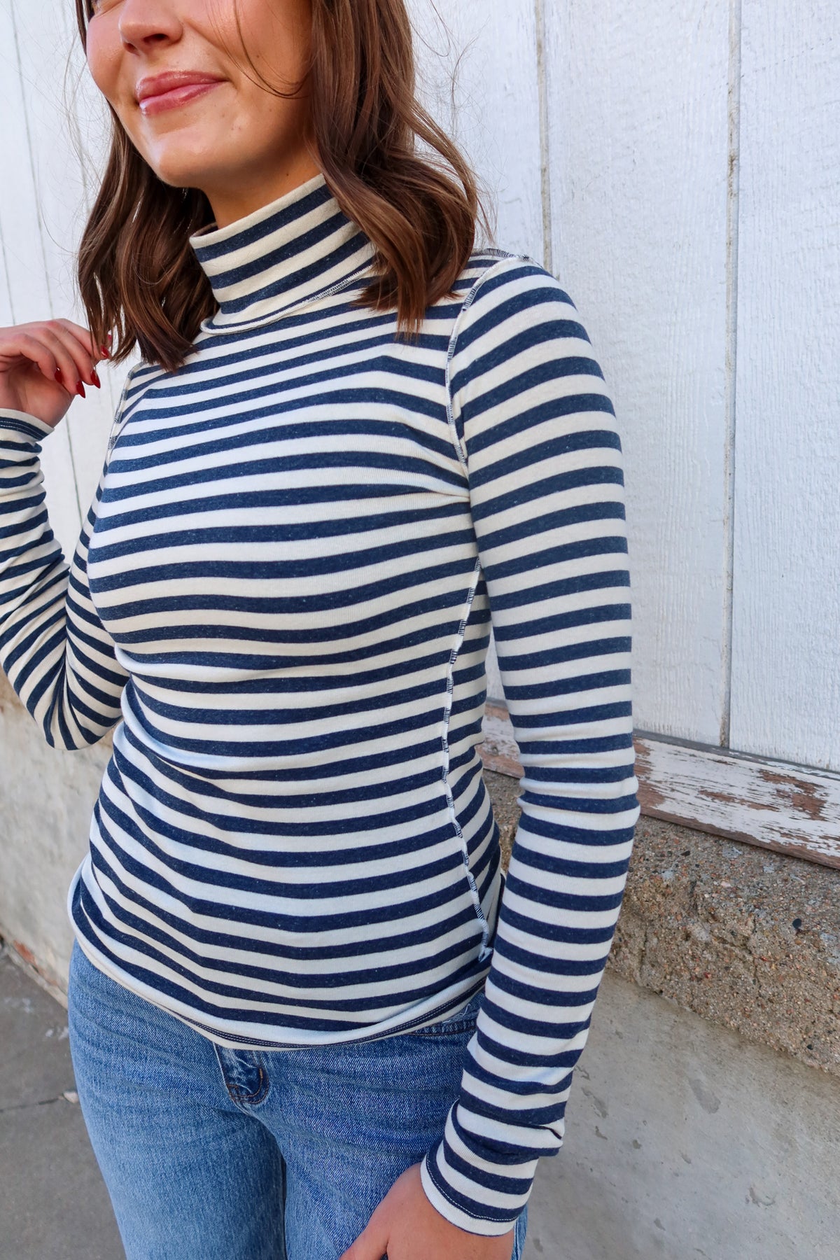 Timeless elegance meets everyday comfort in this classic striped turtleneck. The crisp ivory and navy palette brings nautical sophistication to any wardrobe, while the fitted turtleneck silhouette flatters and keeps you cozy through cooler months. Versatile enough to layer under blazers or wear solo, this wardrobe staple transitions seamlessly from casual weekends to polished office days. Quality construction ensures this piece will remain a go-to favorite for years to come. Embrace effortless style with a design that never goes out of fashion.