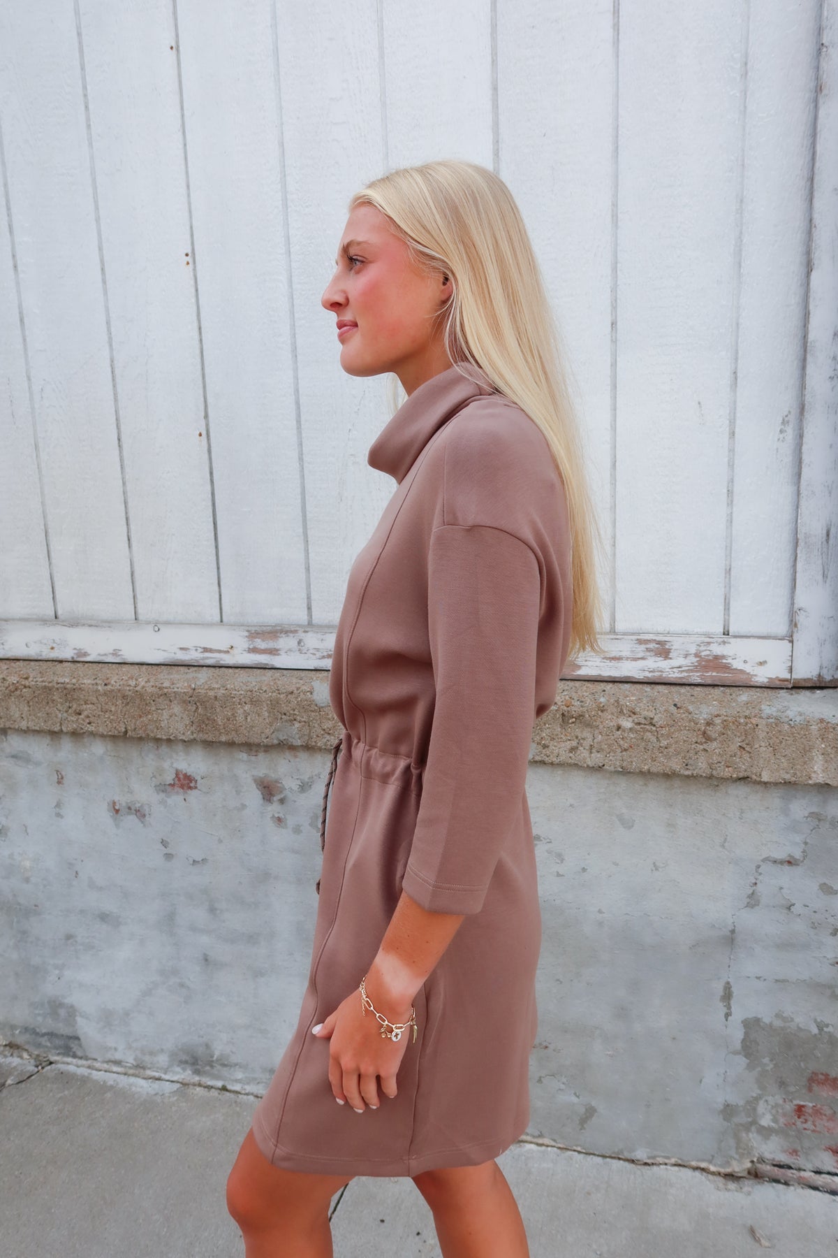 Experience effortless comfort and style with the Everyday Feeling Fossil 3/4 Sleeve Funnel Neck Dress. This modest dress features a cozy turtleneck and a flattering cinched waist, creating a sleek silhouette that moves with you. Perfect for everyday wear, it combines warmth and elegance for a confident look from day to night.