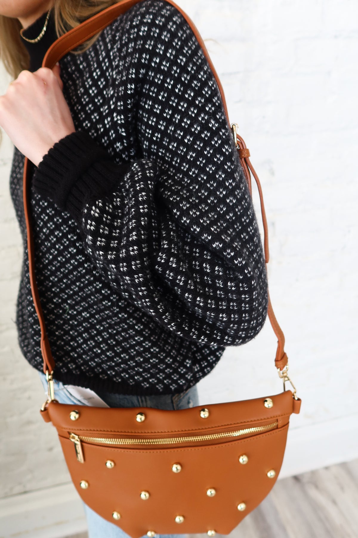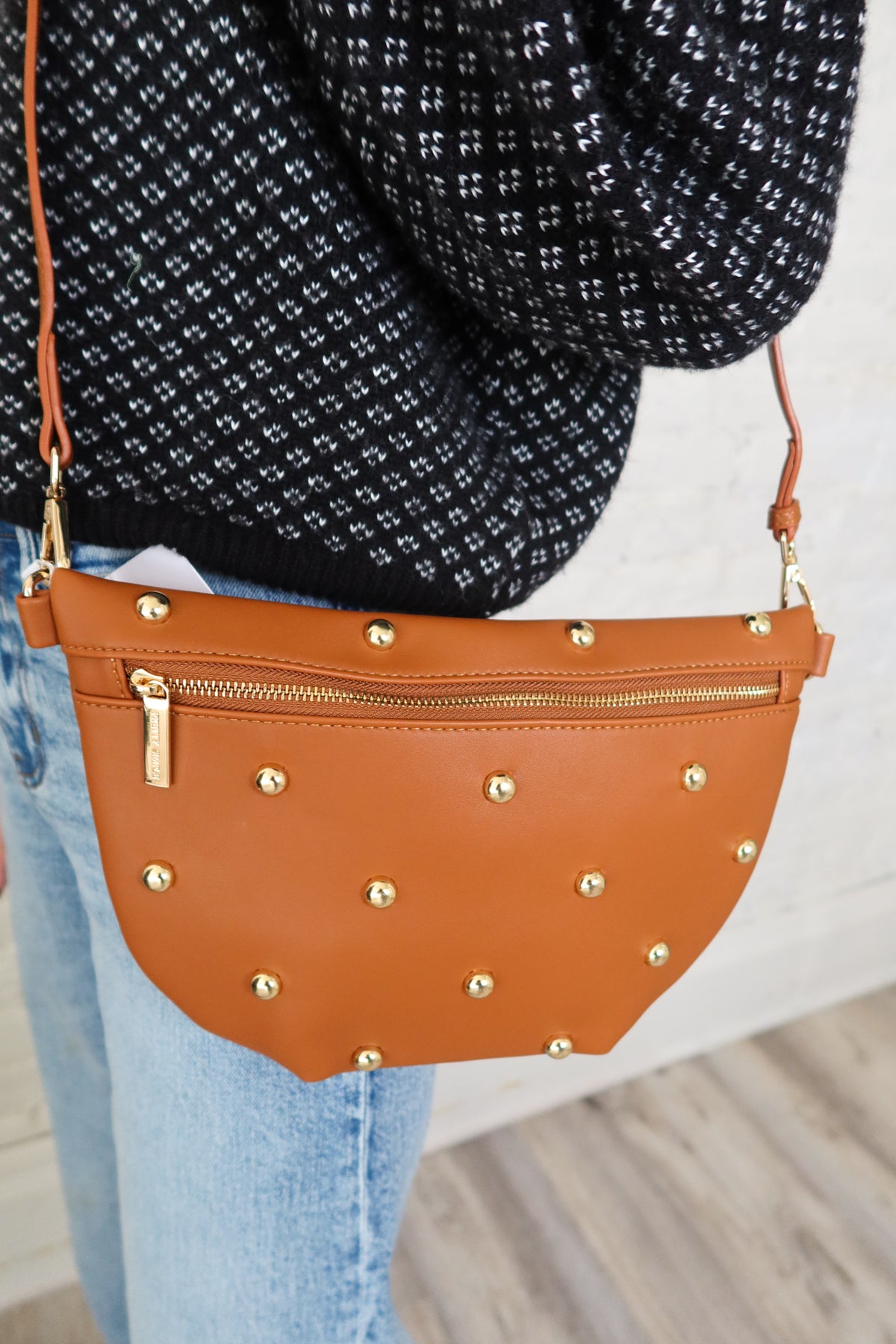 Elevate your everyday style with the Westlyn Tan Studded Bag, a sophisticated accessory that seamlessly transitions from day to night. Featuring luxe gold metal detailing and sturdy studded accents, this bag makes a bold fashion statement. The adjustable strap offers personalized comfort and versatility, while the secure zip closure keeps your essentials protected.