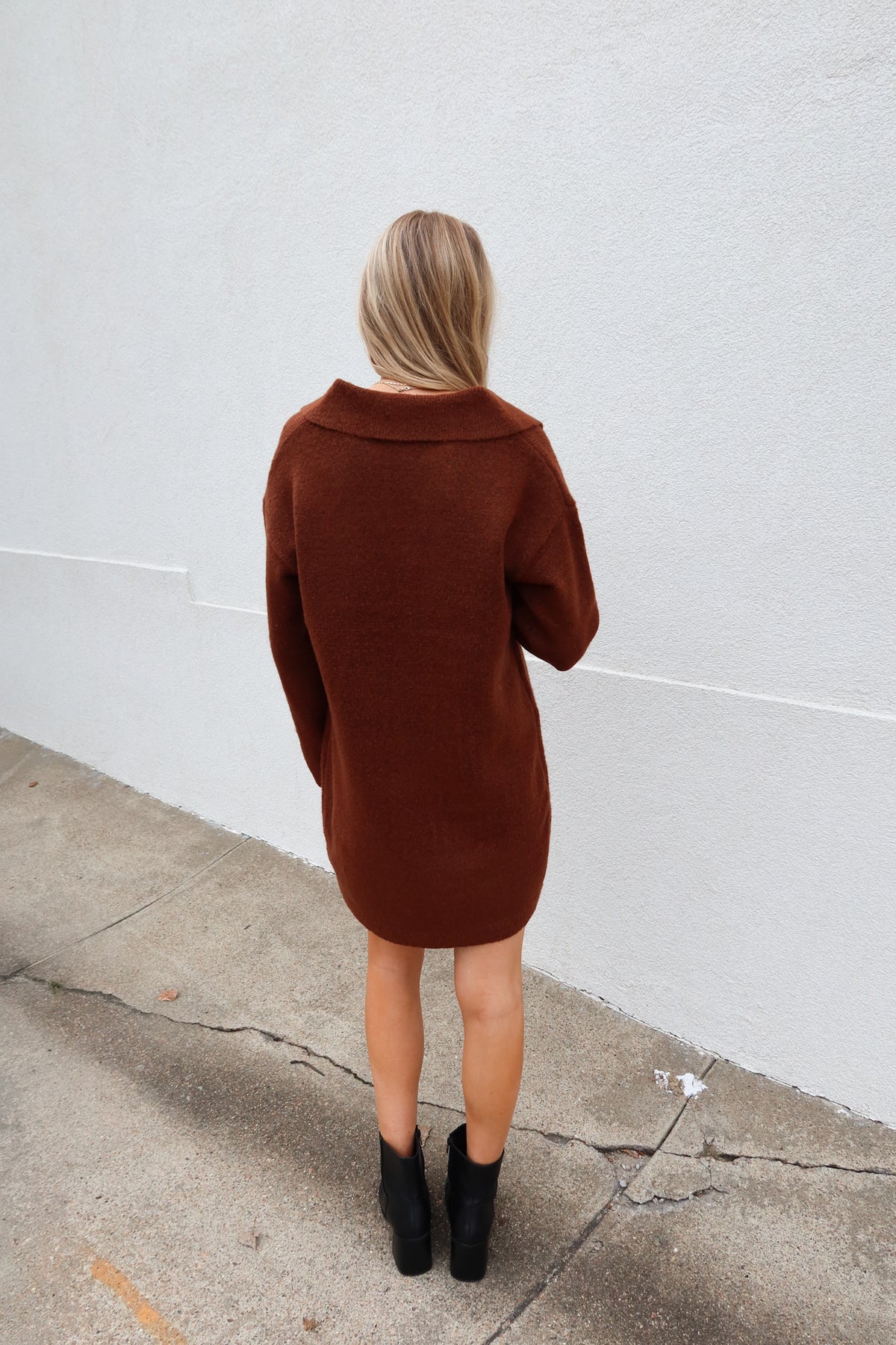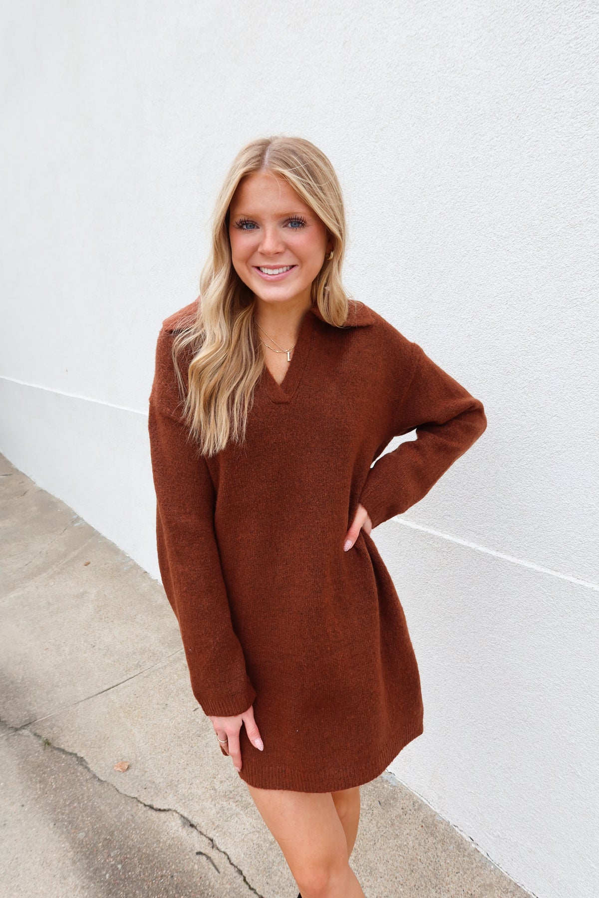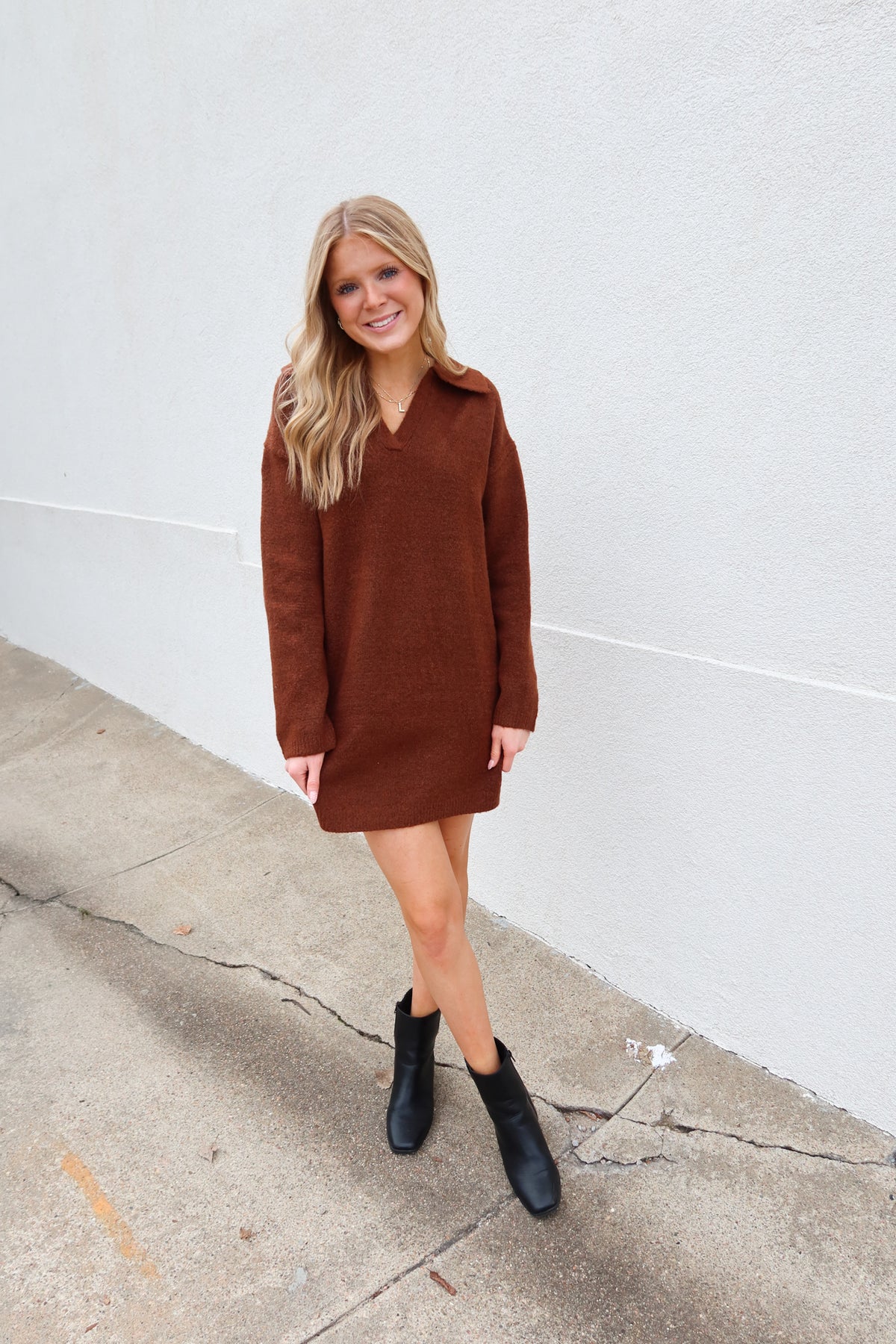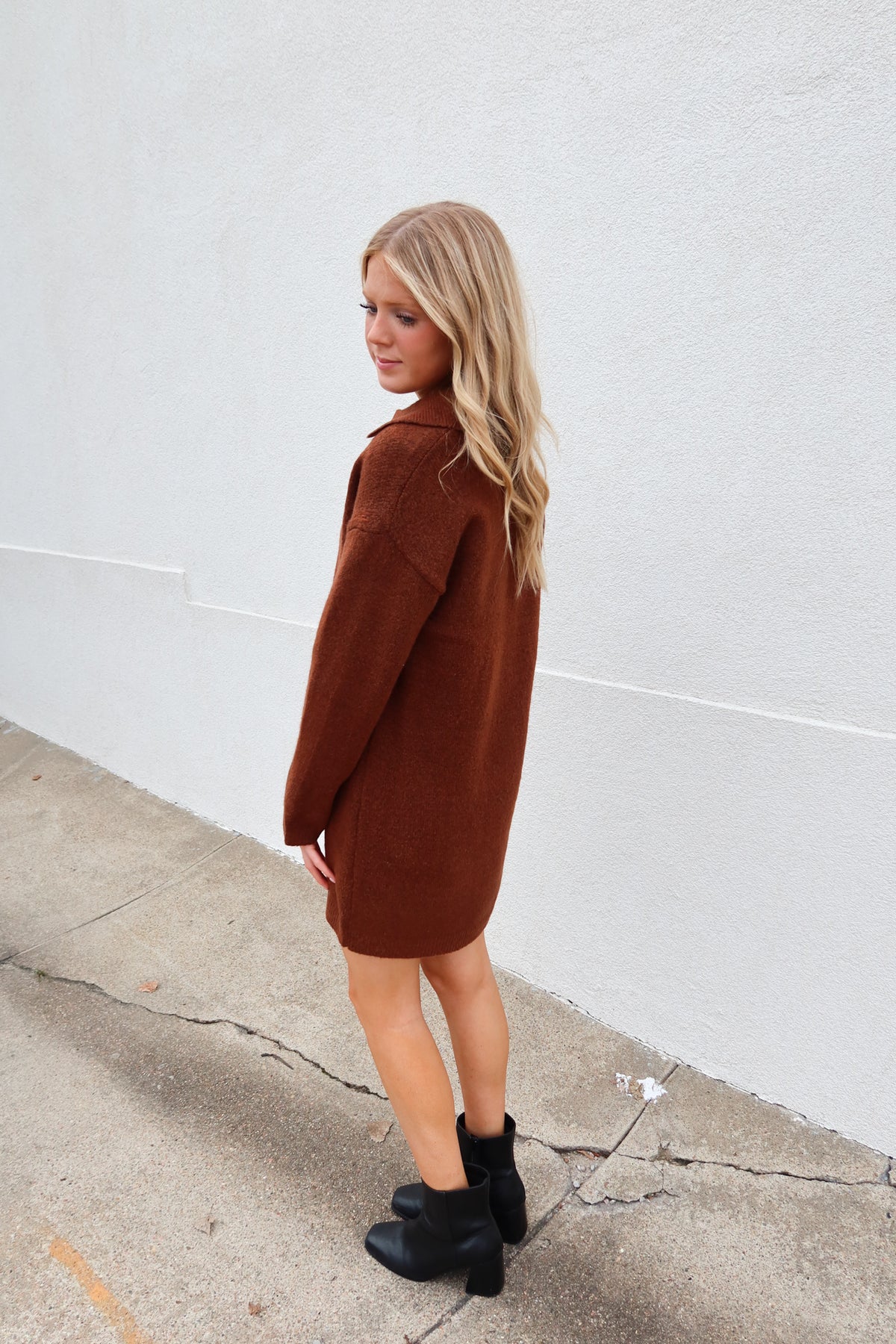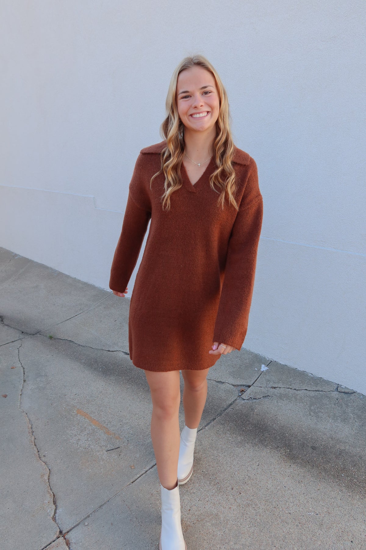Elevate your wardrobe with the Chestnut Collared Sweater Dress, a perfect blend of cozy comfort and timeless style. Its rich chestnut hue and classic collar create a polished look ideal for both casual outings and office settings. Crafted from soft, warm fabric, this dress keeps you comfortable all day while flattering your figure effortlessly. Embrace versatility and chic ease with a piece that transitions seamlessly from day to night.