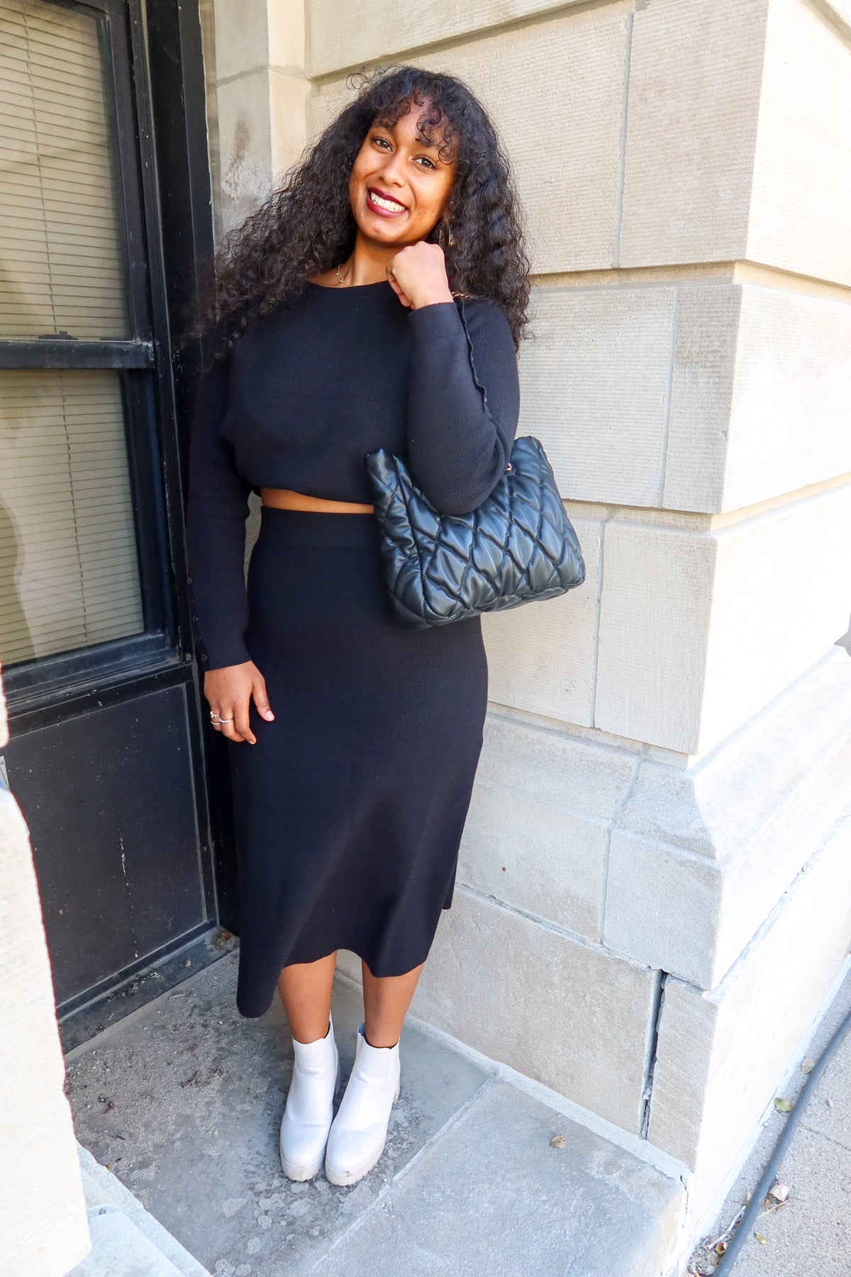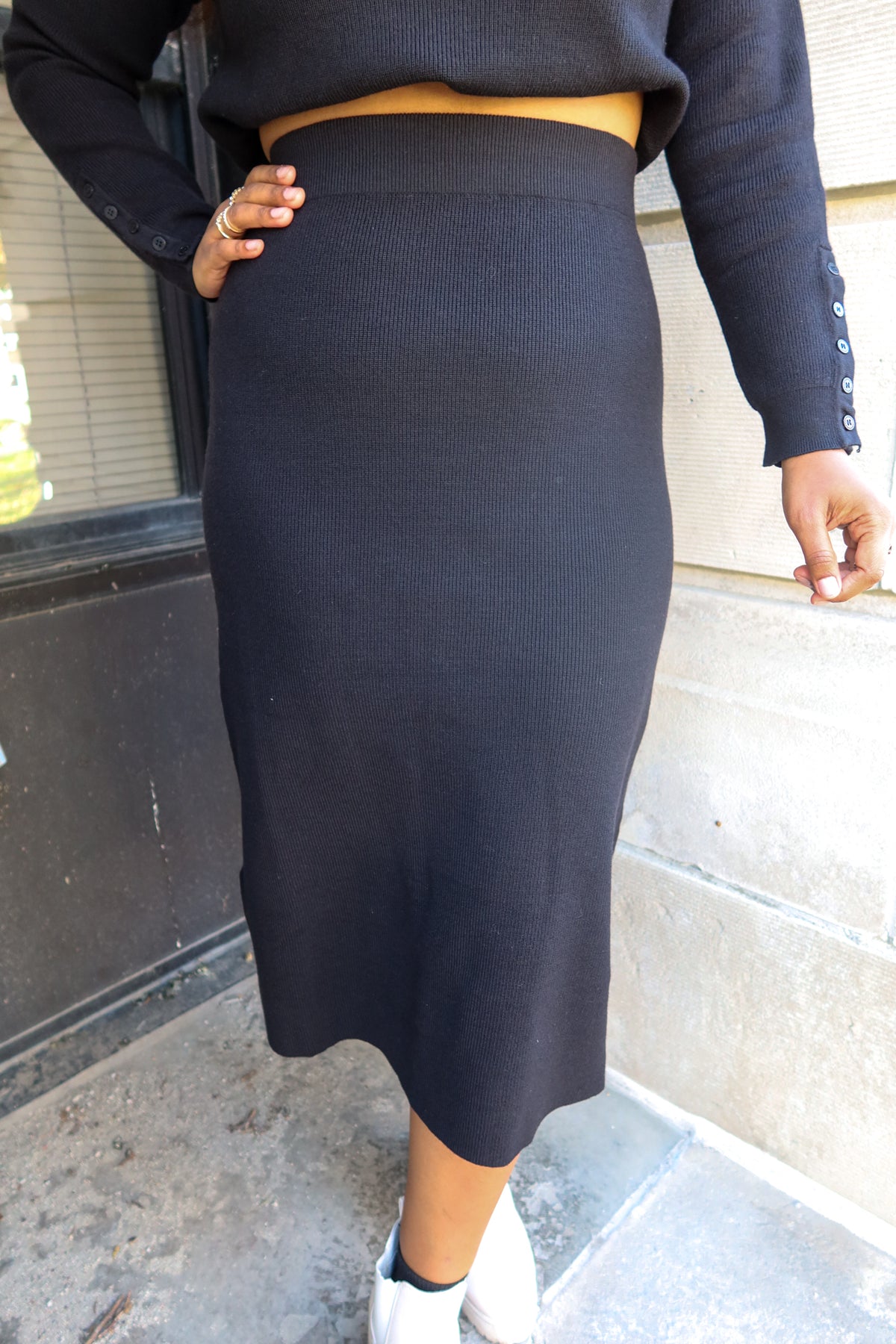 Effortlessly chic and incredibly comfortable, the Meant To Be Black Knit Skirt features a stretch fit that moves with you throughout your day. The elastic waist ensures a secure, flattering fit without sacrificing comfort, while the midi length offers timeless sophistication and versatility. Perfect for dressing up or down, this essential piece transitions seamlessly from office to evening, making it a wardrobe staple you'll reach for again and again.