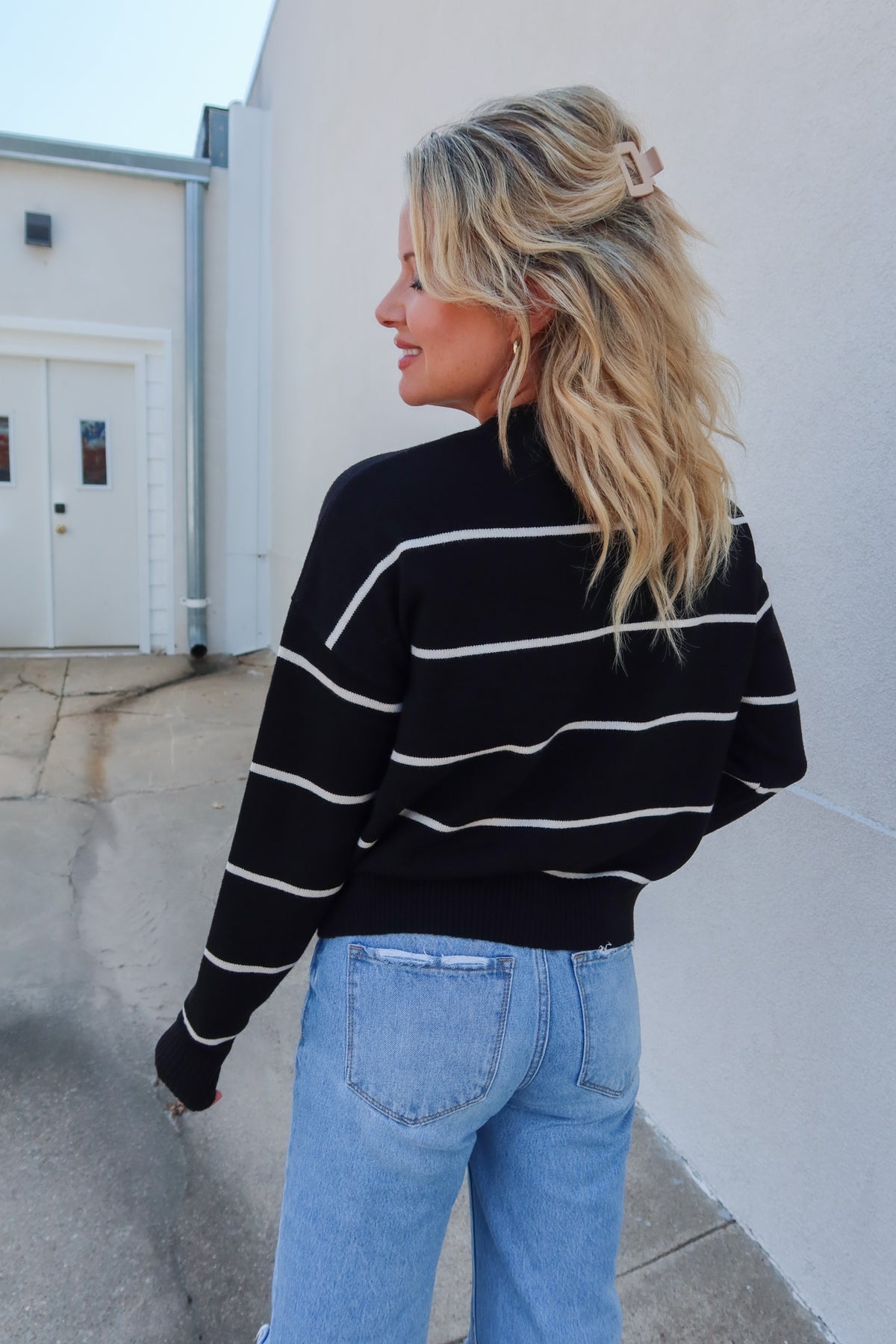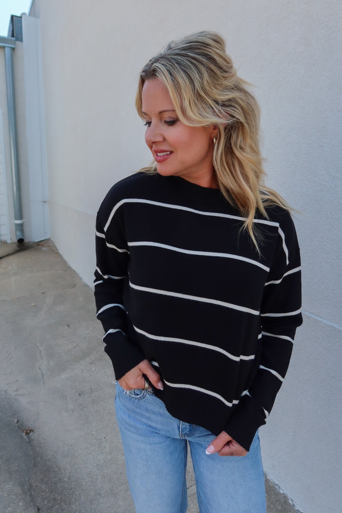 Wrap yourself in warmth and style with the Fall Feeling Black Stripe Sweater. Perfect for crisp autumn days, this cozy sweater combines soft fabric and a classic striped design to keep you comfortable and on-trend. Layer it effortlessly for a chic, relaxed look that embraces the spirit of the season.