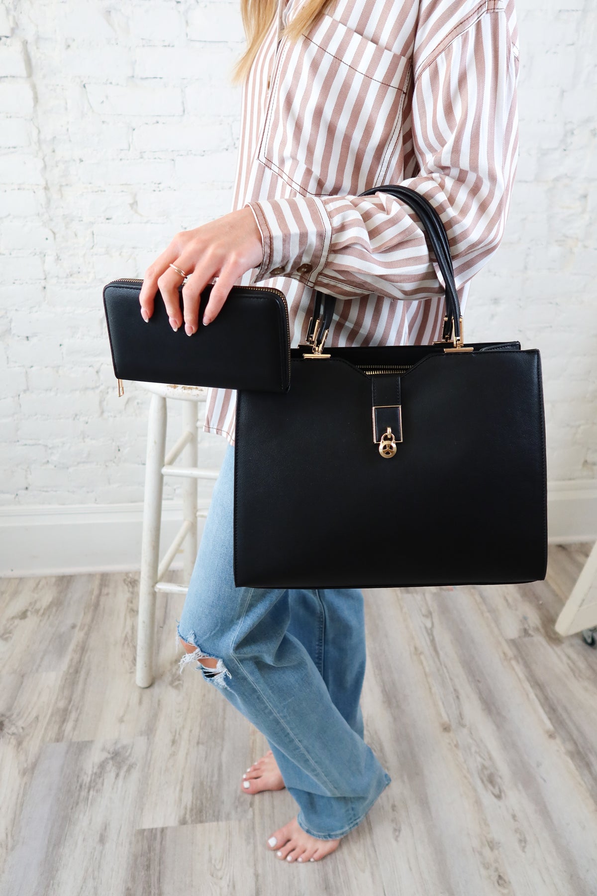 Elevate your style with the Always Chic Black Shoulder Bag, featuring elegant gold metal detailing and a secure zip closure. Designed for versatility, it includes a removable long crossbody strap for hands-free convenience. Inside, multiple compartments keep your essentials organized, complemented by a matching wallet pouch for added practicality. Perfect for day-to-night wear, this bag combines sophistication with functionality effortlessly.