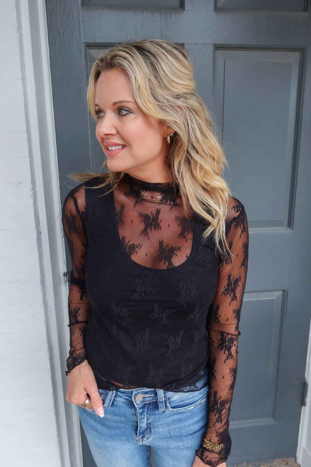 Elevate your style with the Famous For This Black Lace Layering Top. Designed with delicate mesh layering, it adds a chic touch when paired over graphic tees or your favorite husker shirt. This versatile top effortlessly enhances any outfit, making it perfect for both casual and dressier occasions.