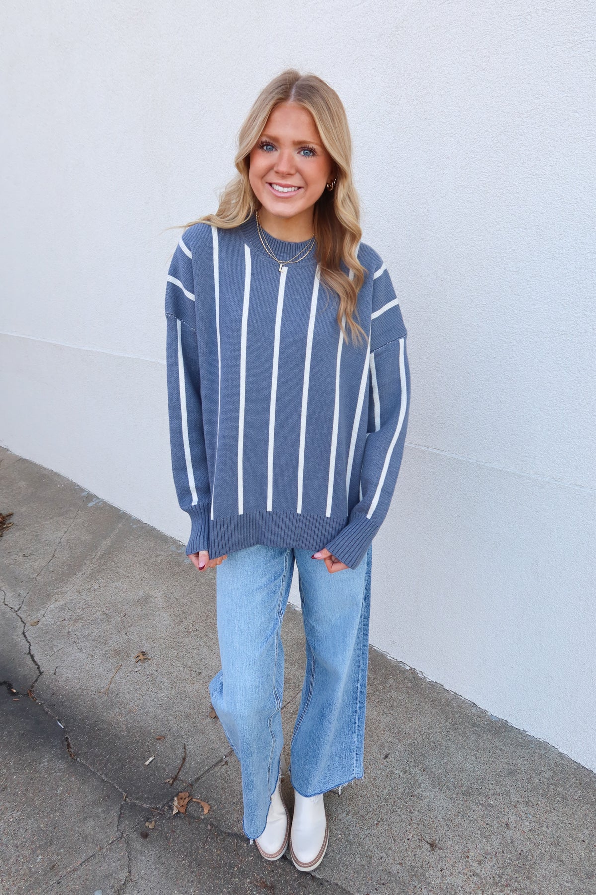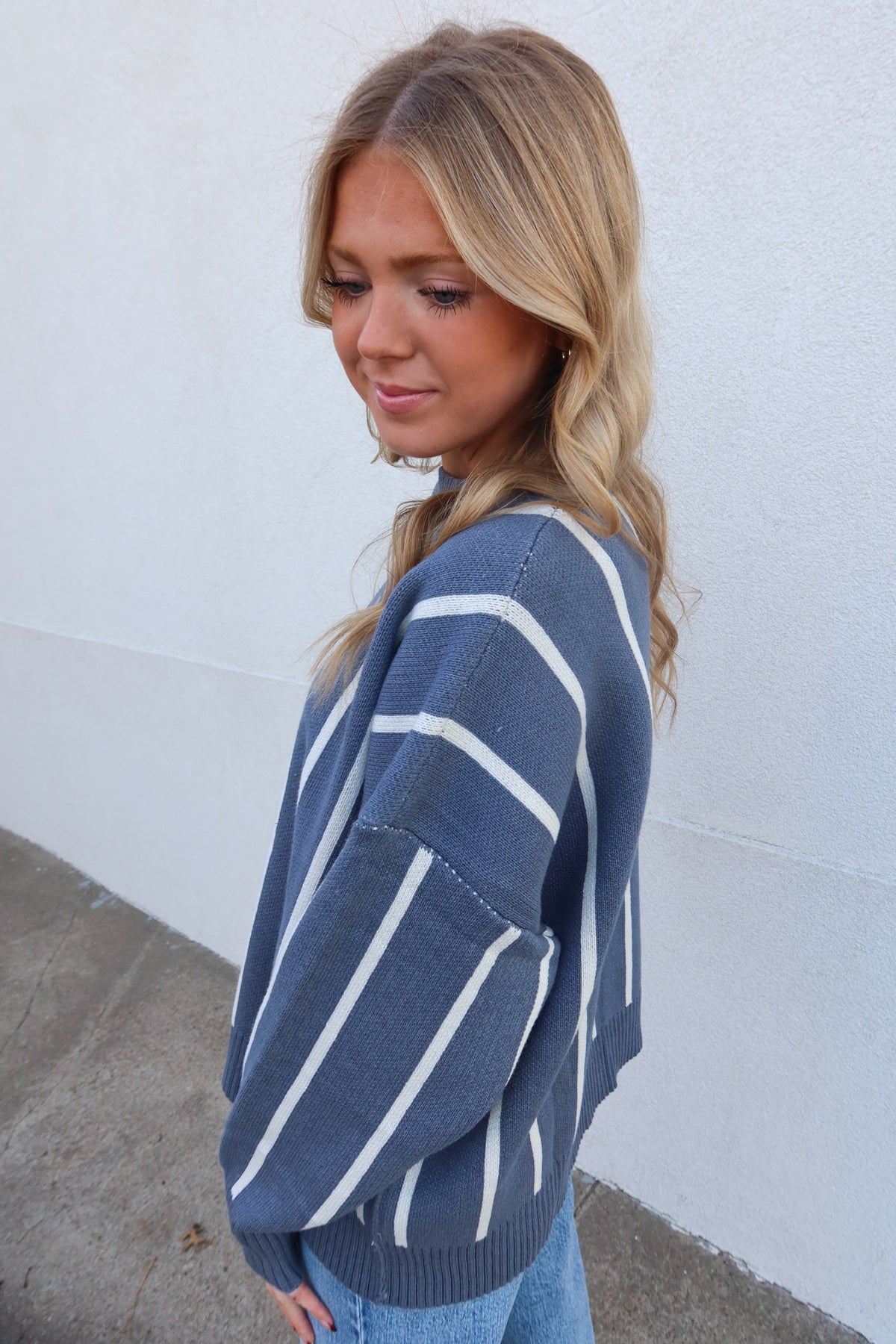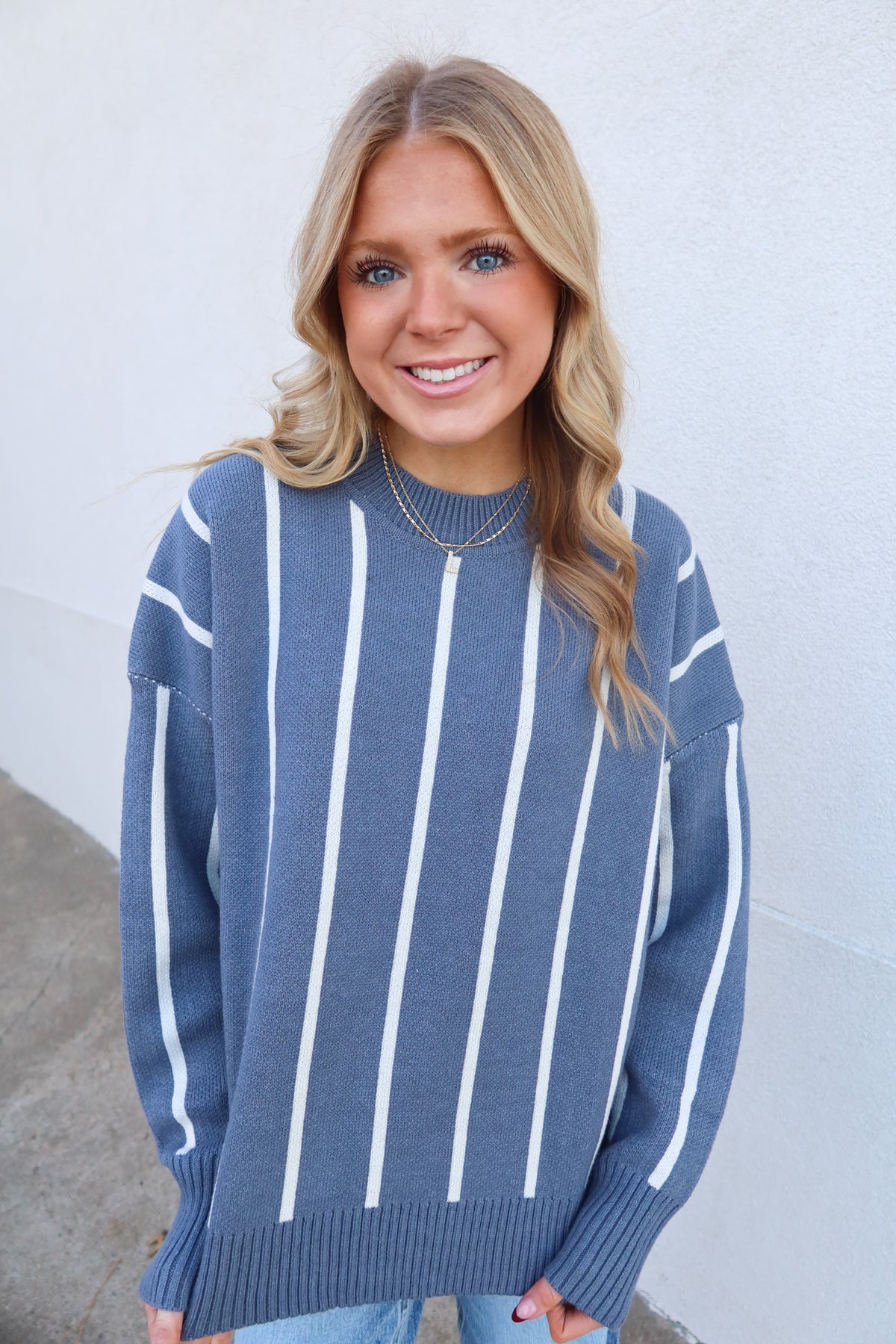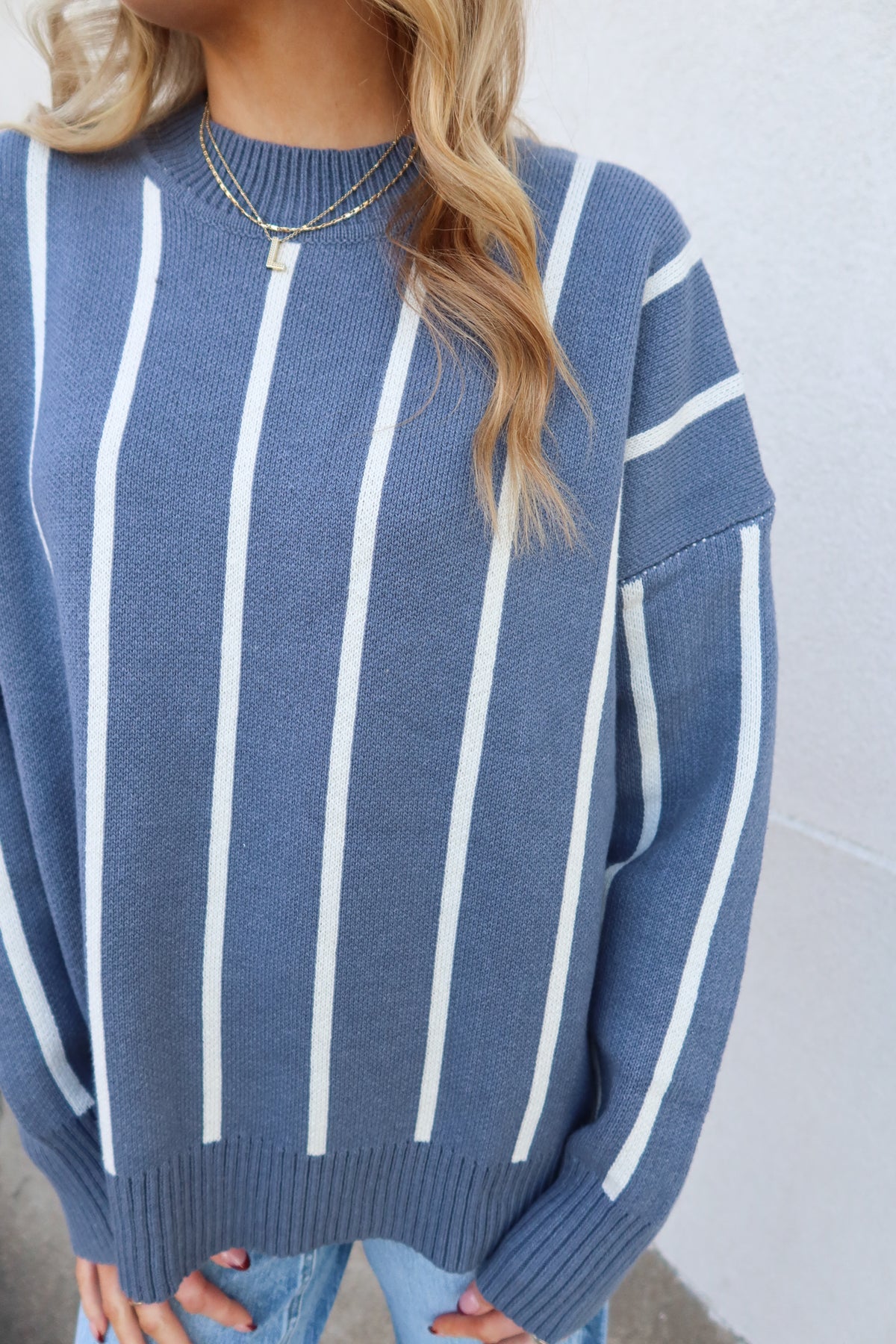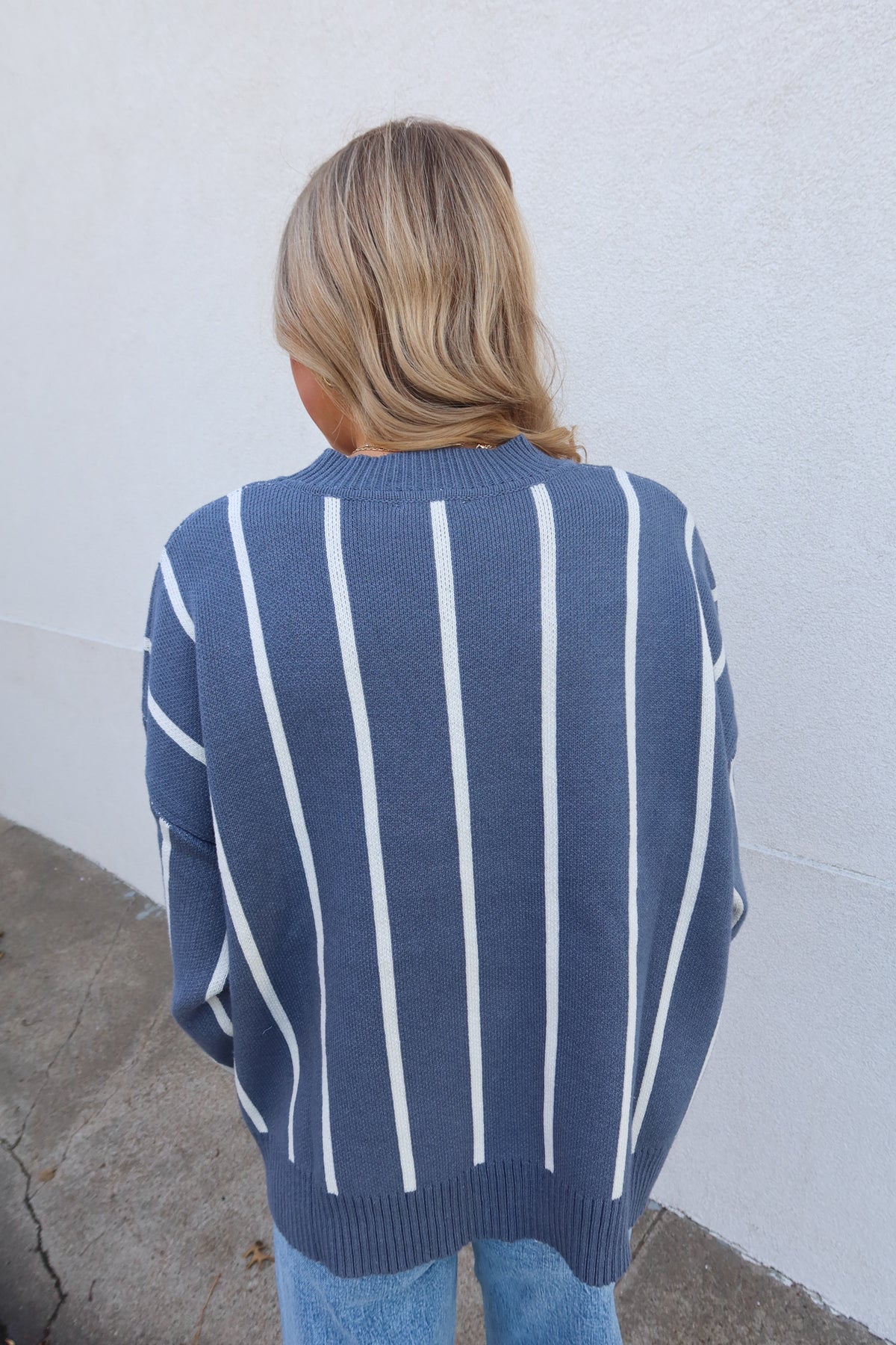 Embrace effortless style with this blue striped sweater, designed for all-day comfort. The vertical stripes create a flattering, elongating effect while the relaxed fit allows you to move freely without sacrificing sophistication. Perfect for layering or wearing solo, this versatile piece transitions seamlessly from casual weekends to laid-back office days. Soft and approachable, it's the sweater you'll reach for again and again.