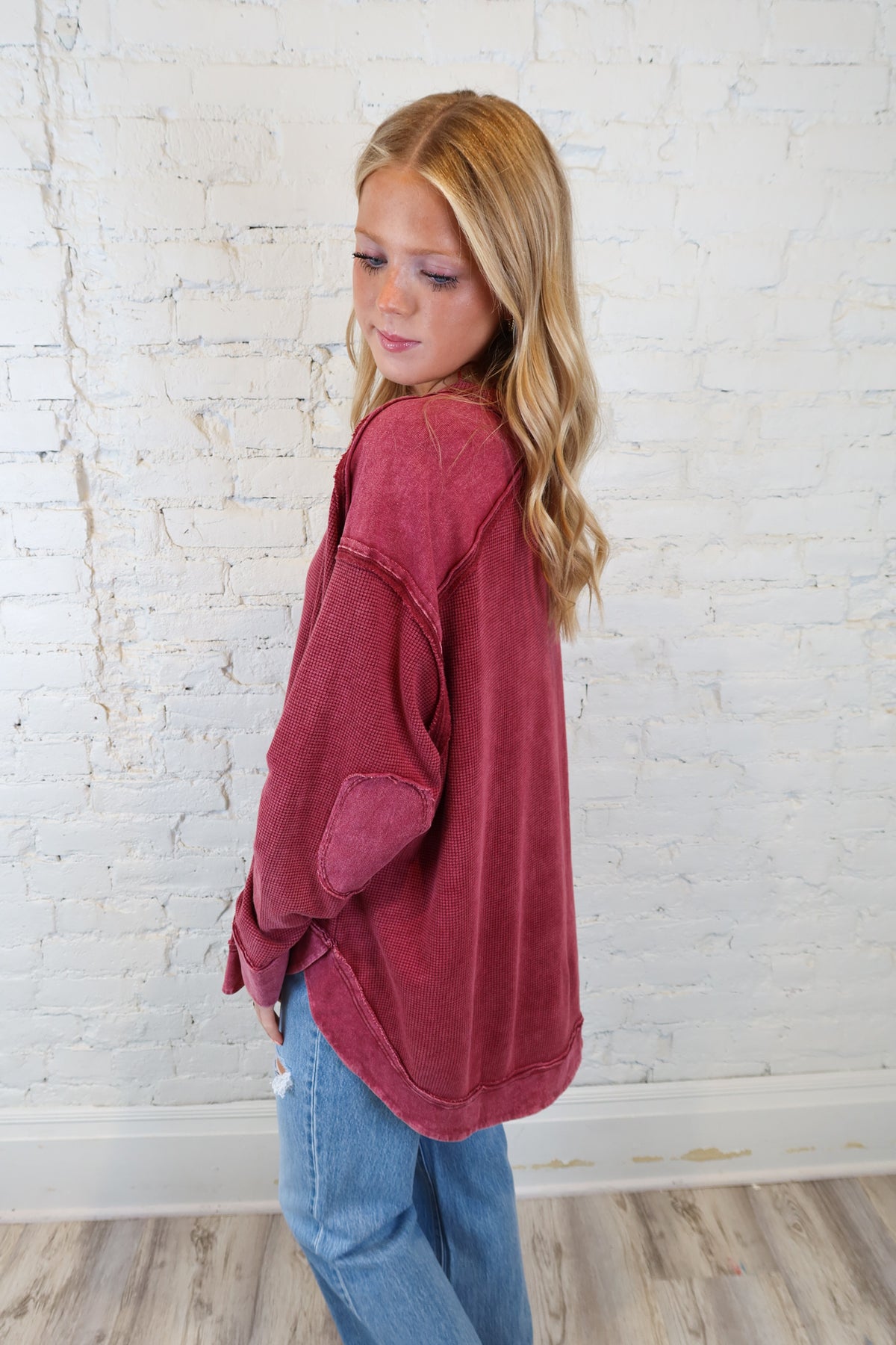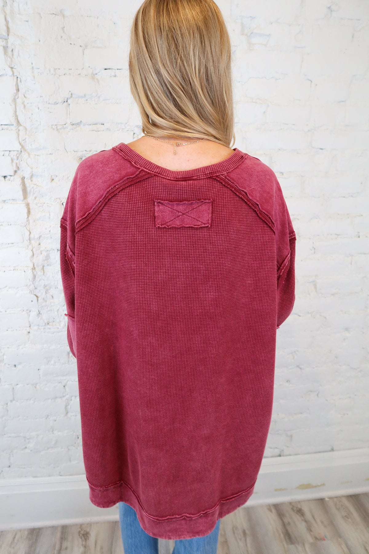 Elevate your wardrobe with the Fall for You Burgundy Oversized Top. Its rich burgundy hue and relaxed fit make it perfect for layering or wearing solo. Crafted for comfort and style, this versatile top adds effortless chic to any outfit while keeping you cozy through cooler seasons.