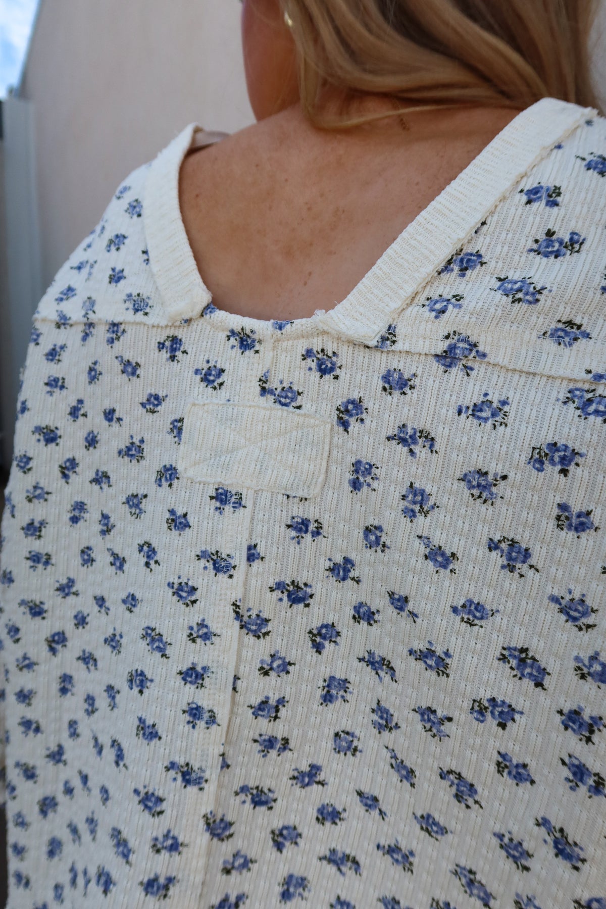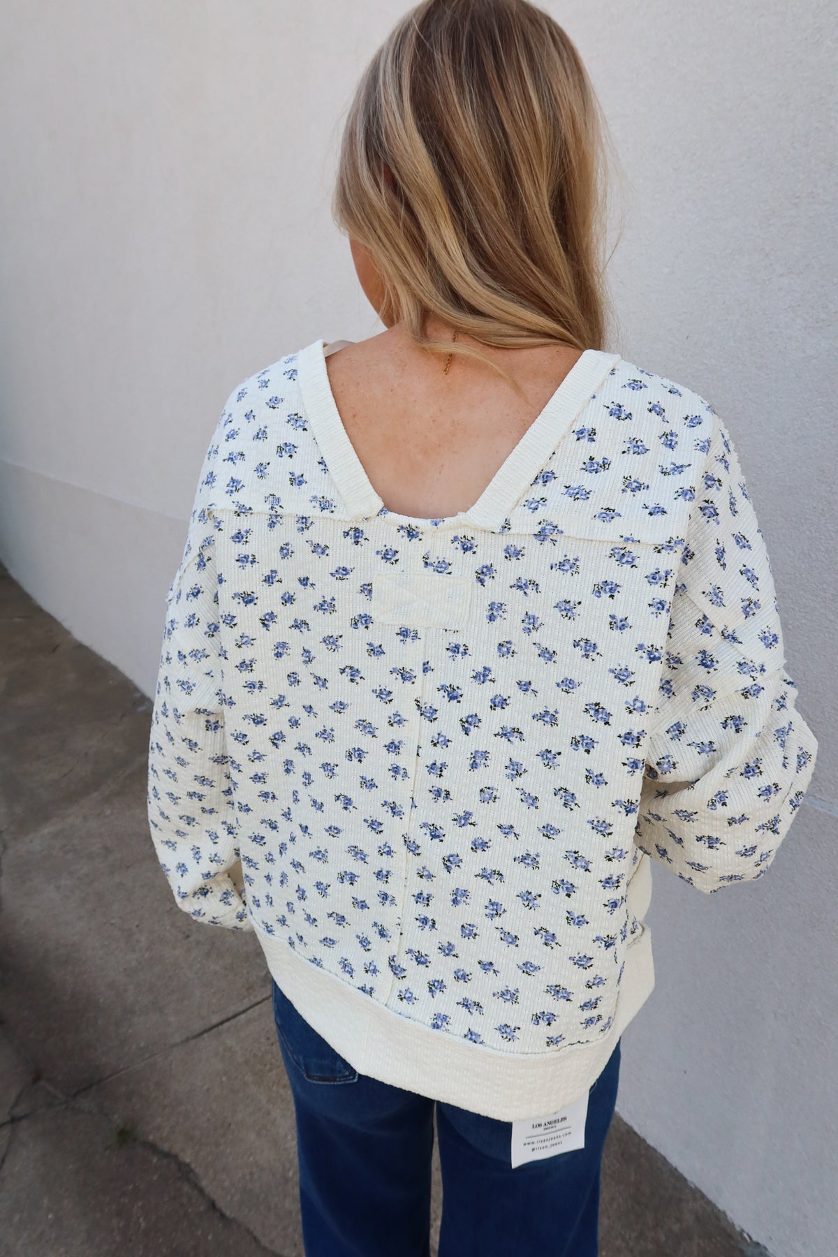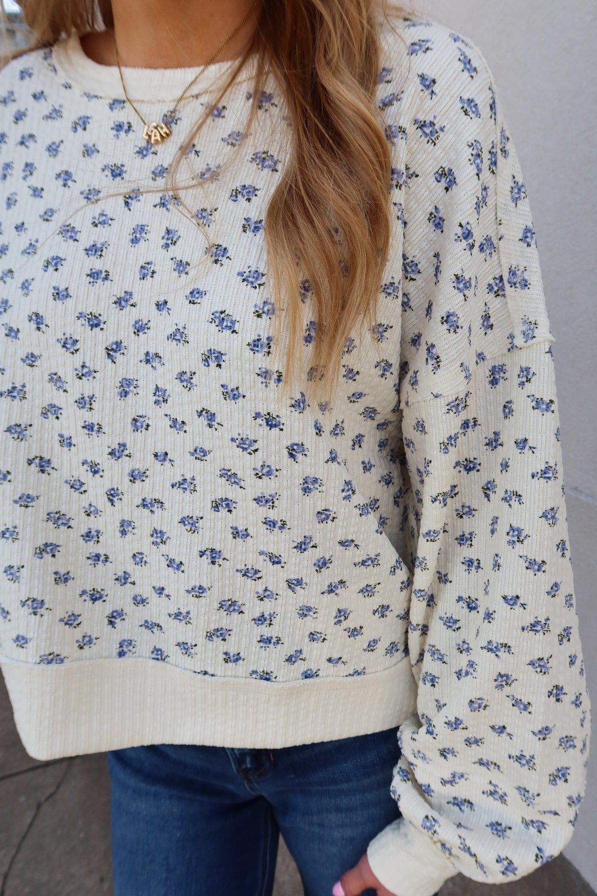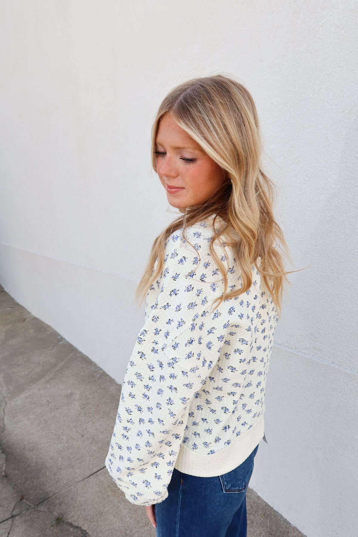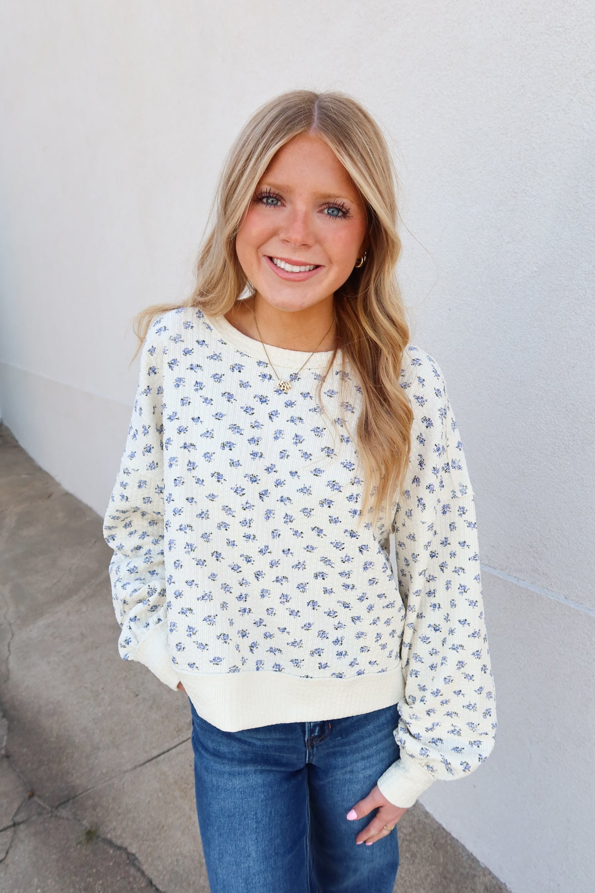Embrace a sweet and delicate look with the Cream Floral Long Sleeve Top, highlighted by charming blue floral details. Soft and comfortable, it blends cozy warmth with a dainty design, perfect for adding a touch of elegance to your everyday style. A lovely choice for effortless, cute layering.