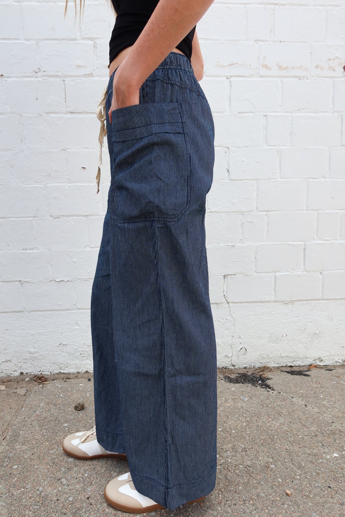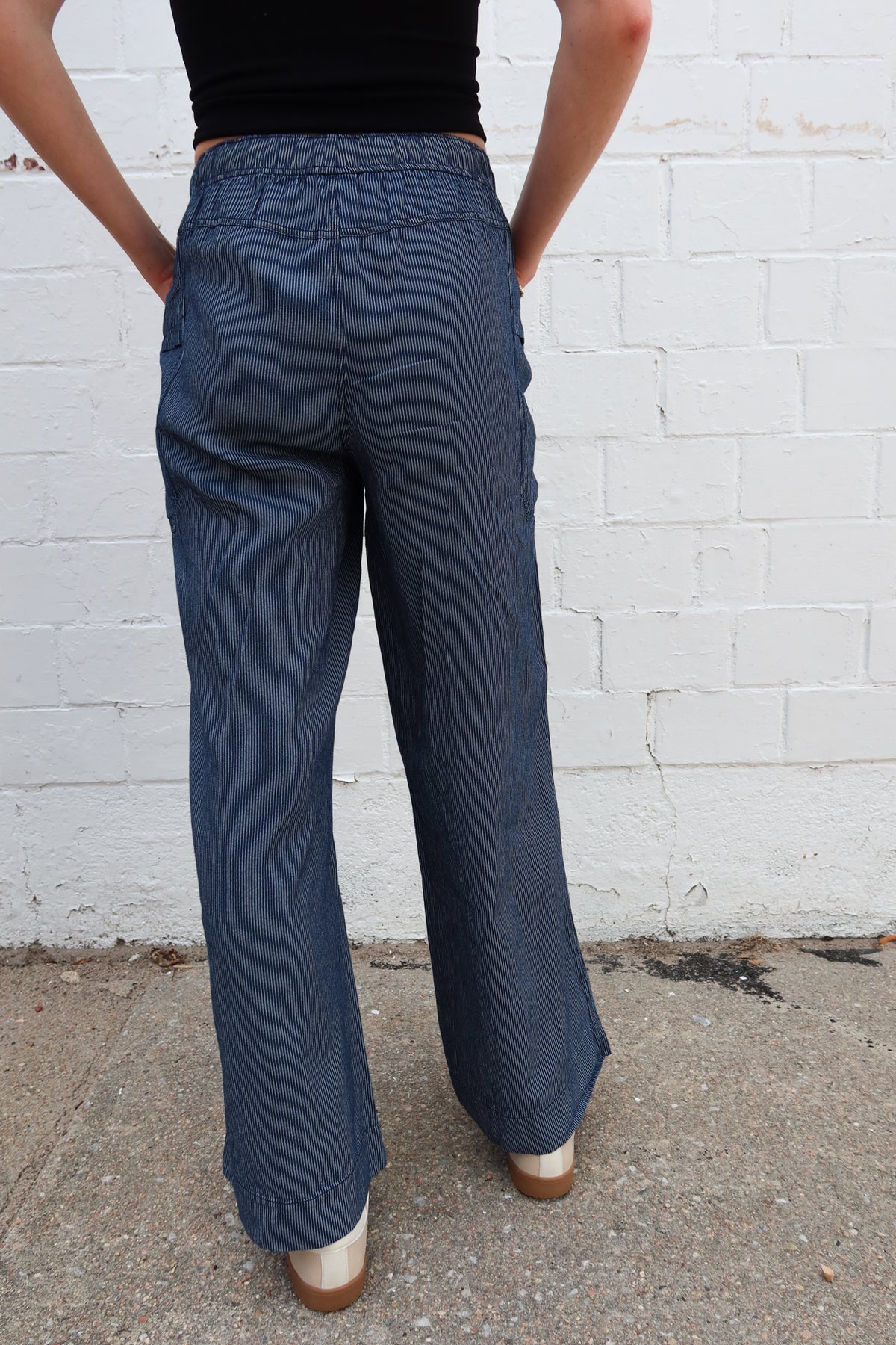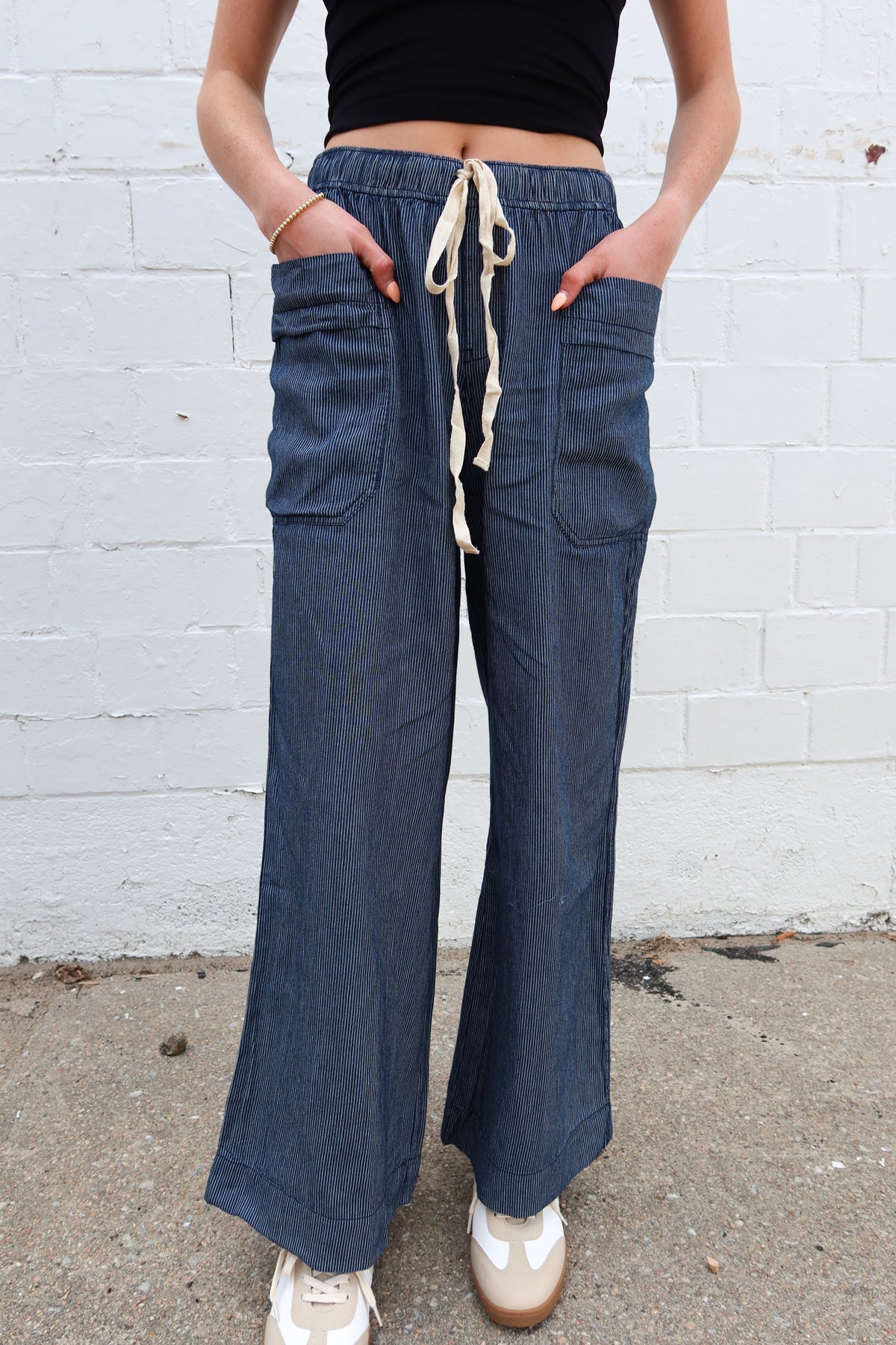 Elevate your wardrobe with the Living The Dream Denim Pinstriped Straight Leg Pant. Featuring subtle pinstripes and playful side pocket details, these pants perfectly balance a polished look with relaxed comfort. The drawstring waist adds an adjustable fit, making them ideal for both lounging and a business-casual setting. Experience versatility and style in one effortless piece.