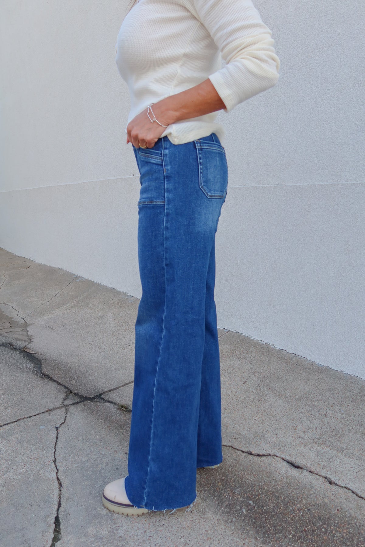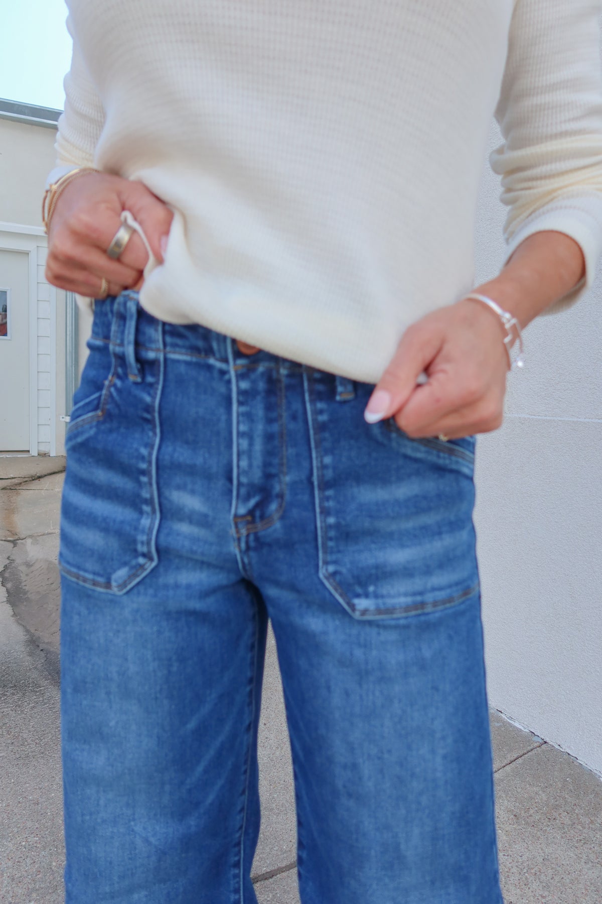Elevate your fall wardrobe with these Dark Mid Rise Fit Wide Leg Jeans in a versatile medium wash. Designed for comfort and style, their flattering mid-rise and wide leg silhouette create a relaxed yet polished look perfect for layering. Crafted to complement the season's cozy layers, these jeans offer both effortless style and all-day comfort, making them an essential piece for your autumn outfits.