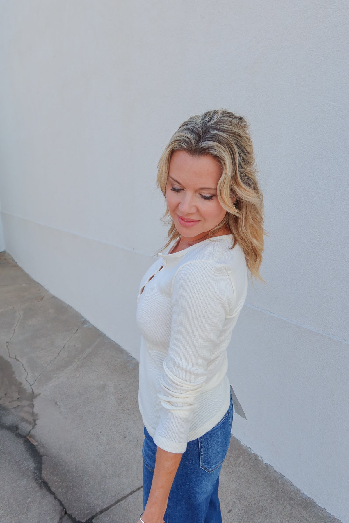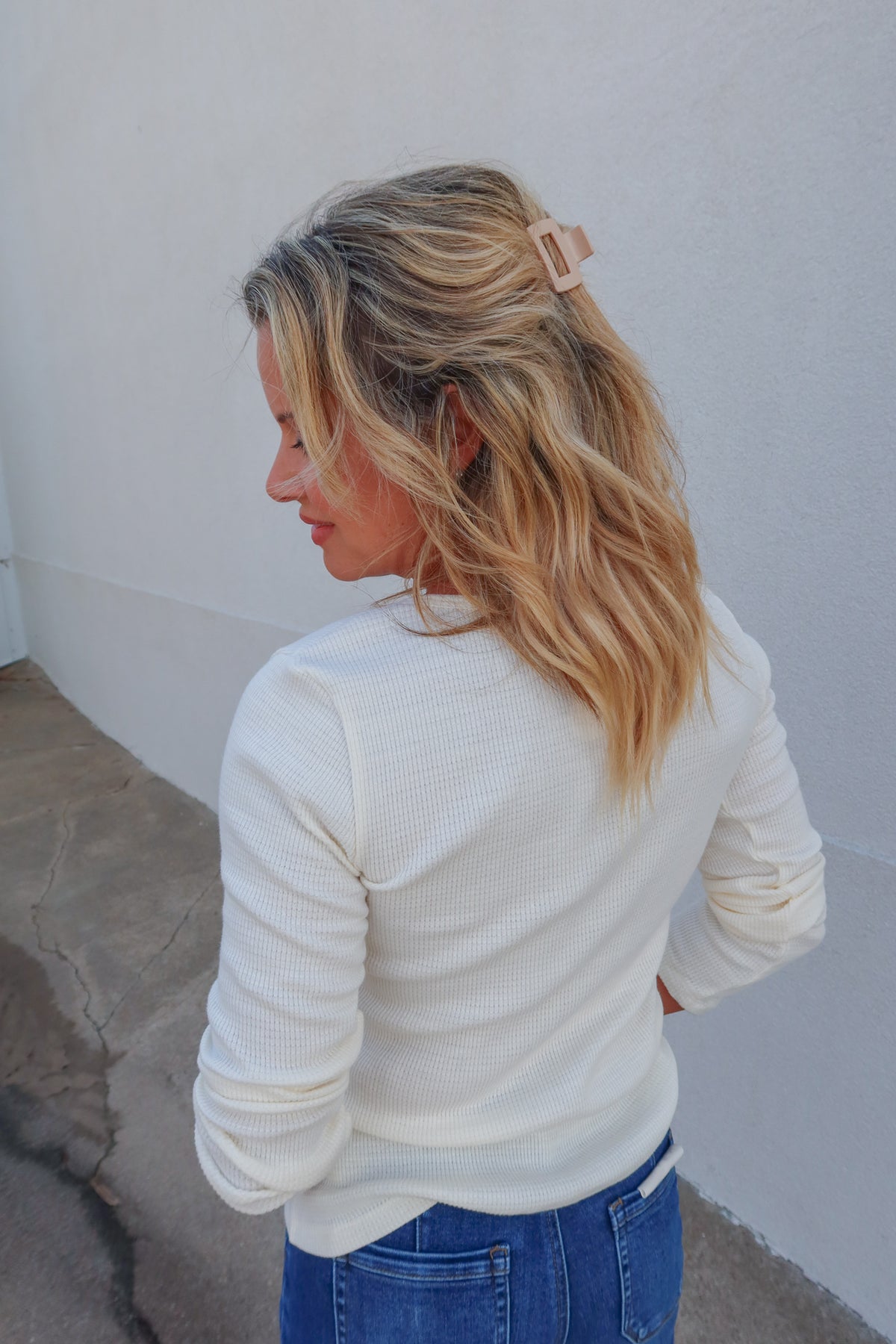 Embrace crisp autumn days in the Cream Thermal Long Sleeve Top, designed for warmth and effortless style. Its soft thermal fabric keeps you cozy while the relaxed fit ensures all-day comfort. Perfect for casual outings or layering under jackets, this top combines practicality with a timeless look that elevates your fall wardrobe.