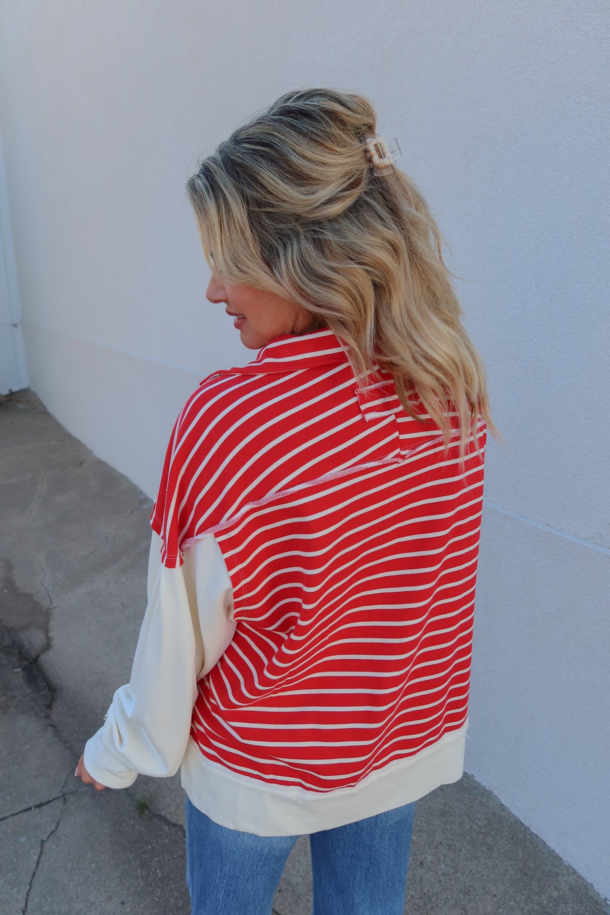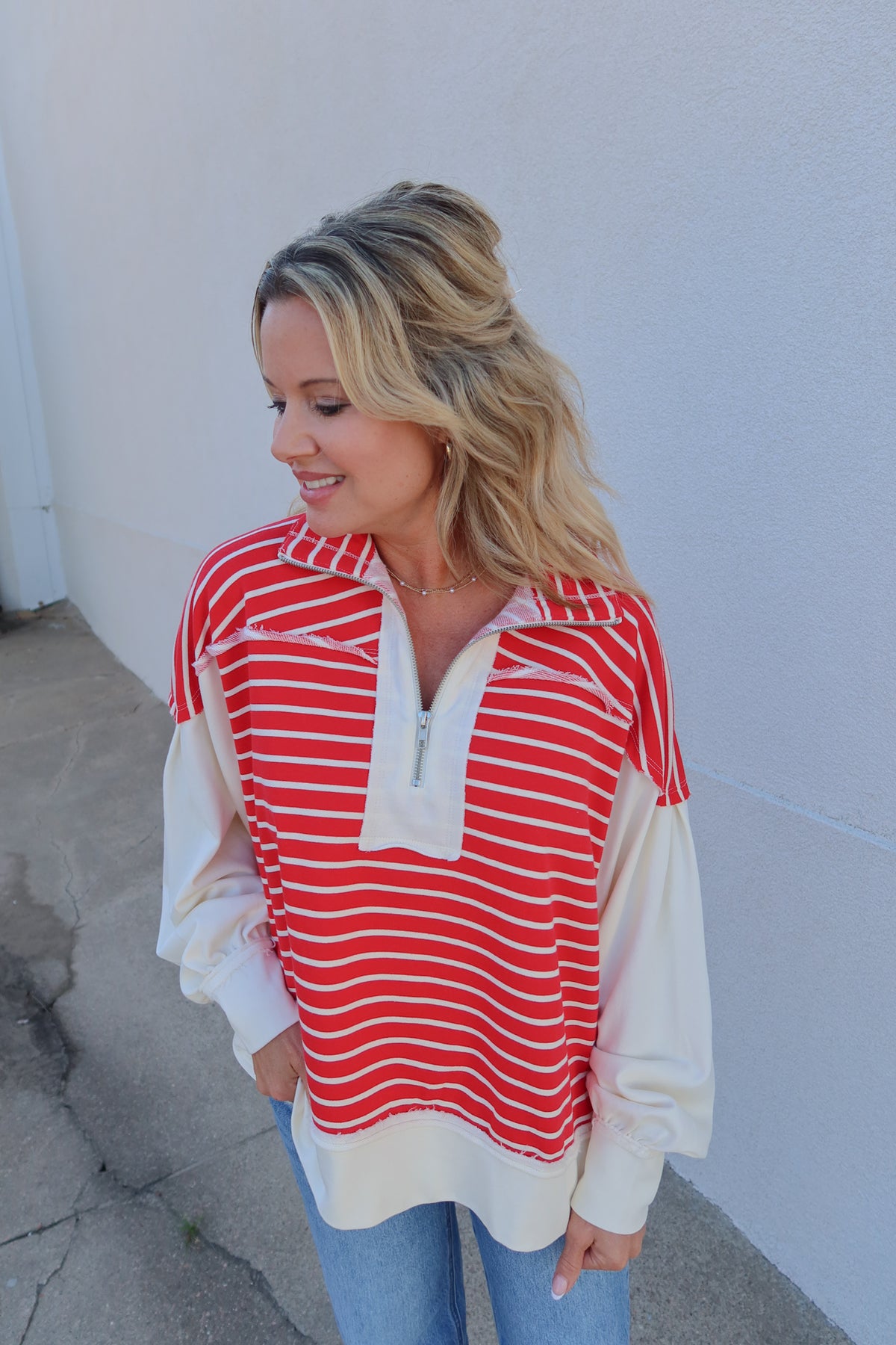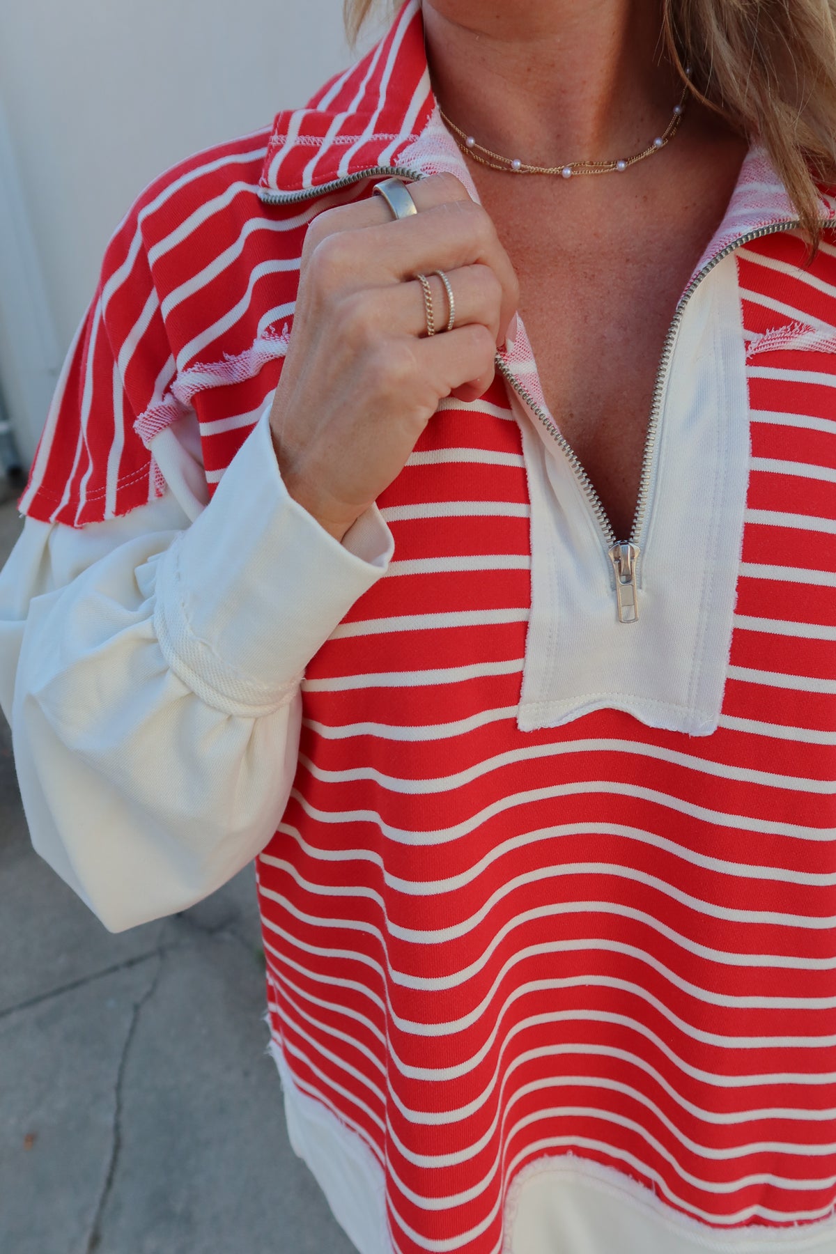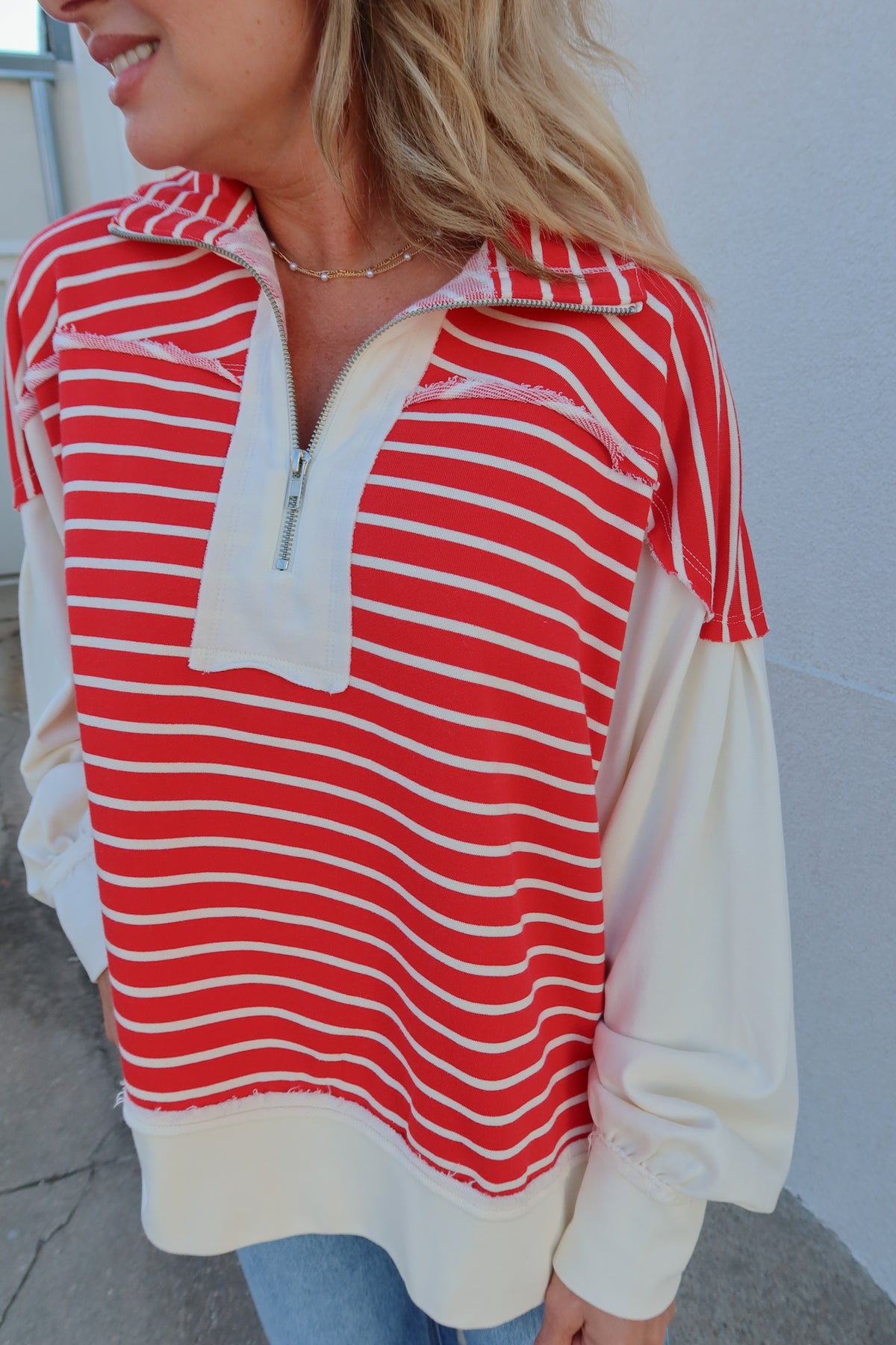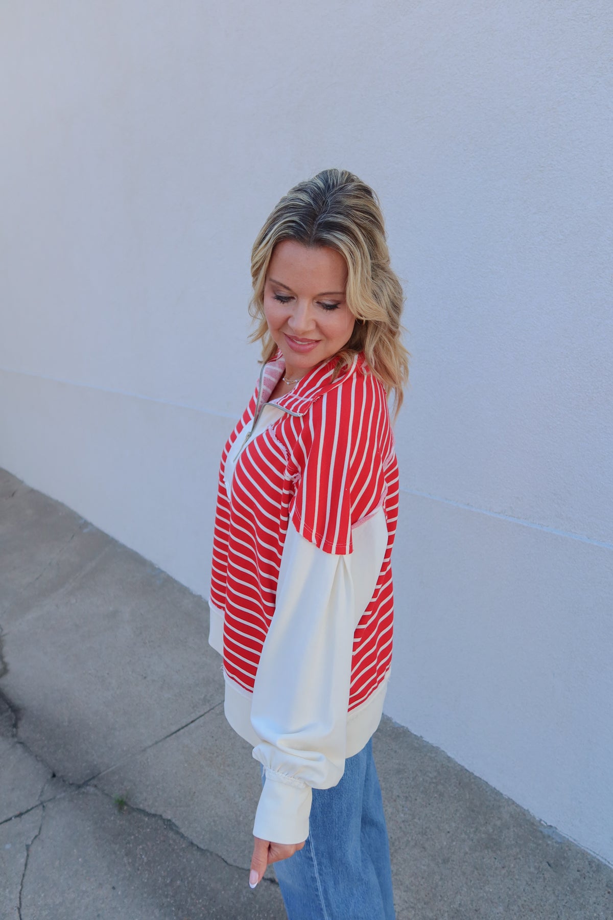 Elevate your casual wardrobe with the Red Rush Stripe Half Zip Top. Its vibrant red stripes add a bold statement, while the half-zip design offers customizable comfort and easy layering. Crafted for both style and function, this top is perfect for active days or relaxed weekends, providing a flattering fit that moves with you. Make every outfit pop with this standout piece.