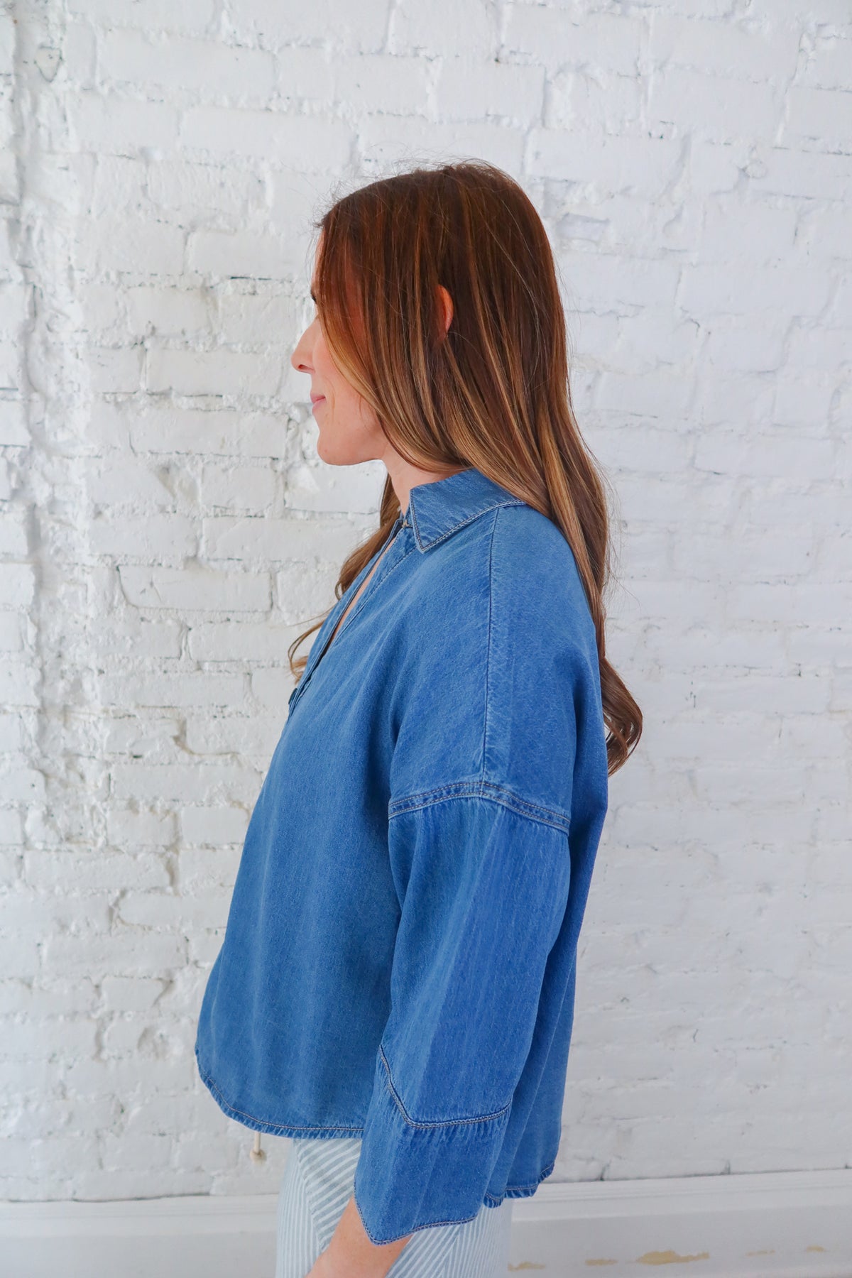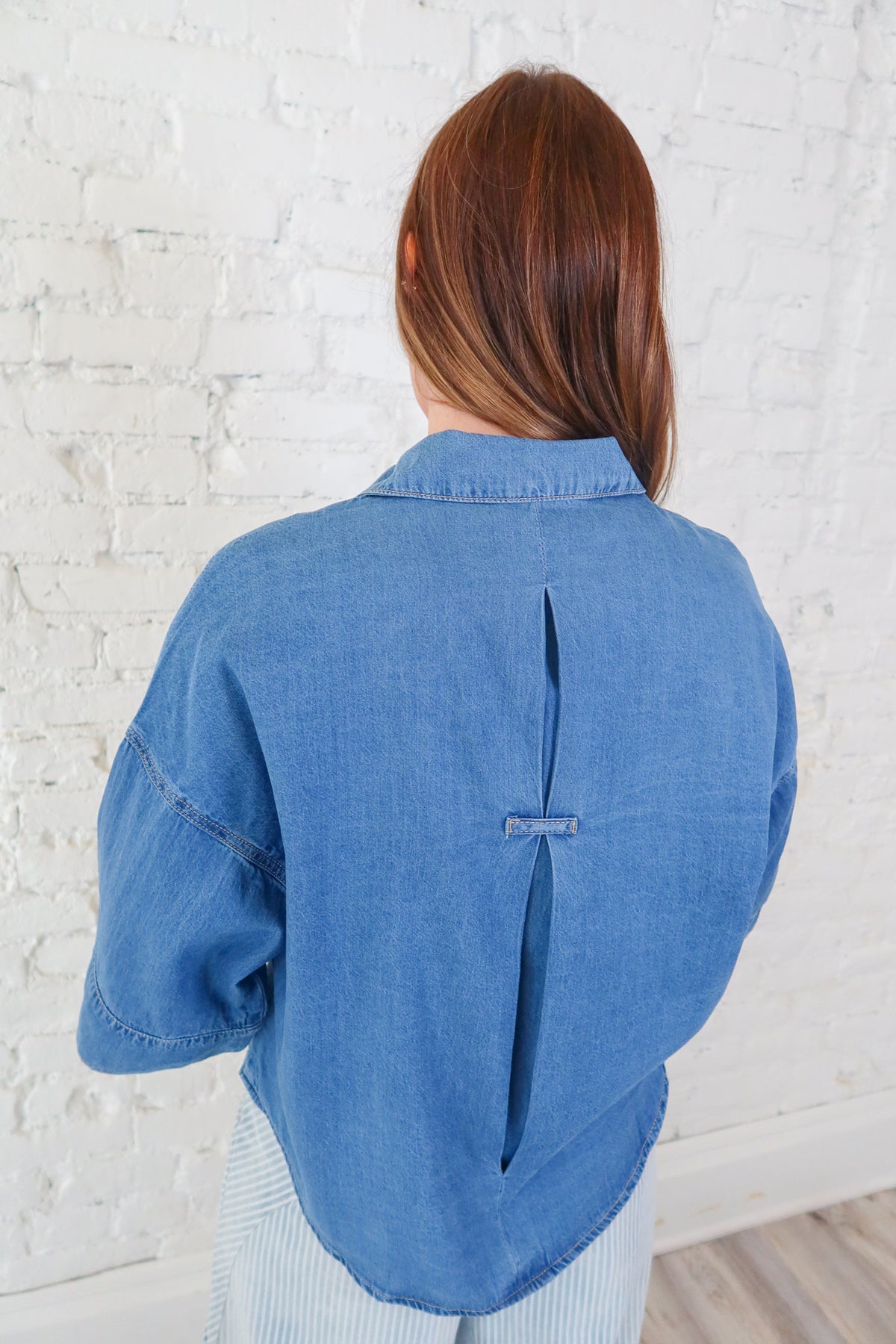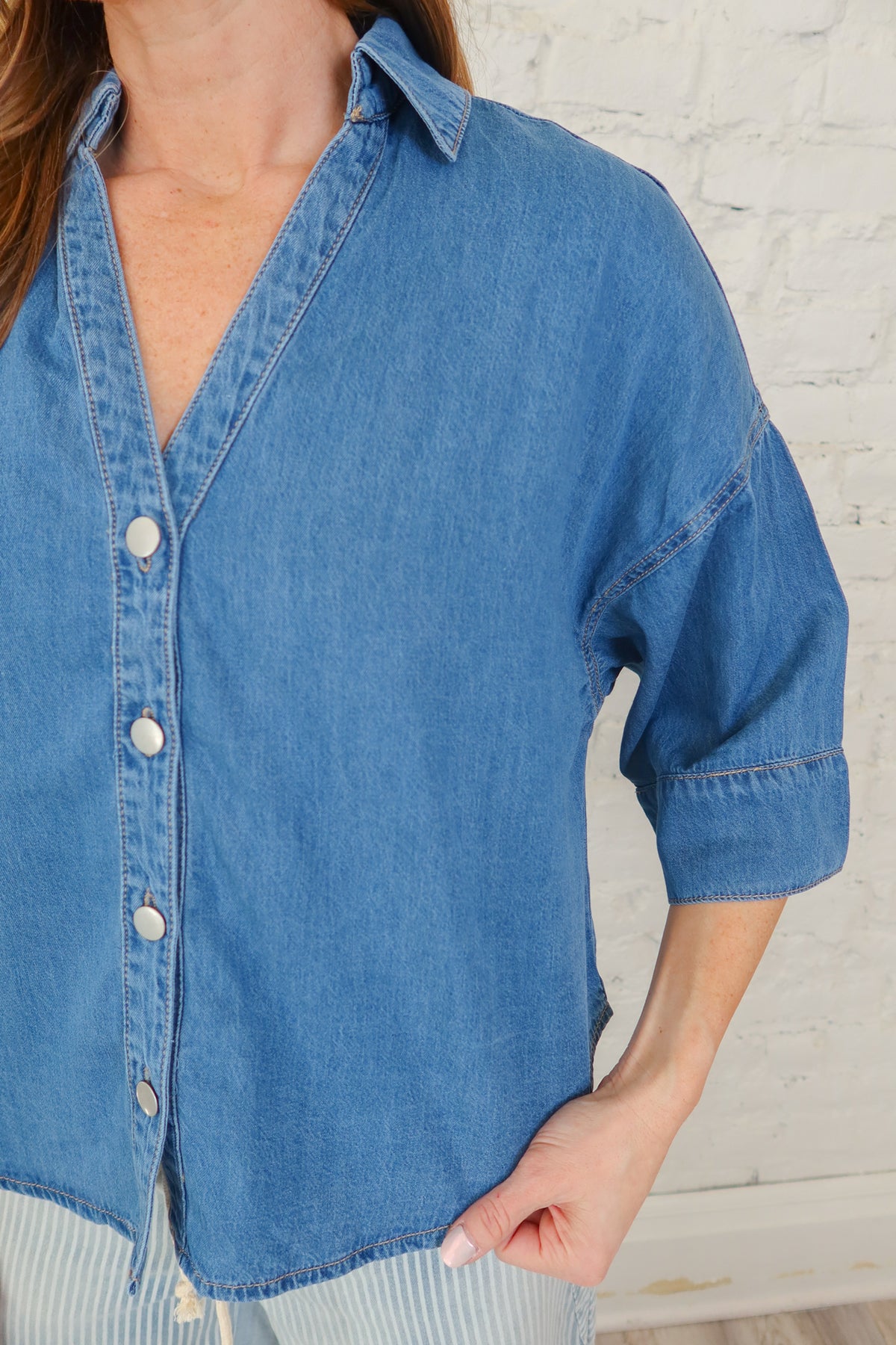 Elevate your everyday wardrobe with this versatile denim button-down top. The classic collared neckline and front button closures offer timeless style and easy layering, while the flattering 3/4 length sleeves strike the perfect balance between coverage and breathability. Whether dressed up for the office or down for casual outings, this essential piece transitions seamlessly through your week. A wardrobe staple that works as hard as you do.