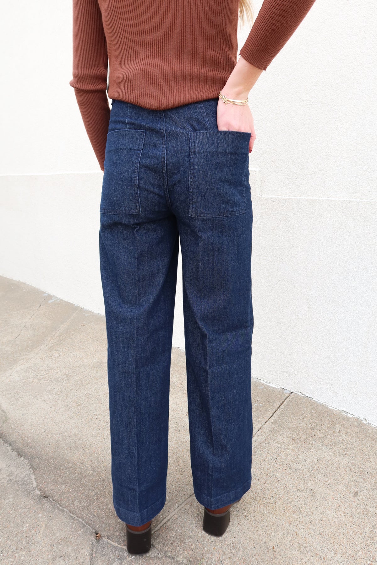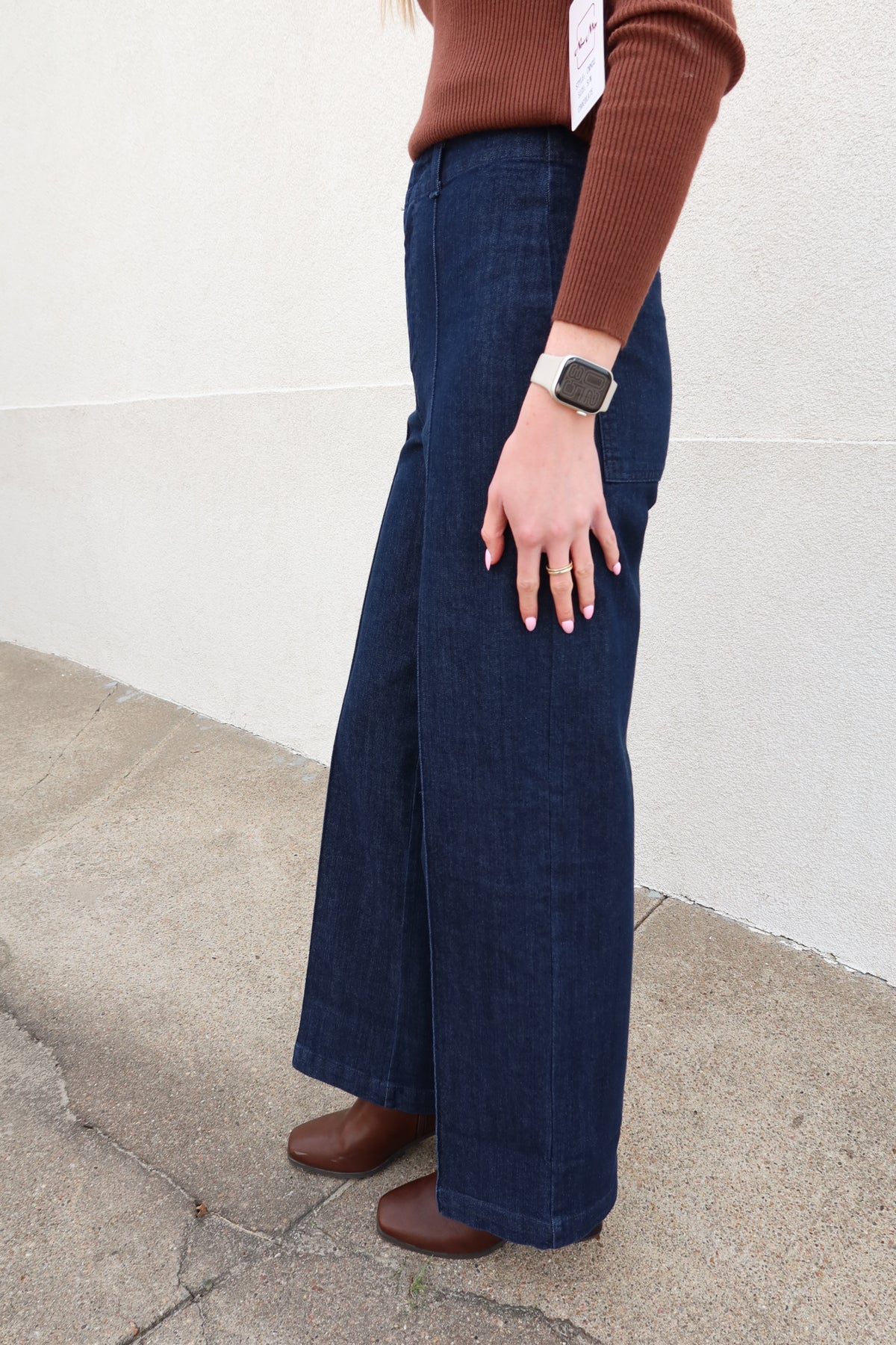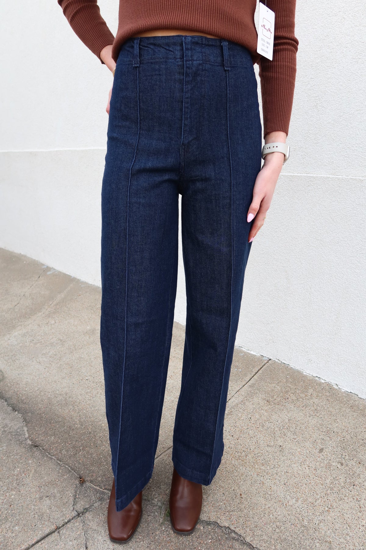 Elevate your wardrobe with these Denim High Waisted Front Seam Wide Leg Jeans. The dark wash offers a sleek and versatile look, while the high waist and front seam detail create a flattering silhouette. Designed for comfort and style, the wide leg cut adds a chic, modern edge perfect for dressing up or down. These jeans are a must-have staple that effortlessly combines trend and timeless appeal.
