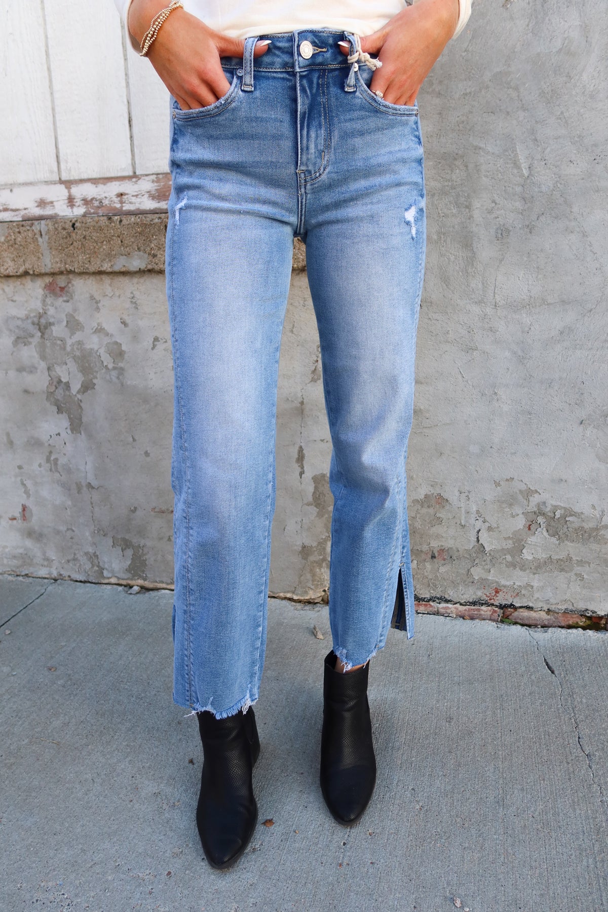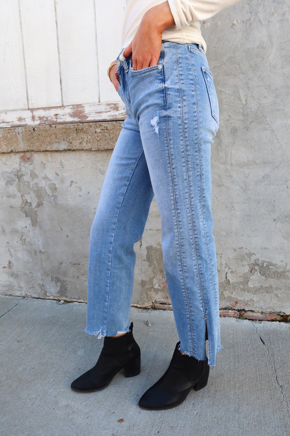 These light wash, mid-rise jeans feature a stylish ankle slit that adds a modern twist to a classic silhouette. Perfect for fall, their tailored fit offers both comfort and versatility, making them ideal for layering with boots or sneakers. Elevate your seasonal wardrobe with these chic jeans that combine effortless style and a flattering cut.