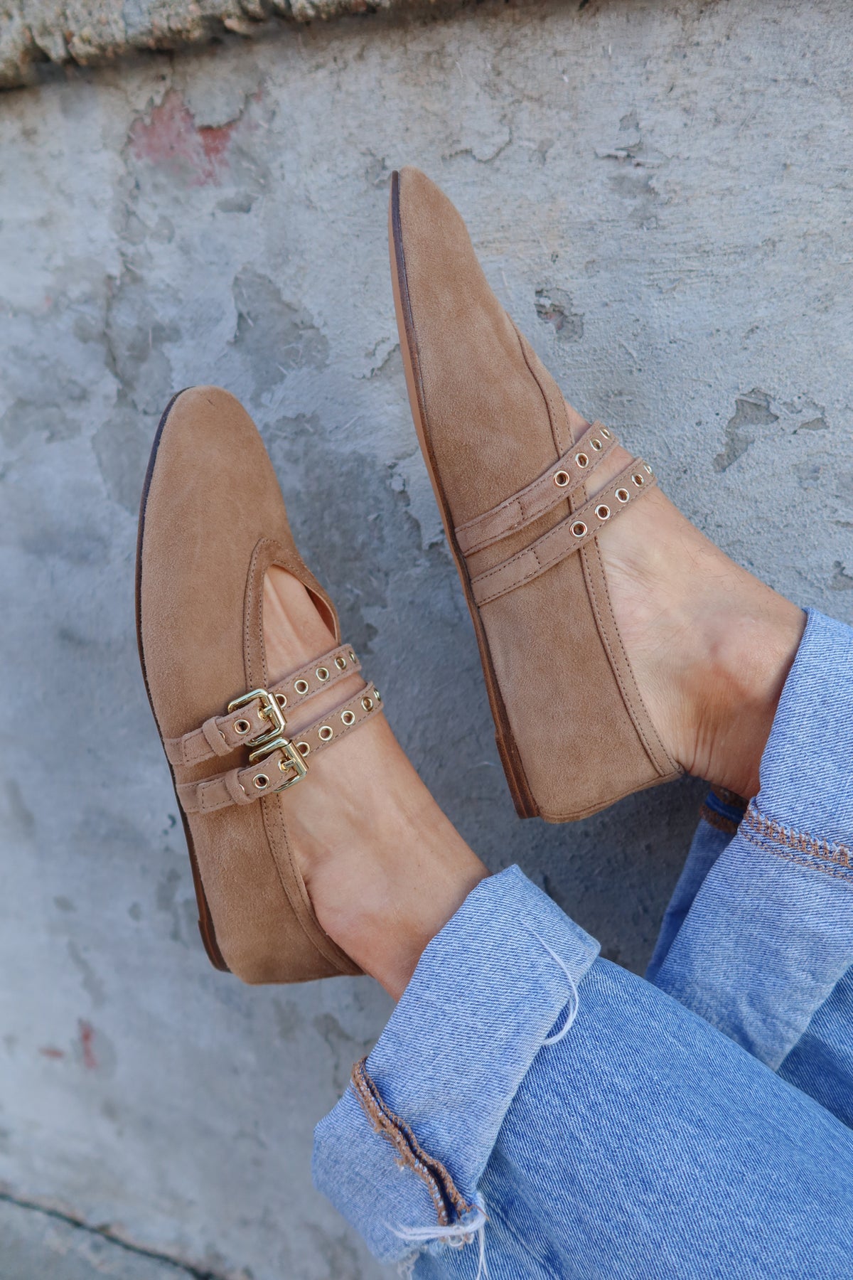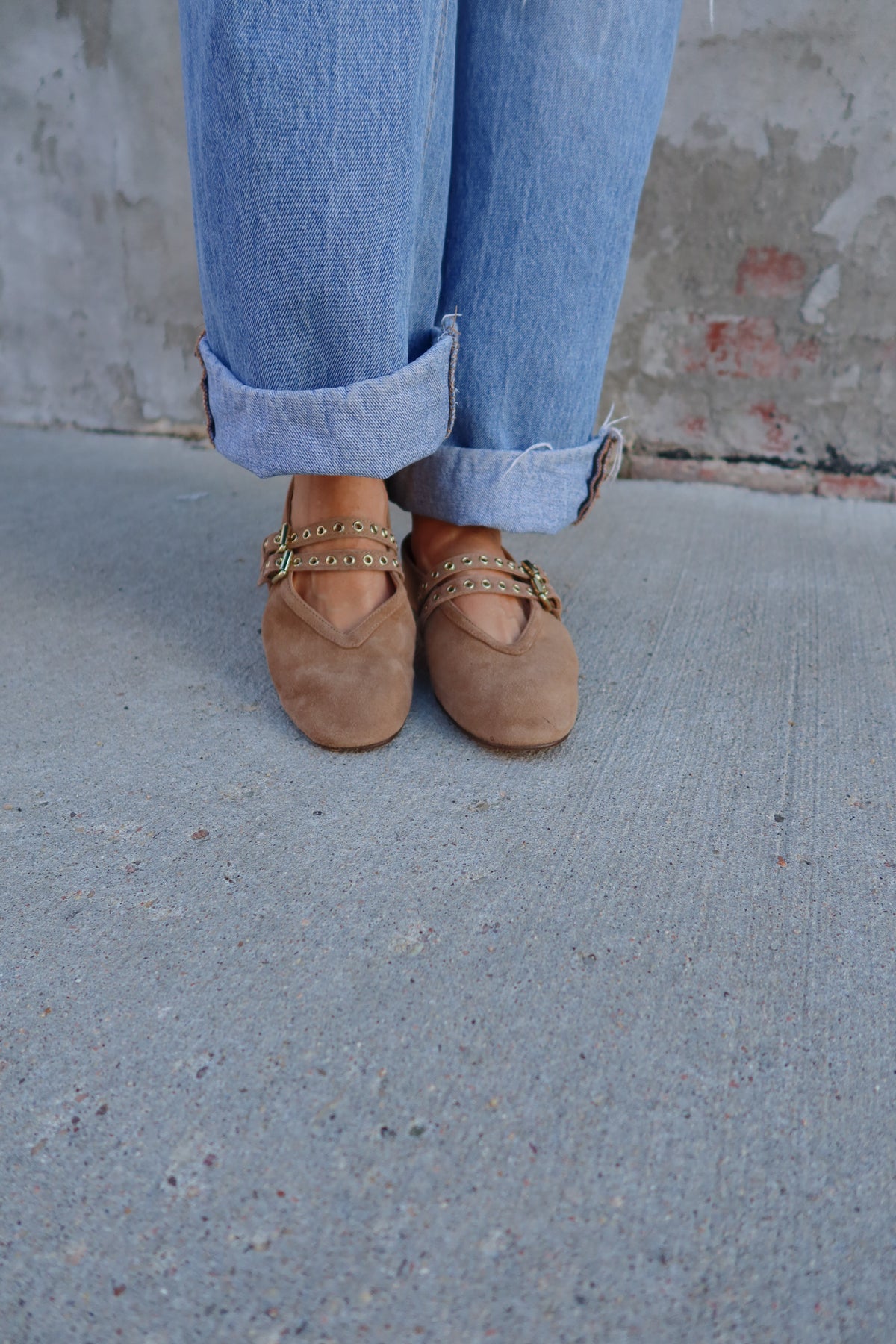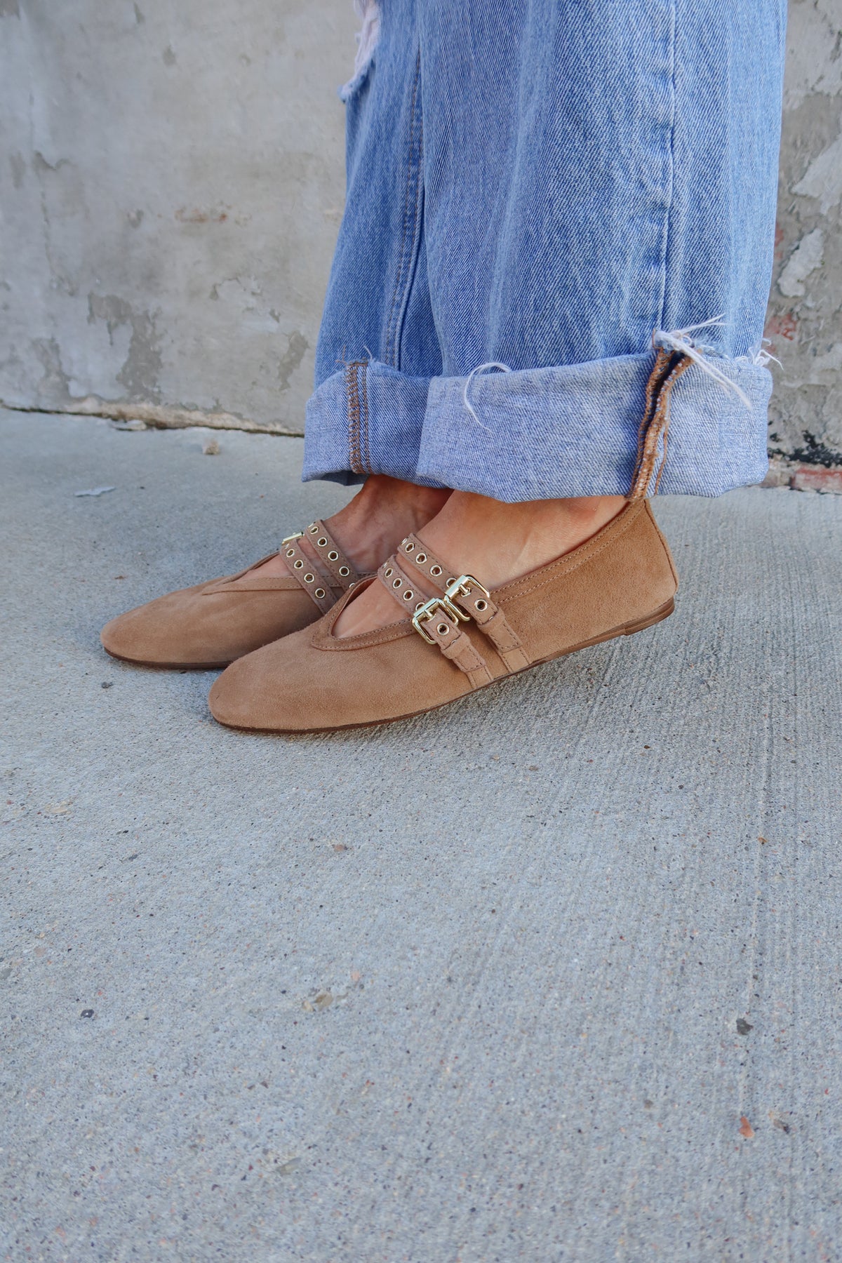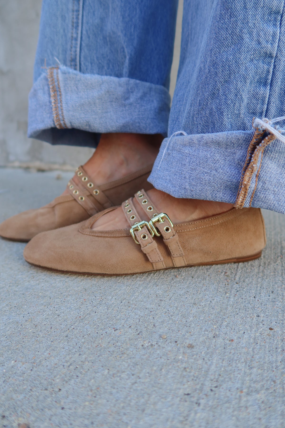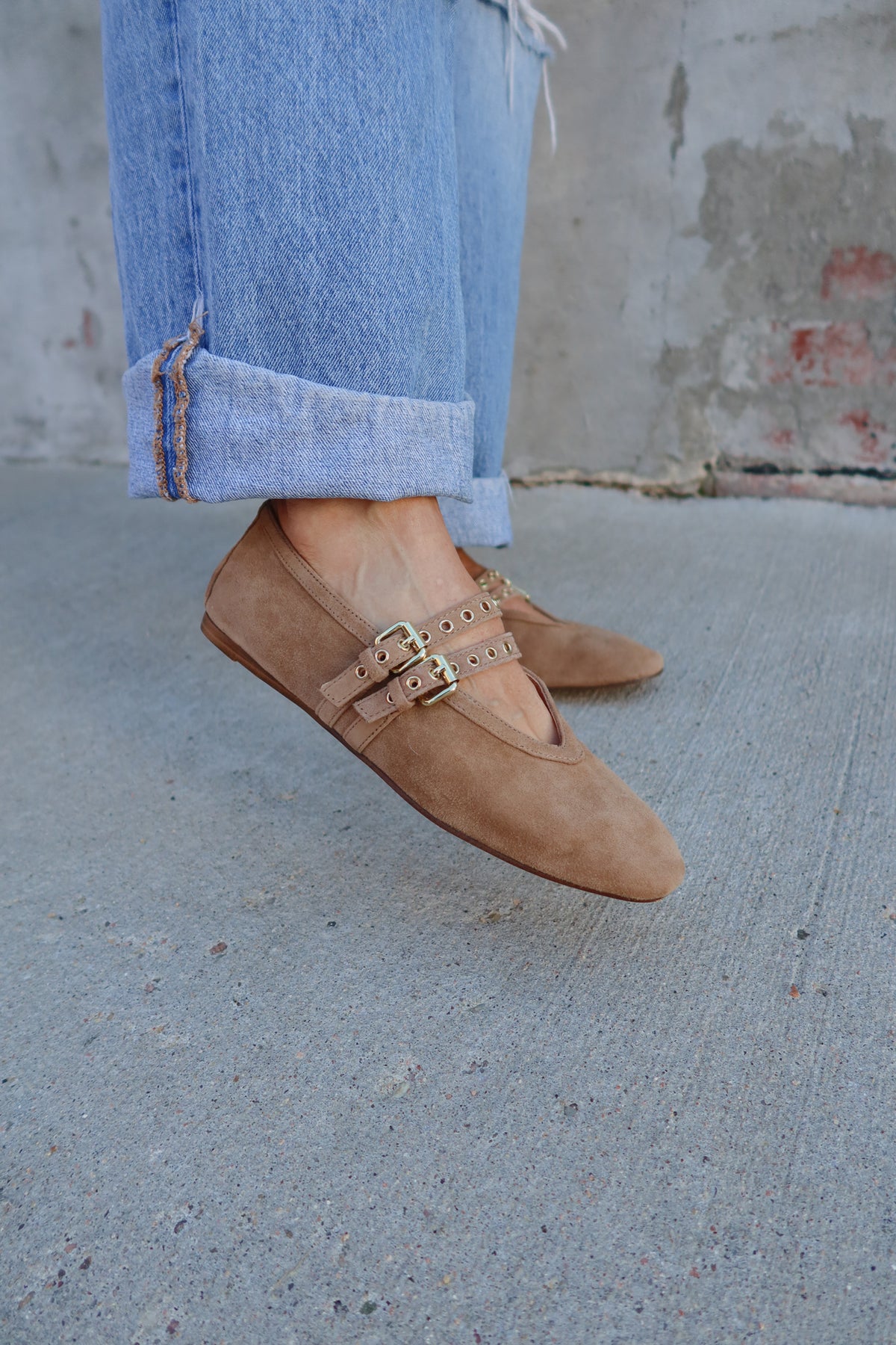 Elevate your wardrobe with the Steve Madden Lydia Taupe Ballet Flat, crafted from soft suede for a luxurious feel. Featuring elegant gold metal detailing, this versatile flat seamlessly transitions from professional settings to casual outings. Comfortable yet chic, it’s the perfect choice to enhance your everyday style with a subtle touch of sophistication.