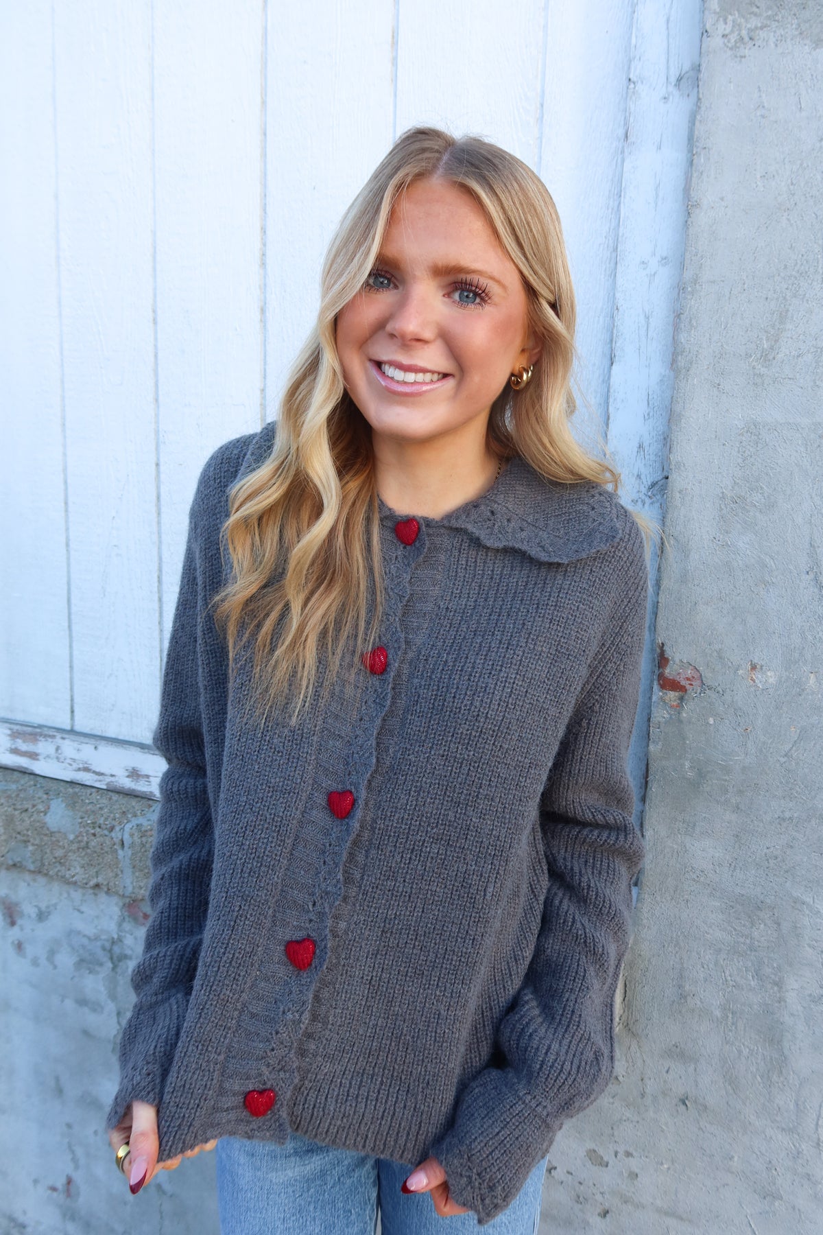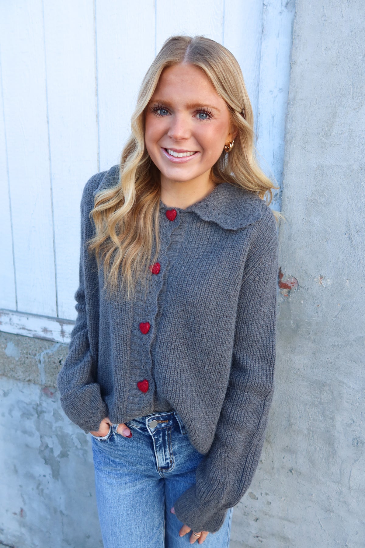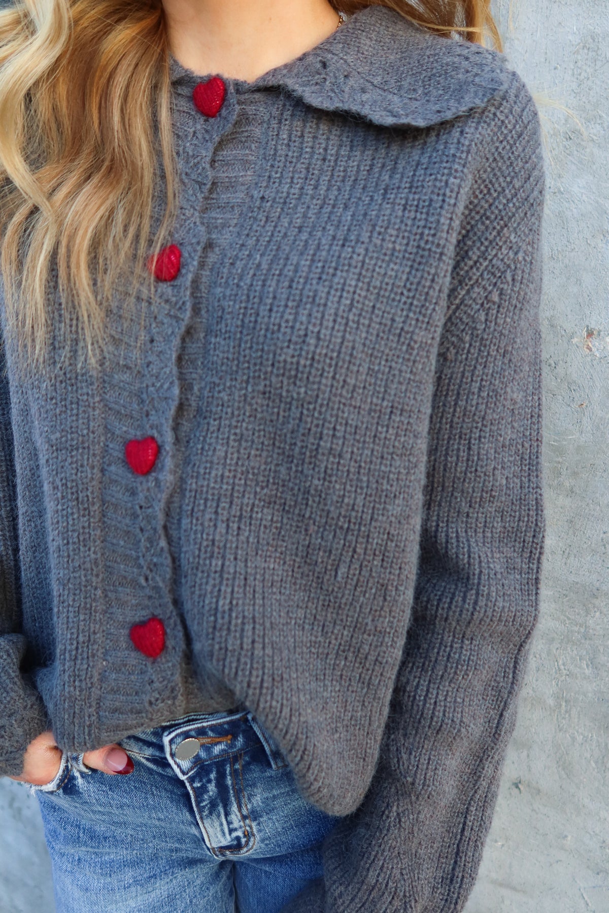 Elevate your everyday wardrobe with this charming charcoal knit cardigan, featuring delicate heart button details that add a touch of personality to any outfit. Crafted from soft, quality knit fabric, this button-down sweater offers the perfect balance of comfort and style for layering over your favorite pieces. Whether you're dressing up for the office or keeping it casual on the weekend, this versatile cardigan transitions seamlessly from season to season. The timeless charcoal hue pairs effortlessly with virtually everything in your closet, making it an essential investment piece you'll reach for again and again.
