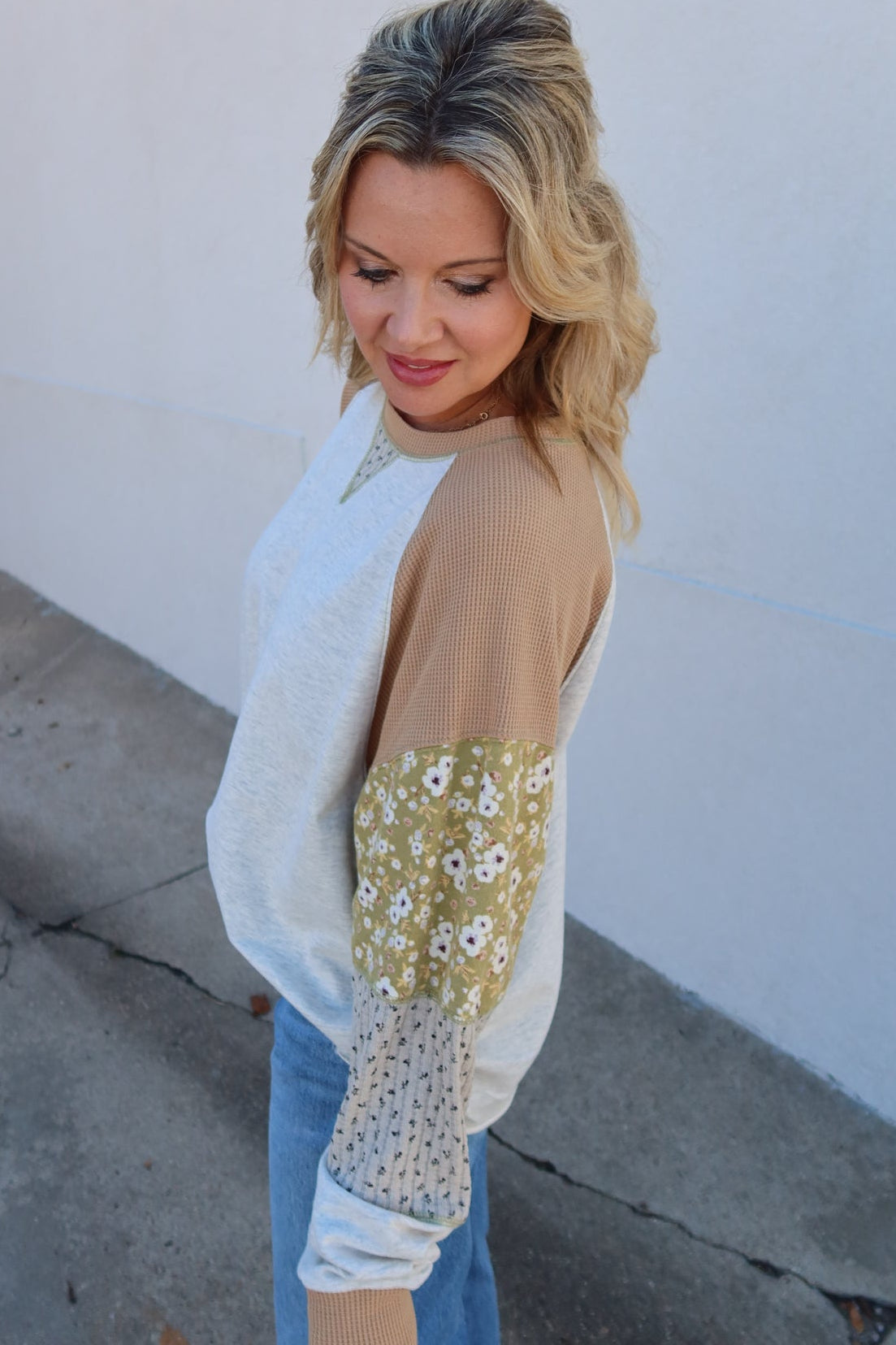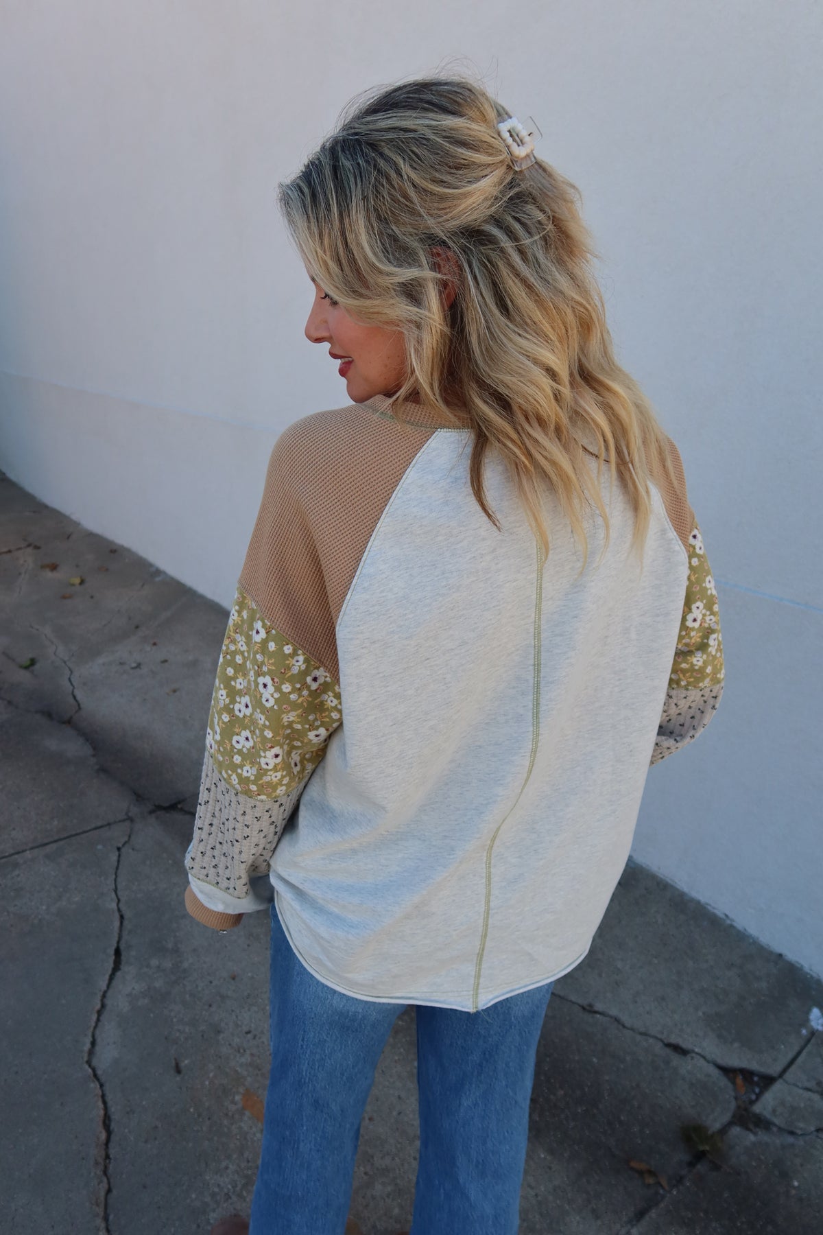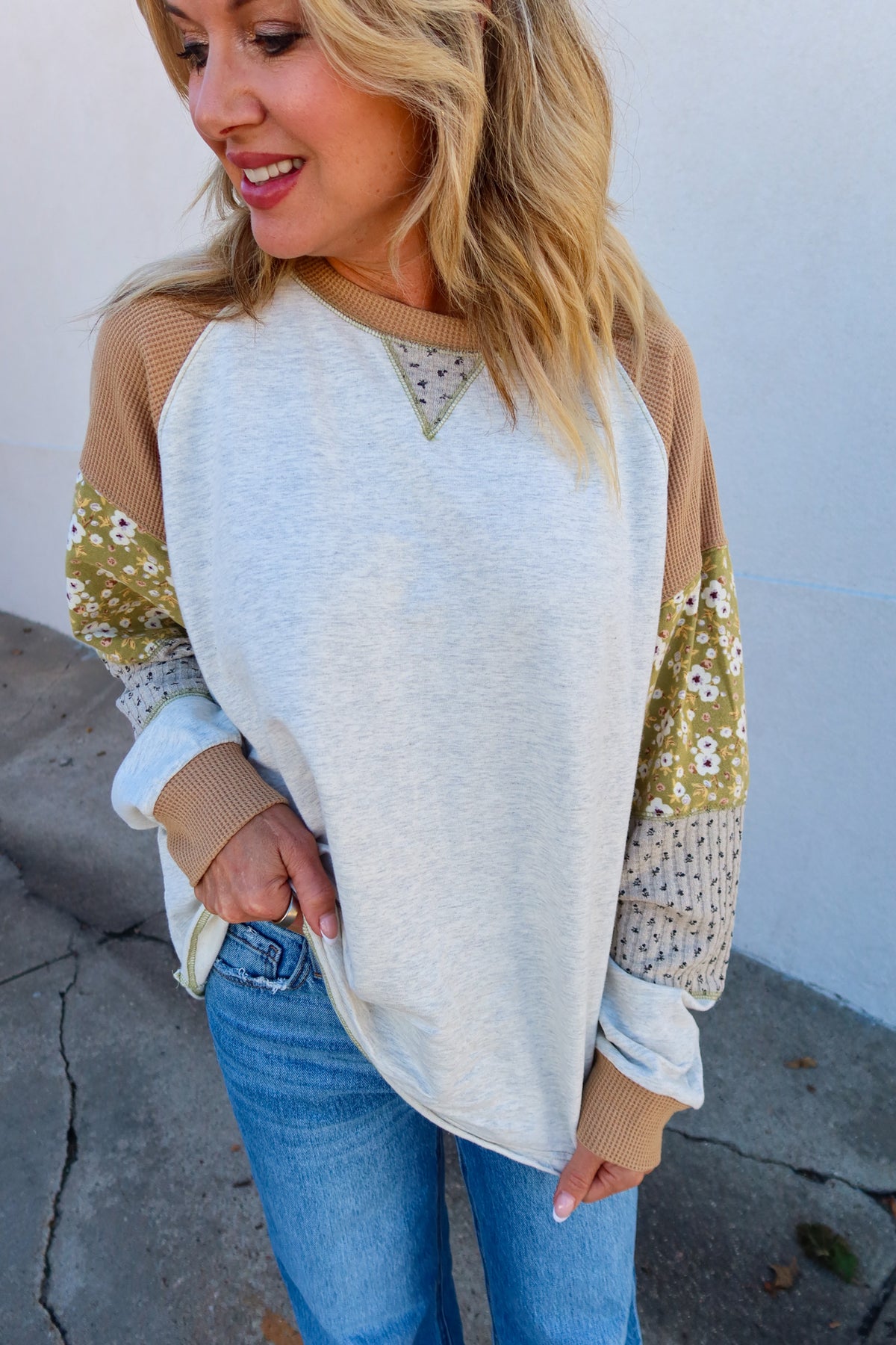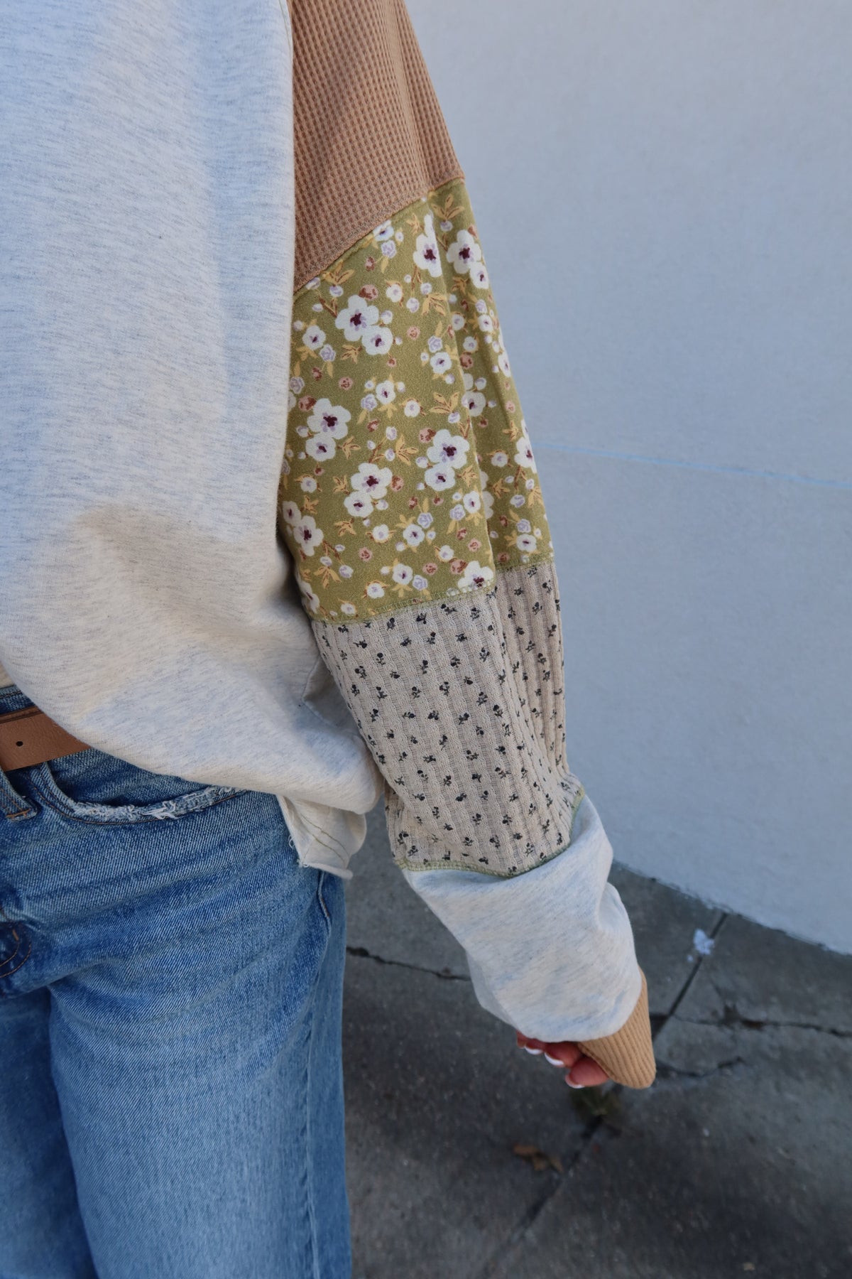 This Heather Grey Patchwork Sleeve Top brings a fresh twist to your casual wardrobe. Featuring unique patchwork detailing on the sleeves, it adds subtle charm to a classic sweatshirt silhouette. Soft and comfortable, it’s perfect for everyday wear, combining style and coziness effortlessly. Elevate your laid-back look with this cute, standout piece.