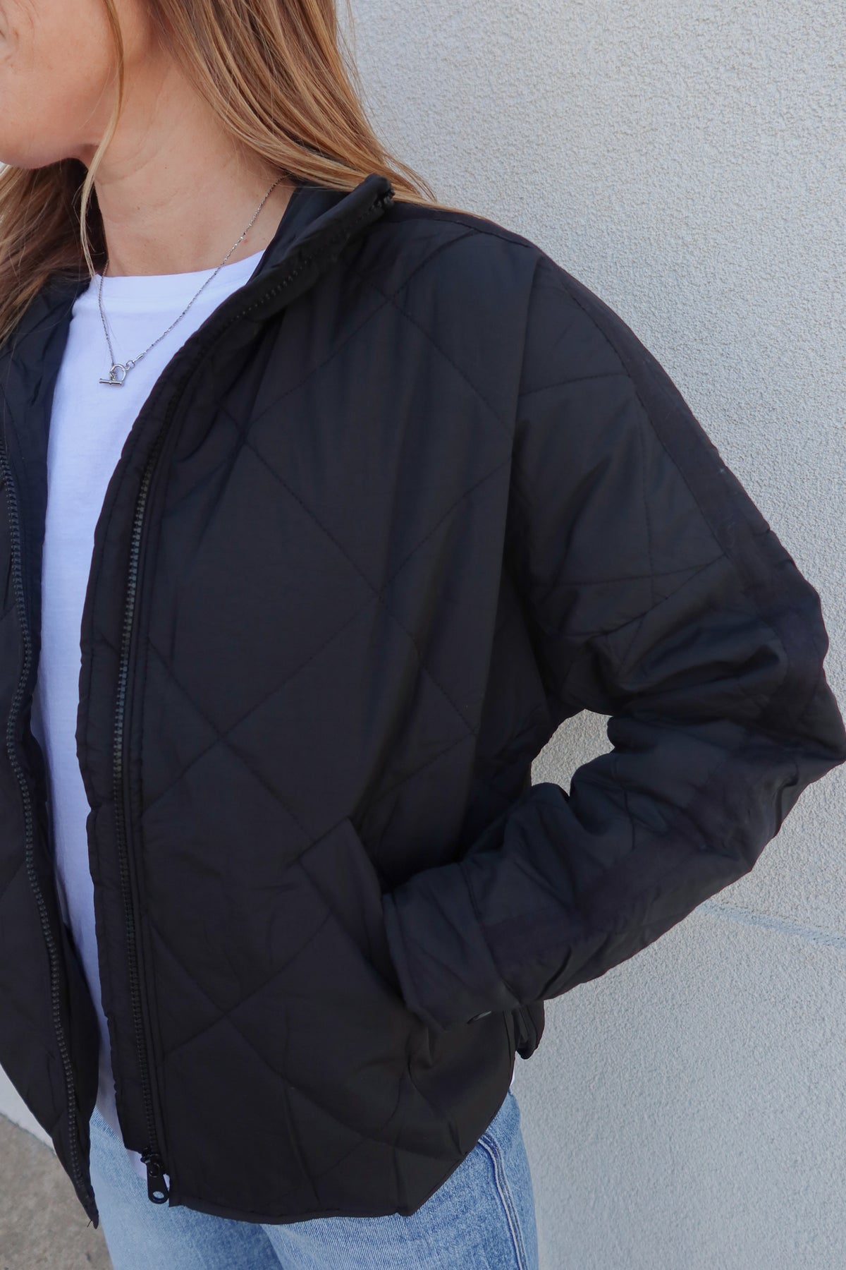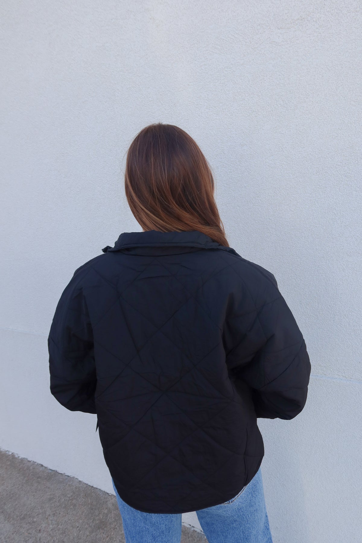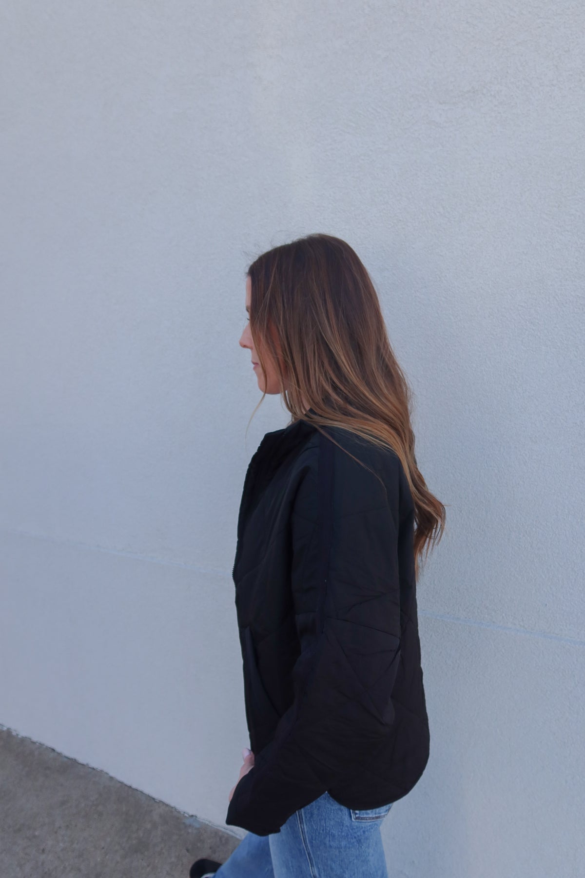 Embrace effortless style with this black quilted jacket designed for those who refuse to compromise on comfort or versatility. The oversized silhouette drapes beautifully over any outfit, while the smooth front zip closure makes layering a breeze. Practical front pockets keep your essentials within reach, whether you're heading to brunch or catching a flight. Perfect for transitional seasons, this jacket pairs seamlessly with everything in your wardrobe and delivers the relaxed sophistication you've been searching for.