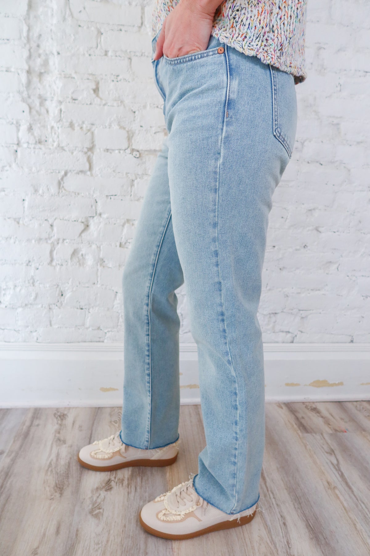 Embrace timeless style with the Tribal Brand Sophia Curvy Straight 90s Denim. Crafted from premium denim, this high-rise straight leg silhouette delivers a structured fit that flatters and supports. The raw edge hem adds contemporary edge, while zip and button closures ensure secure wear. Classic five-pocket detailing completes the design. Perfect for creating effortless, versatile looks that transition seamlessly from day to night.