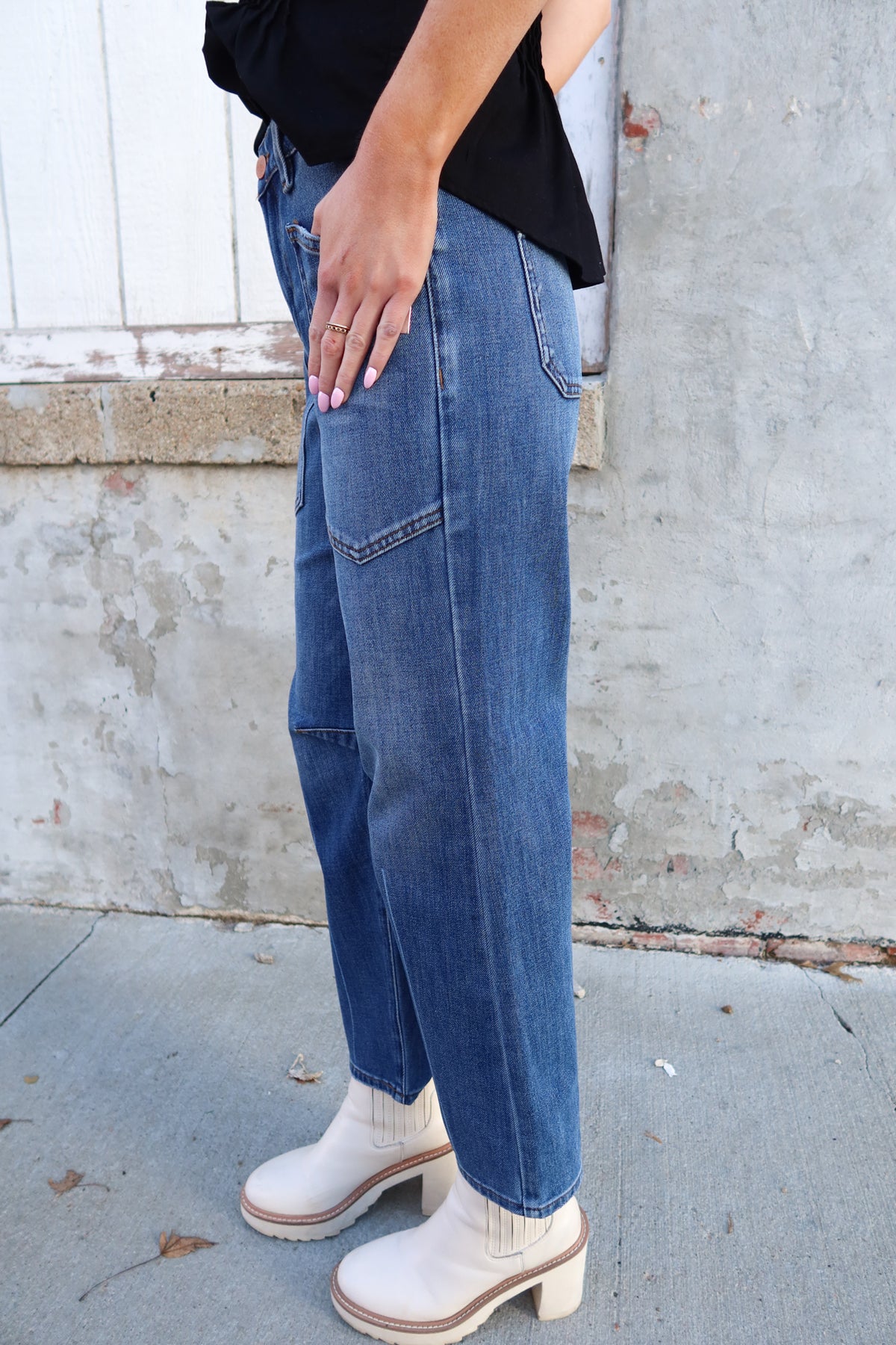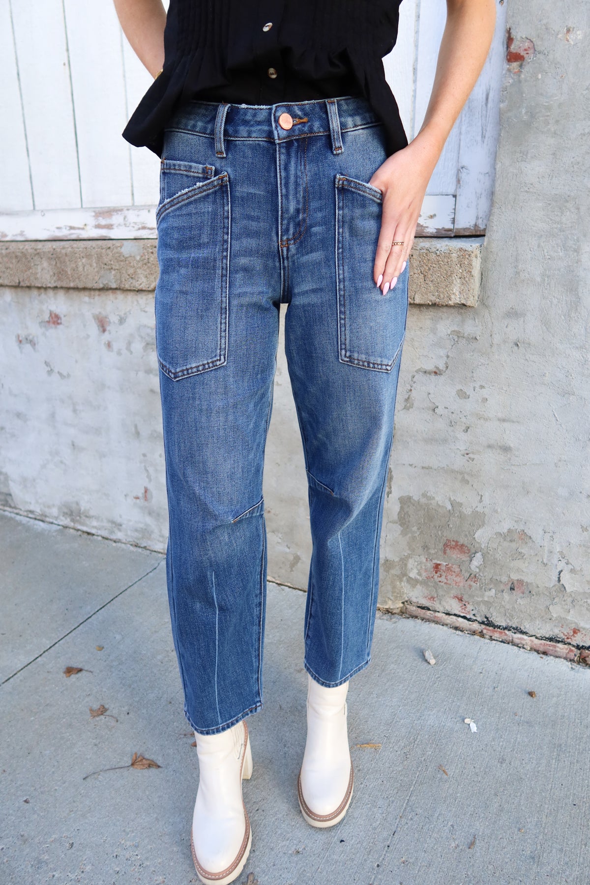 Elevate your everyday style with these Risen Dark Wash Mid Rise Barrel Patch Pocket Jeans. Crafted with a flattering mid-rise fit, these jeans offer the perfect balance of comfort and contemporary edge. The rich dark wash provides versatile styling options, while distinctive barrel patch pockets add a modern design detail that sets them apart. Whether you're dressing up for a night out or keeping it casual, these jeans deliver the quality construction and on-trend silhouette you've been searching for. A wardrobe essential that works as hard as you do.