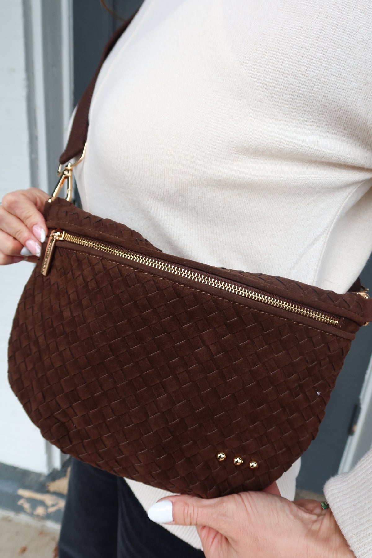 Elevate your everyday carry with the Chocolate Suede Westlyn Woven Bum Bag—a sophisticated blend of luxury and practicality. Crafted from buttery soft suede, this crossbody style features intricate woven detailing that adds visual depth and artisanal charm. The adjustable strap sits comfortably across your body, keeping essentials within reach while your hands stay free. Perfect for weekend outings, travel, or effortless transitions from day to night, this versatile piece combines timeless elegance with modern functionality. A wardrobe essential that proves style and convenience go hand in hand.