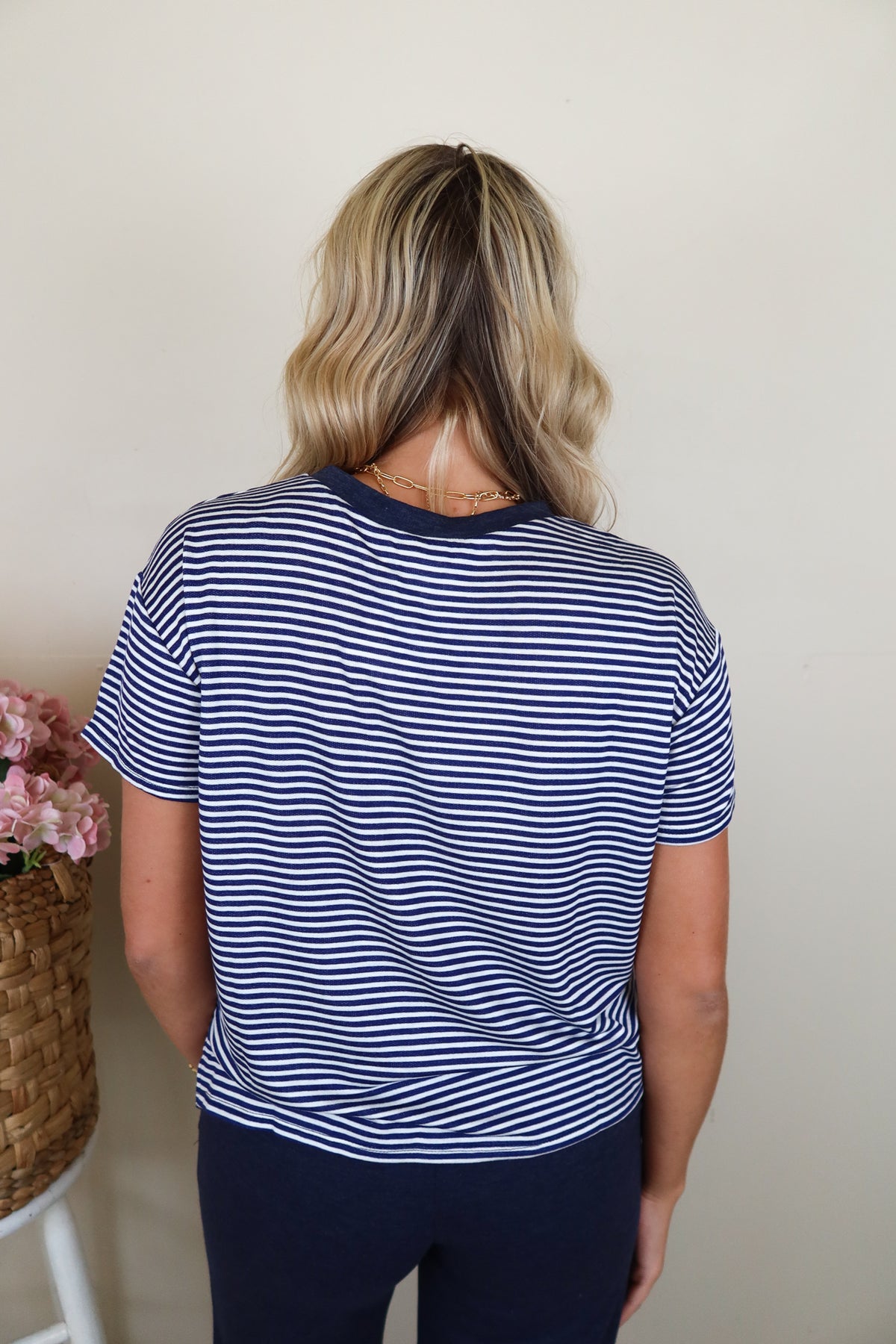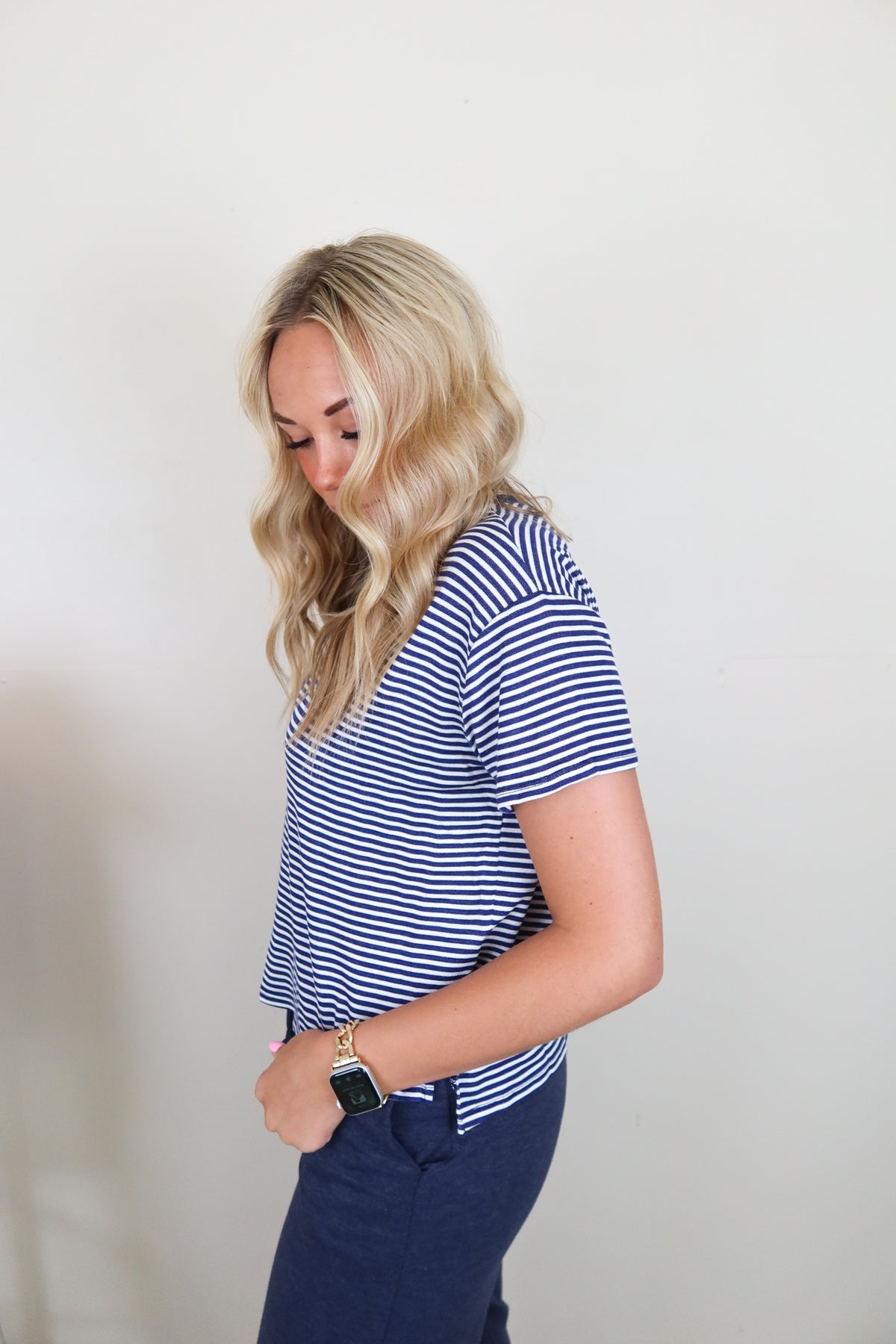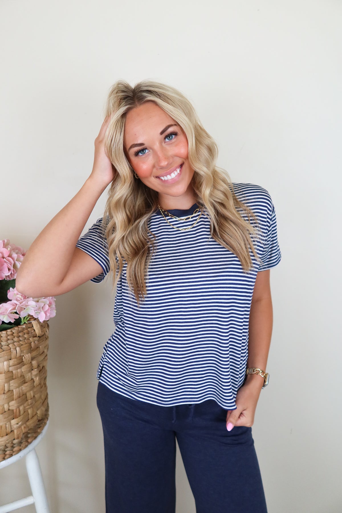 Elevate your casual wardrobe with the Travel Life White and Navy Stripe Top. Featuring a classic round neck and comfortable short sleeves, this striped top blends timeless style with everyday ease. Perfect for travel or relaxed outings, it offers a fresh, nautical-inspired look that pairs effortlessly with your favorite jeans or shorts. Enjoy comfort and style wherever your journey takes you.