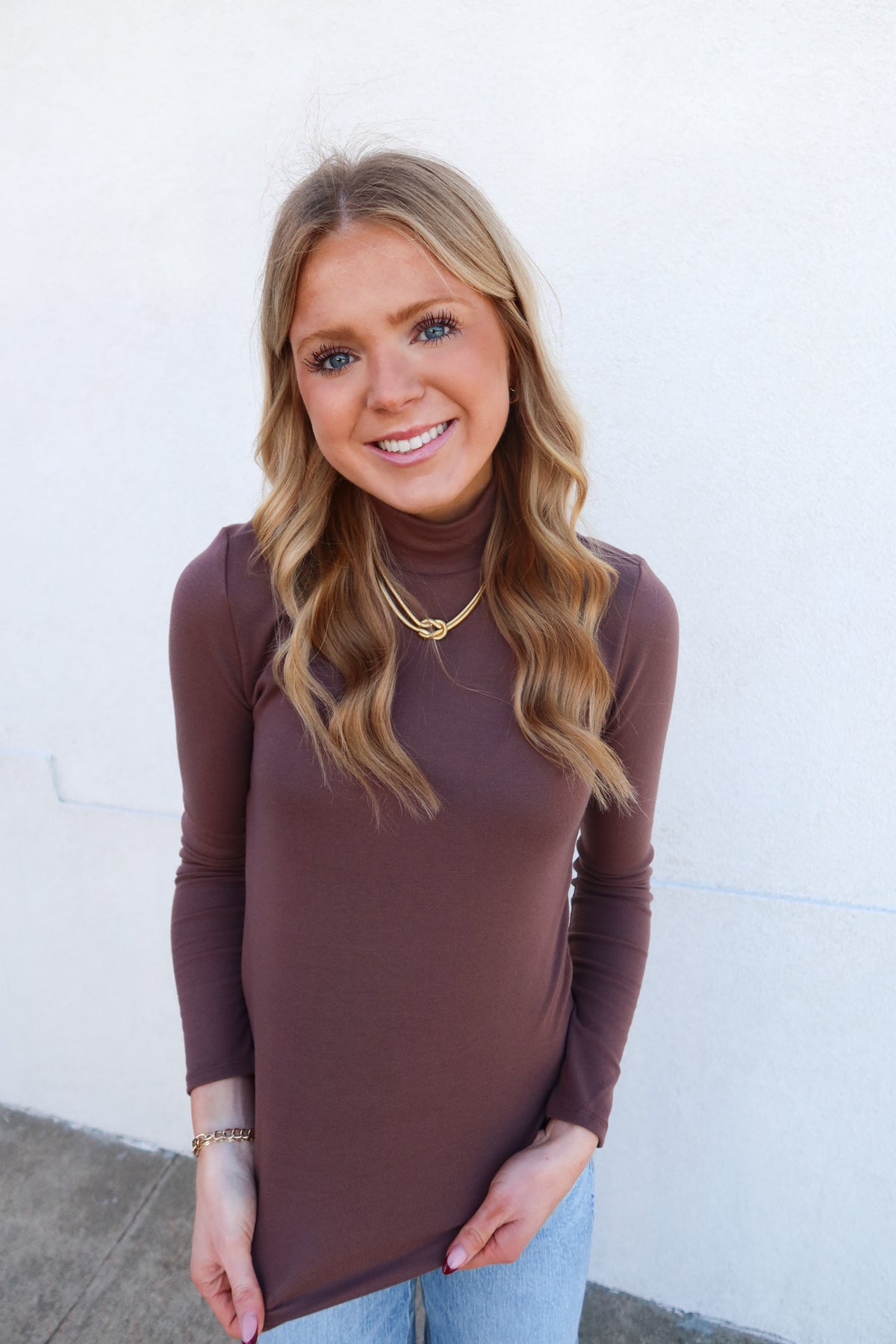Embrace effortless elegance with this Brown Basic Turtle Neck Top. Crafted from soft, lightweight fabric, it drapes beautifully without weighing you down, making it perfect for layering or wearing solo. The classic mock neck design adds a touch of sophistication to any outfit while keeping you comfortable throughout the day. Whether you're dressing up for work or keeping it casual, this versatile staple transitions seamlessly from season to season.
